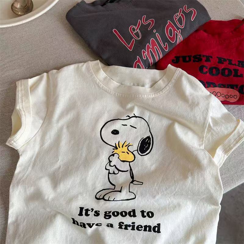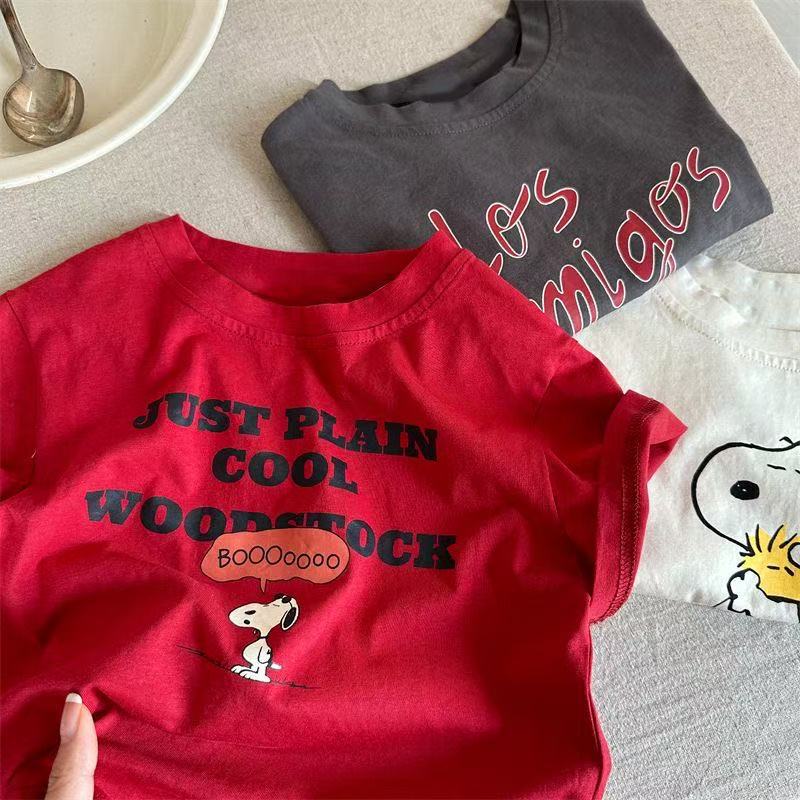 순수 코튼 어린이 반팔 티셔츠 유행 여름 새로운 스타일 만화 스타일 소년과 소녀 라운드 넥 캐주얼 프린트 탑