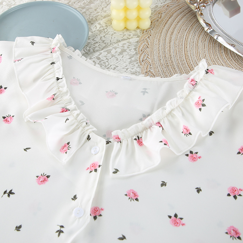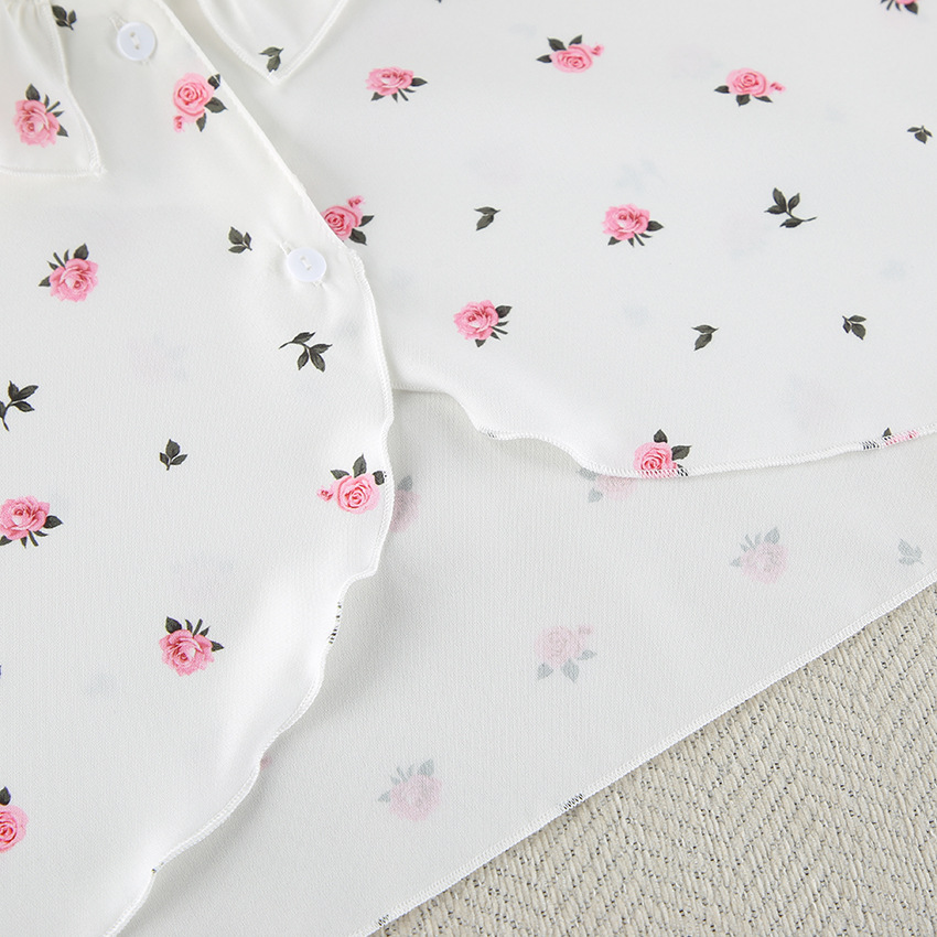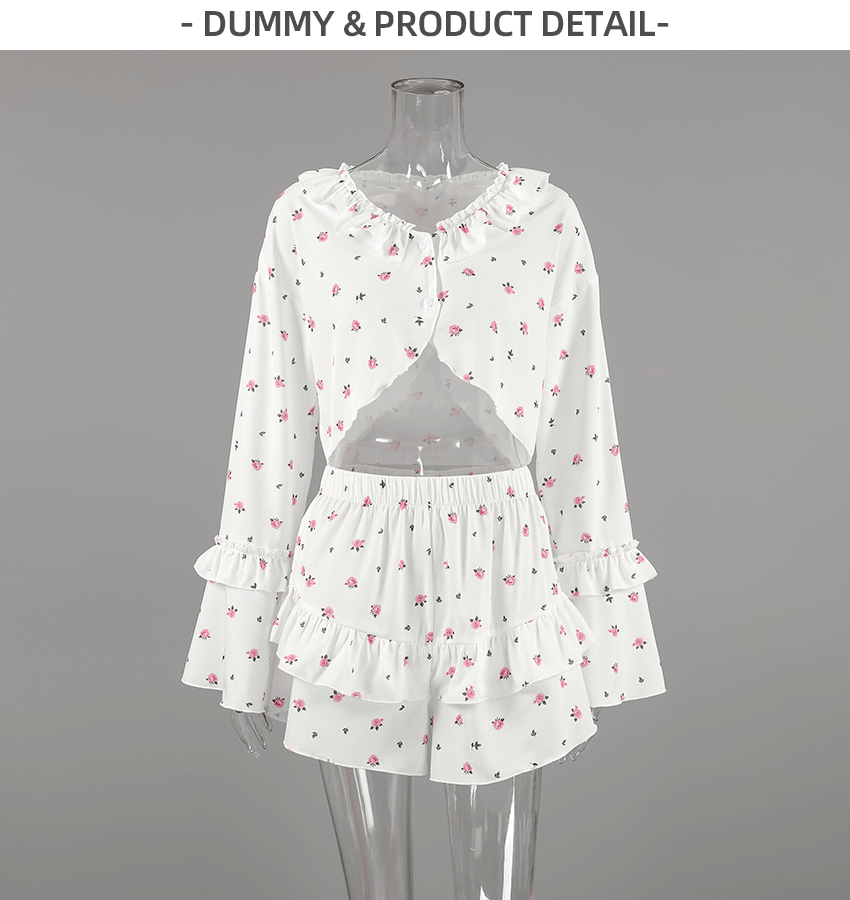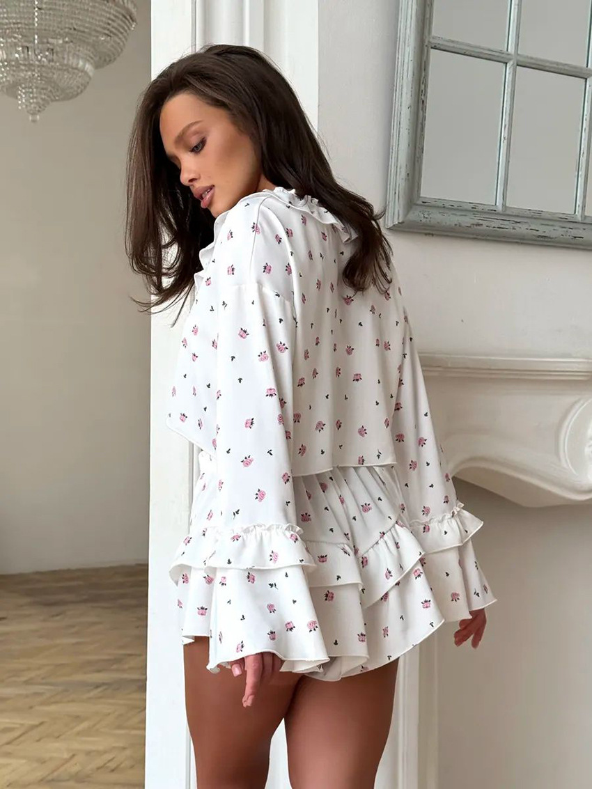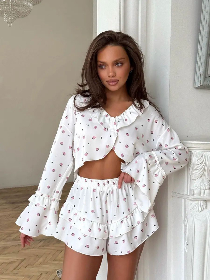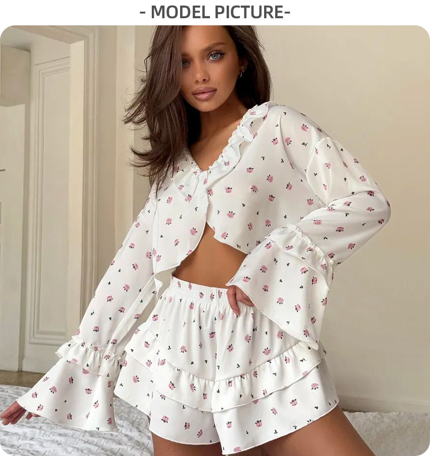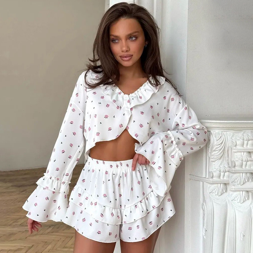 2026 유럽 및 미국 스타일의 하트 프린트, 러플 장식, 편안하고 통기성 좋은 긴팔 반바지 잠옷 세트, 해외 직구, 여성 홈웨어 전용스토어 가기