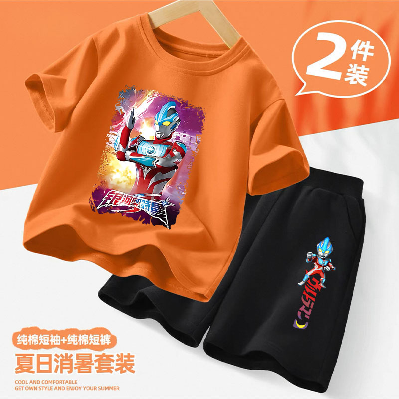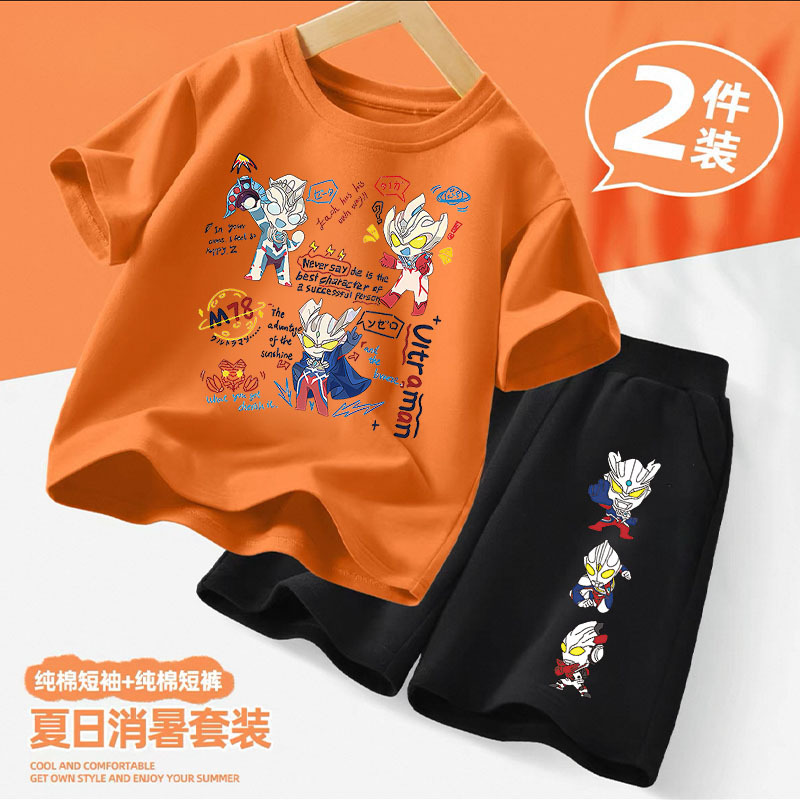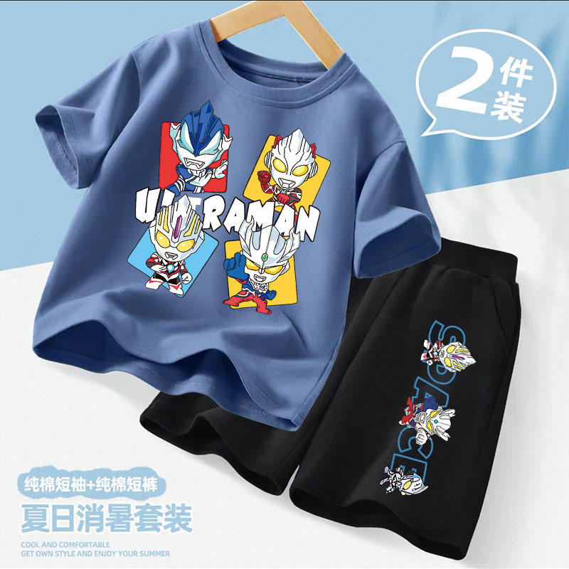 울트라 맨 아동 의류 소년 정장 2025 새로운 여름 순수 면화 반팔 반바지 중형 및 대형 아동용 얇은 여름 옷스토어 가기