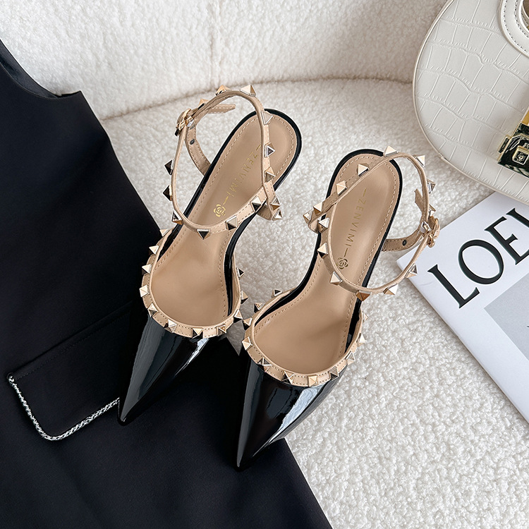 901-15 여름 새로운 유럽과 미국의 리벳 뾰족한 발가락 하이힐 샌들 나이트 클럽 스타일 섹시한 얕은 입 얇은 굽 여성 샌들