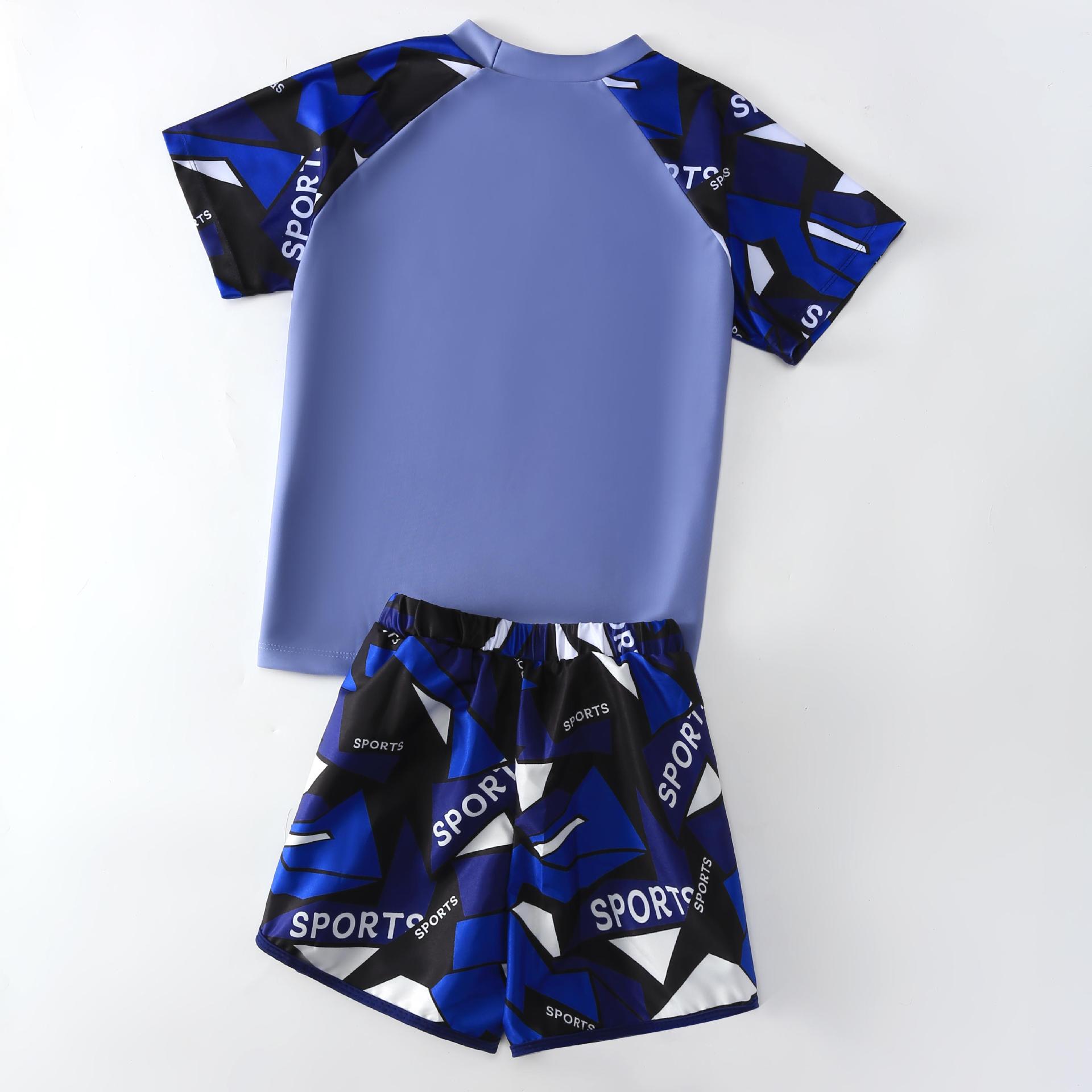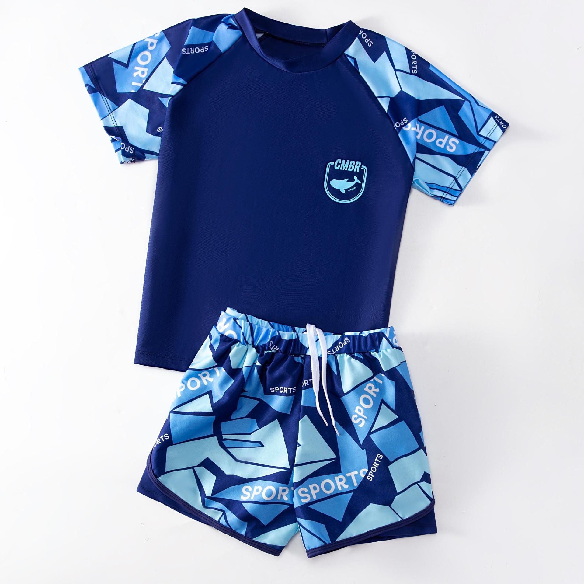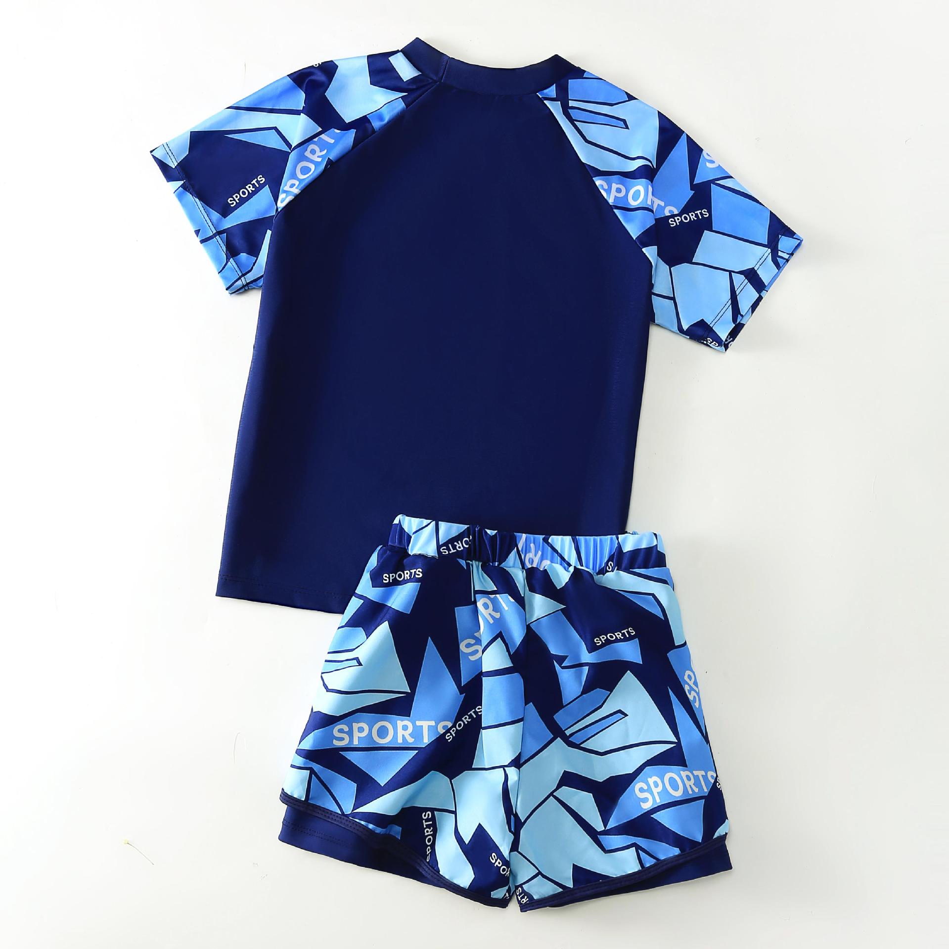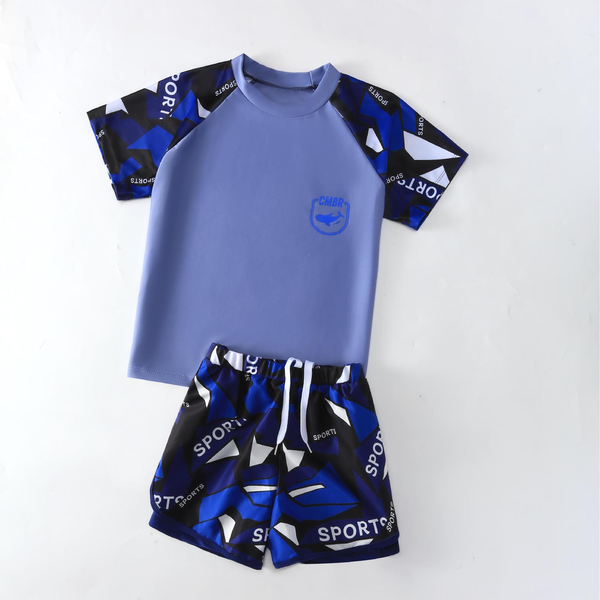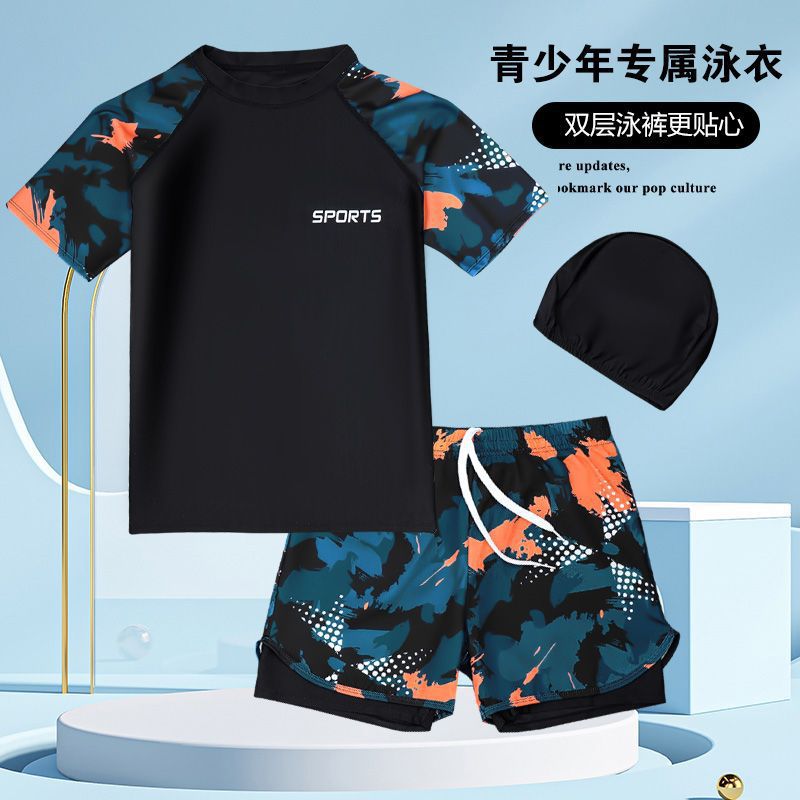 아동용 수영복, 남아용 스플릿 더블 레이어 수영복, 새로운 여름 수영복, 큰 어린이 및 청소년 소년 정장 재고 있음스토어 가기