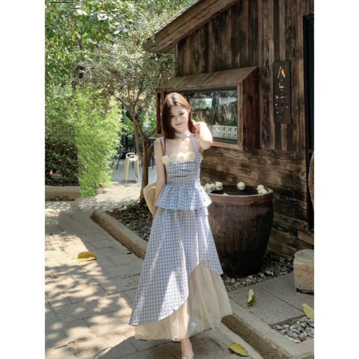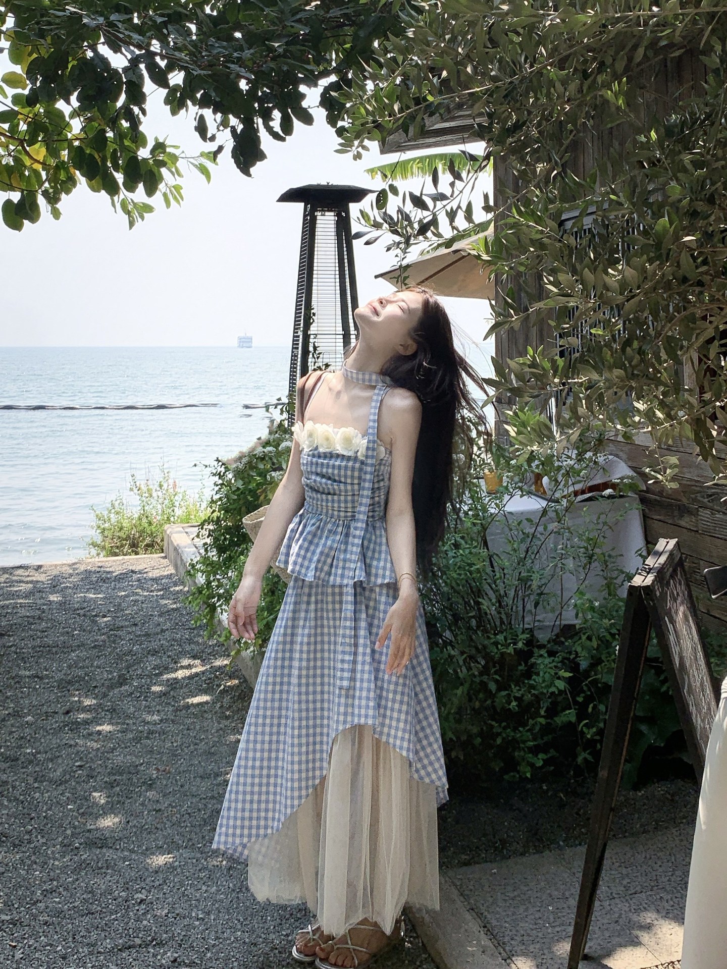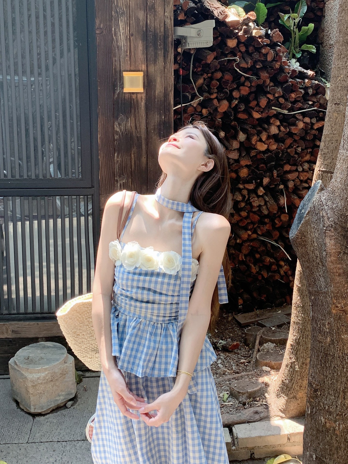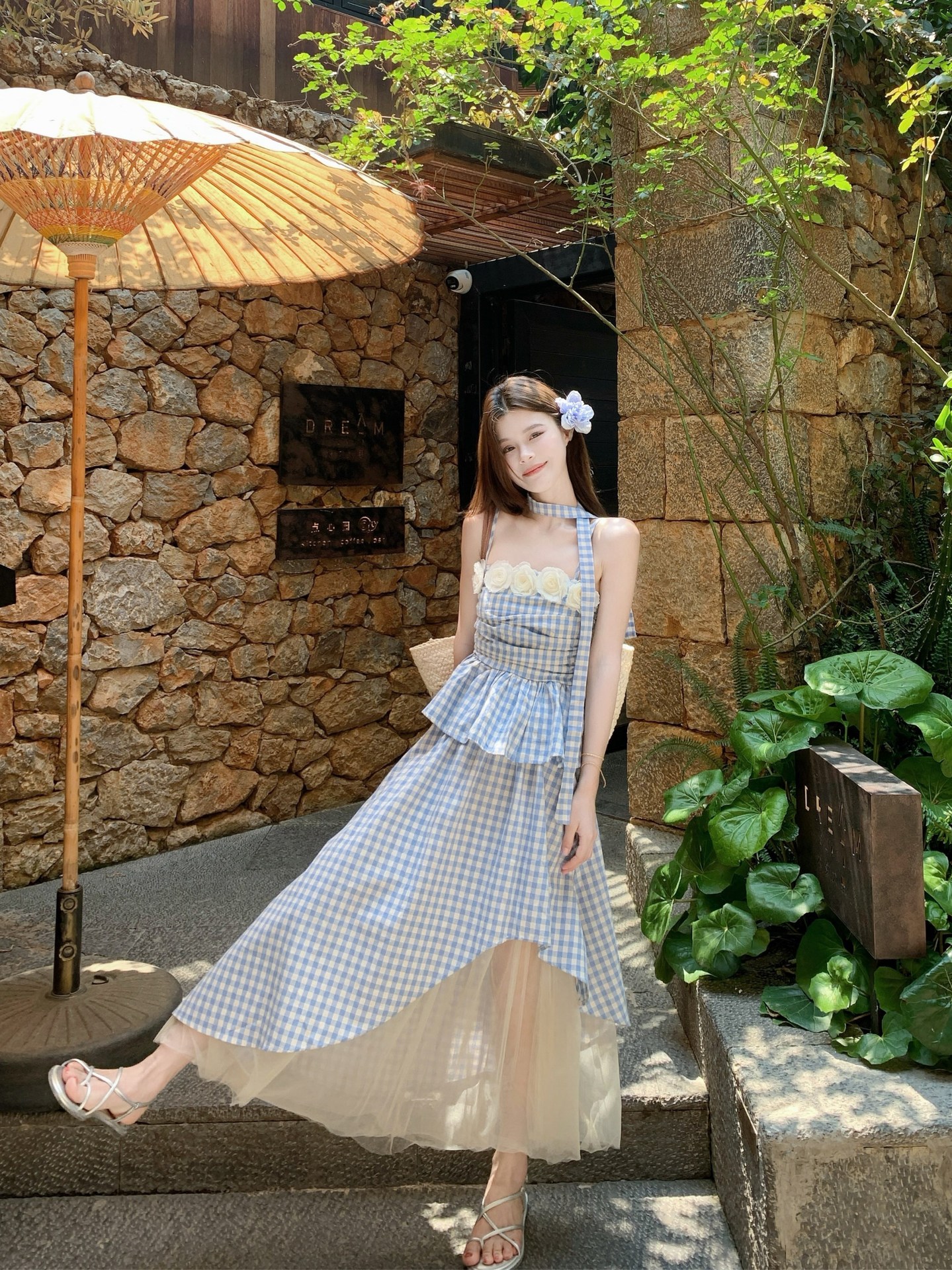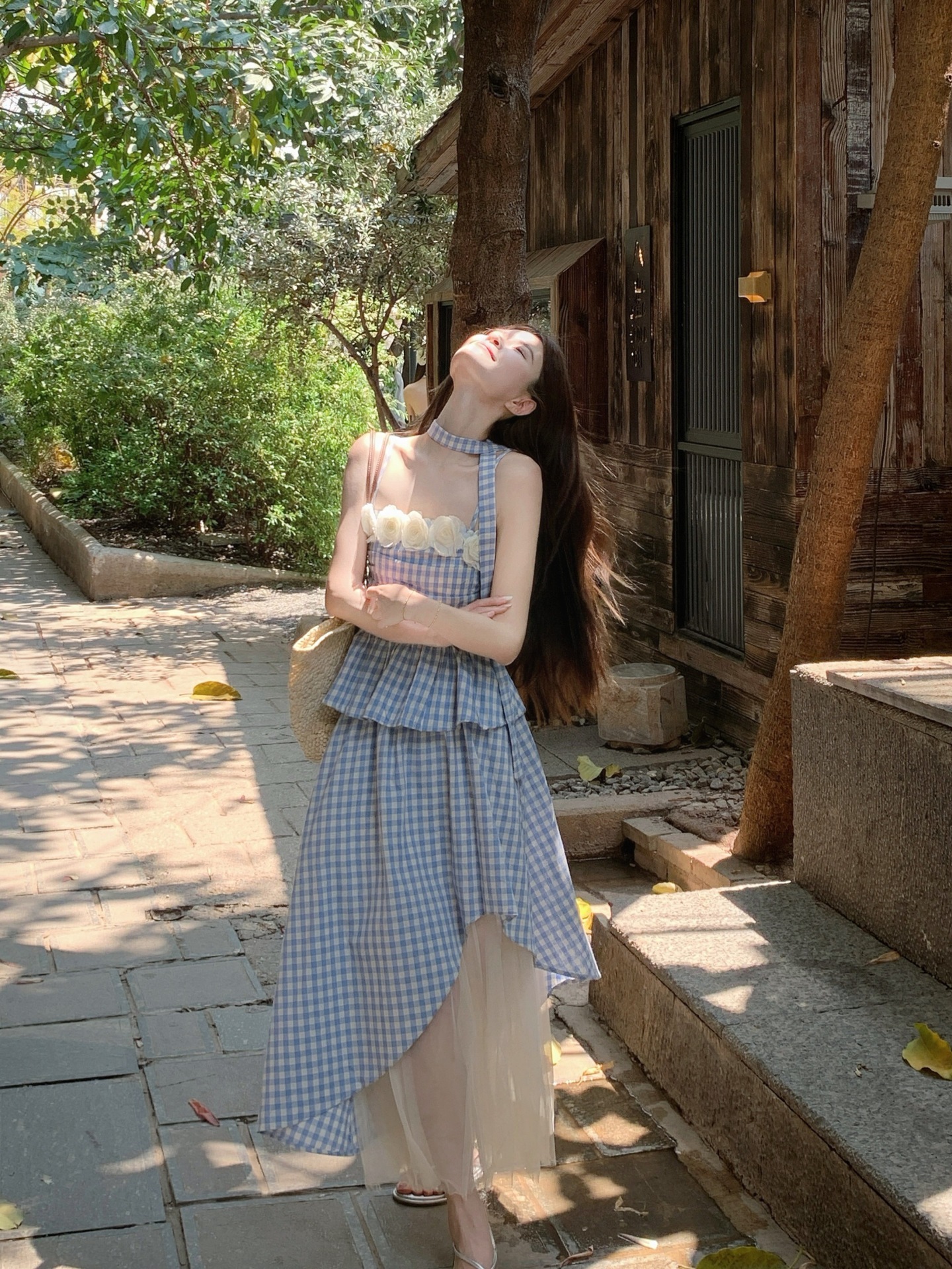 블루 격자 무늬 레이스 튜브 탑 슬링 스커트 여성 여름 태국 스타일 도파민 윈난 해변 휴가 롱 스커트 세트스토어 가기