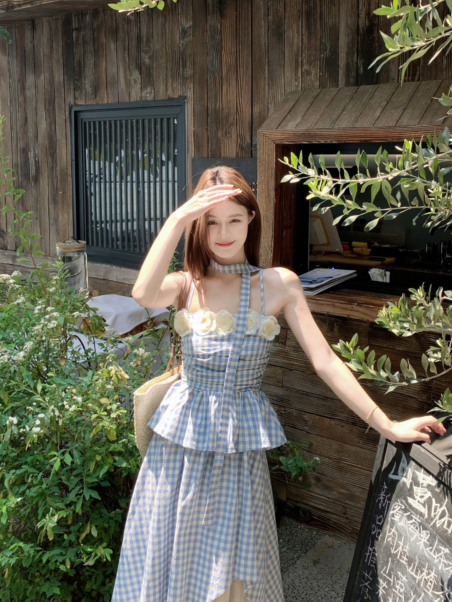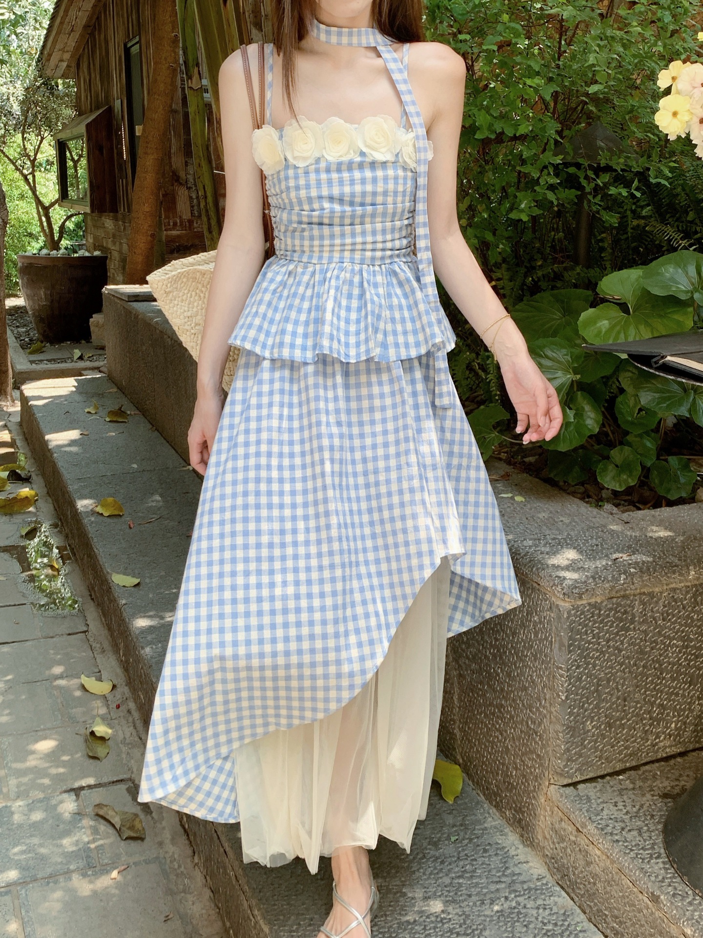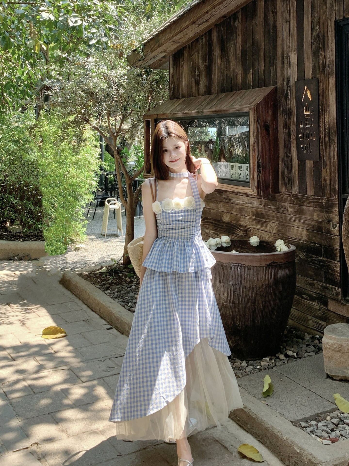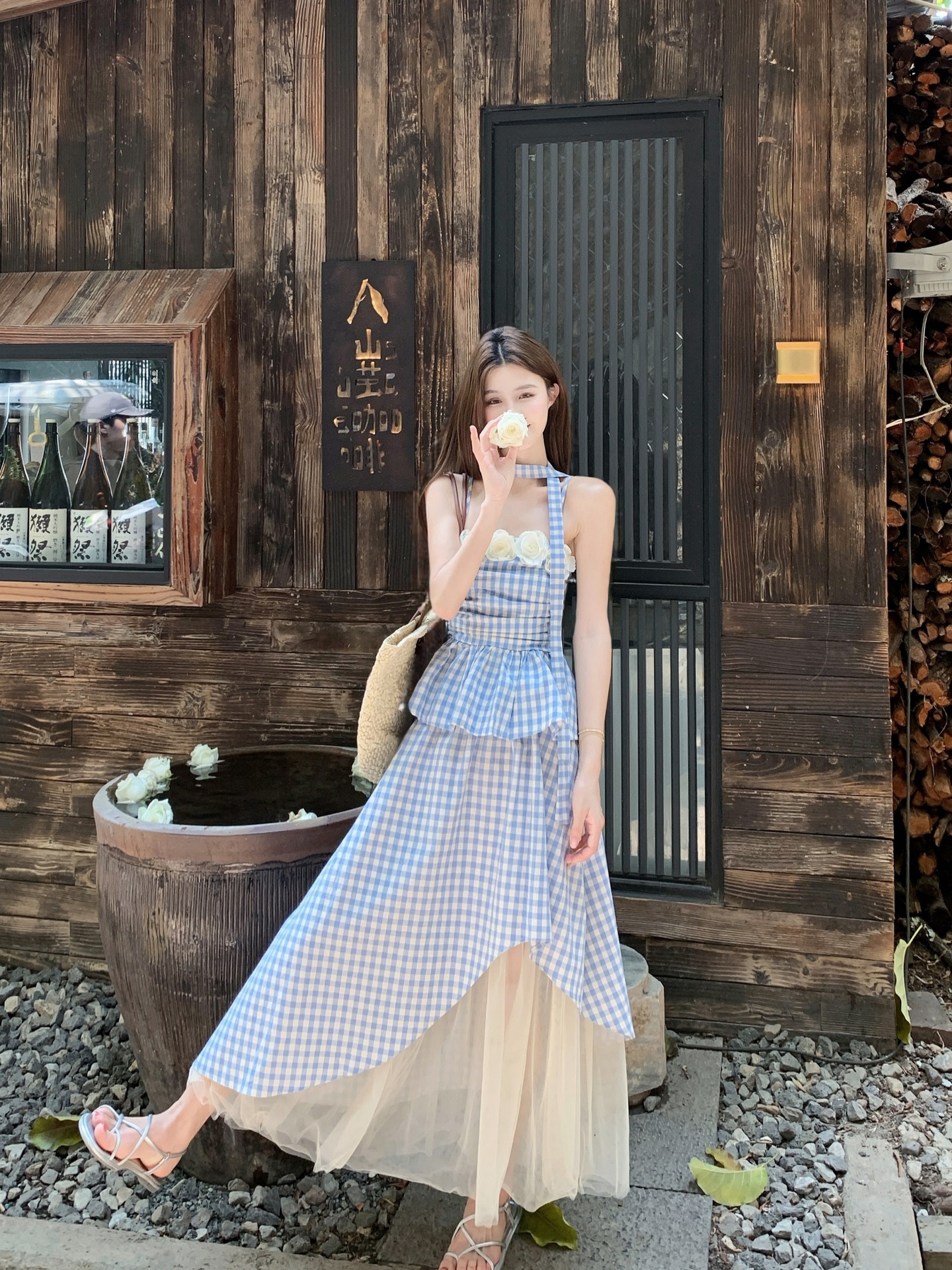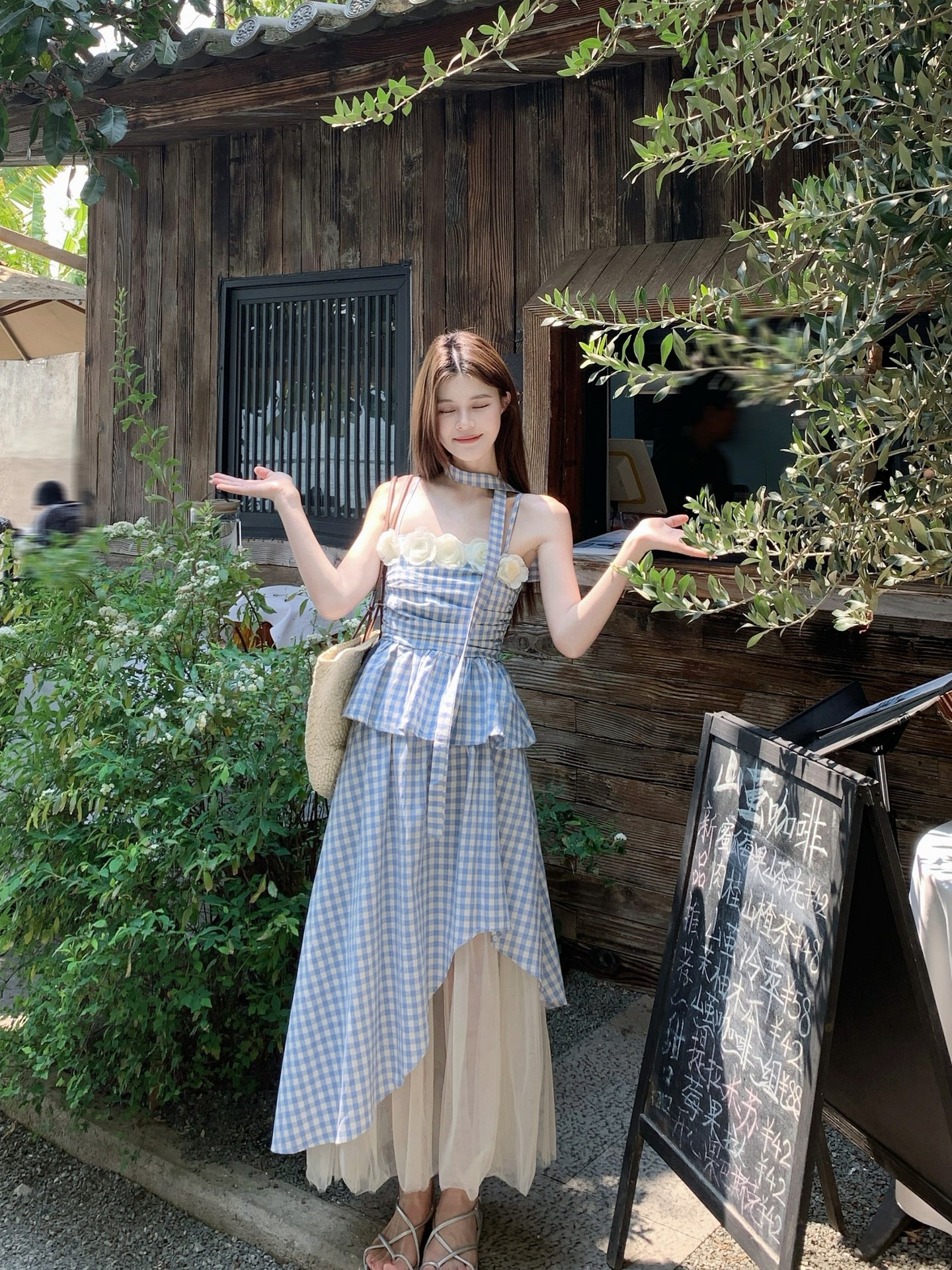 블루 격자 무늬 레이스 튜브 탑 슬링 스커트 여성 여름 태국 스타일 도파민 윈난 해변 휴가 롱 스커트 세트스토어 가기