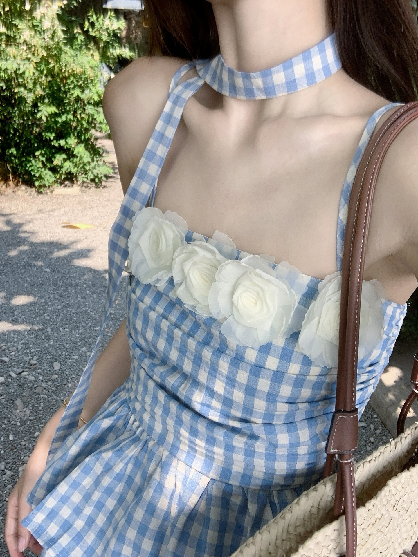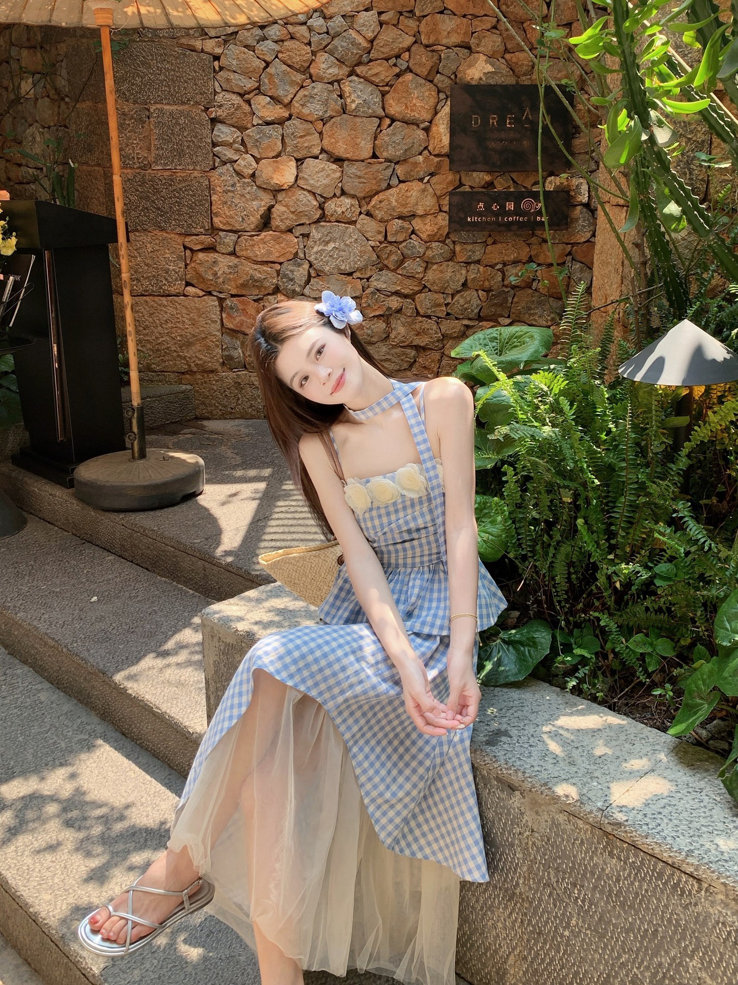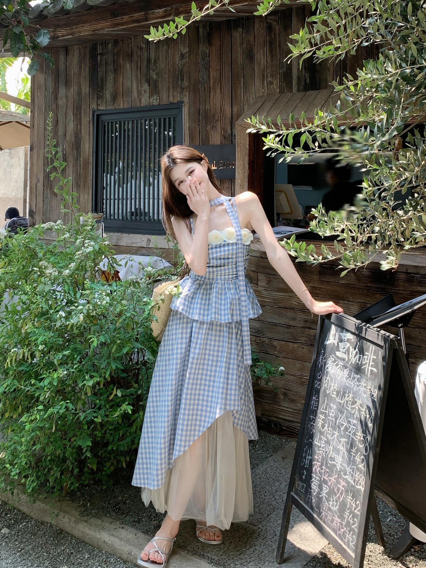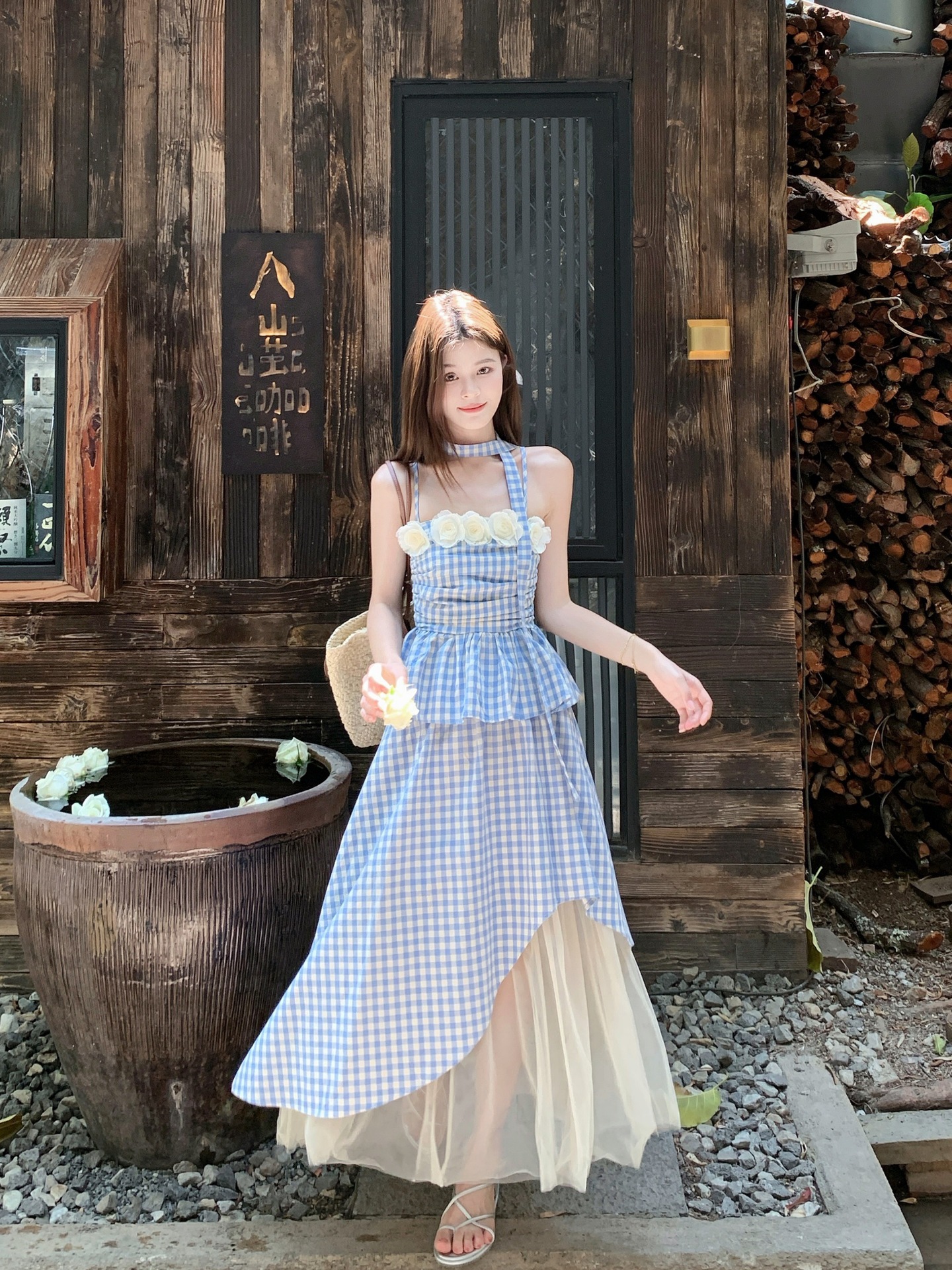 블루 격자 무늬 레이스 튜브 탑 슬링 스커트 여성 여름 태국 스타일 도파민 윈난 해변 휴가 롱 스커트 세트스토어 가기