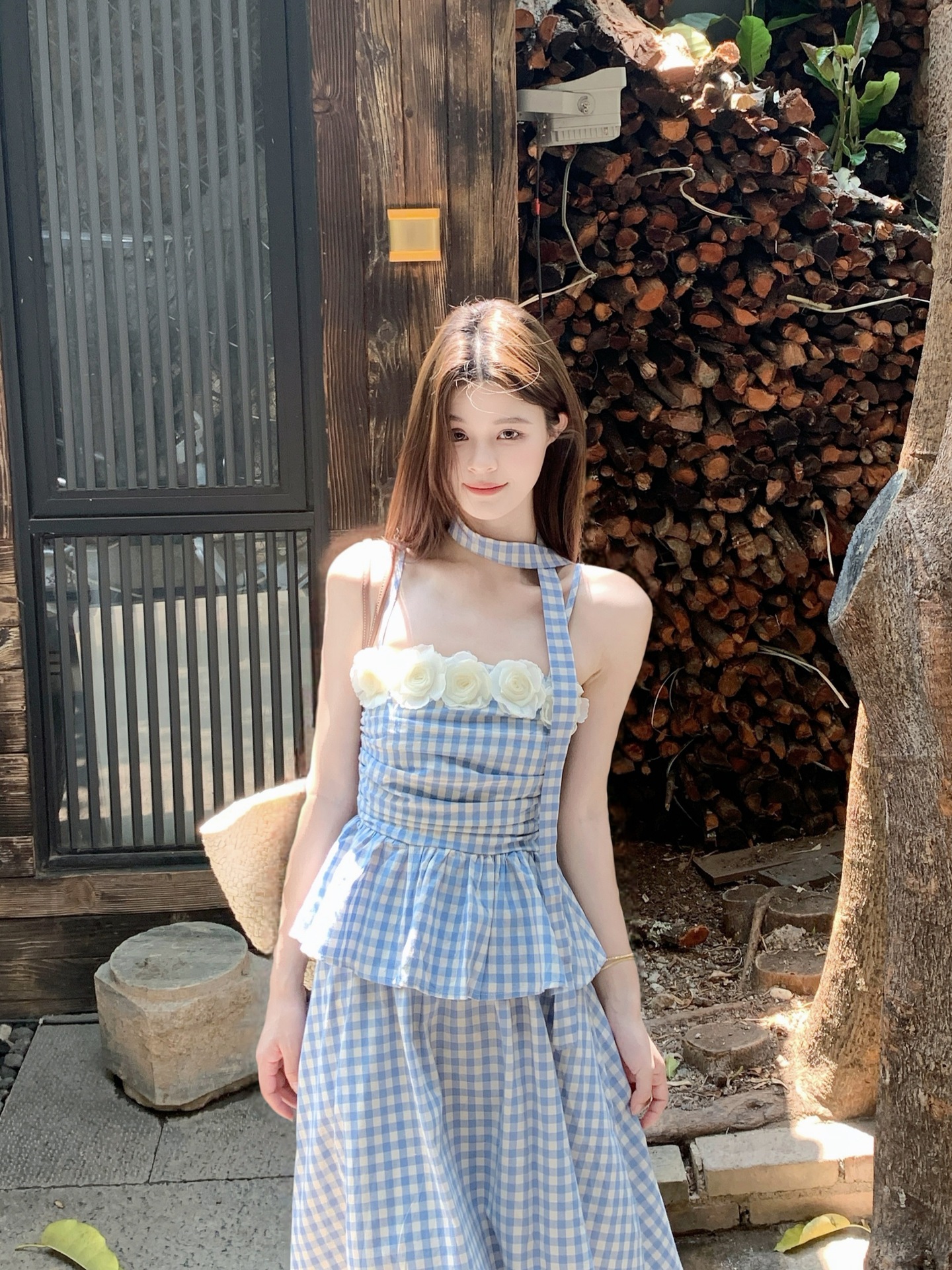 블루 격자 무늬 레이스 튜브 탑 슬링 스커트 여성 여름 태국 스타일 도파민 윈난 해변 휴가 롱 스커트 세트