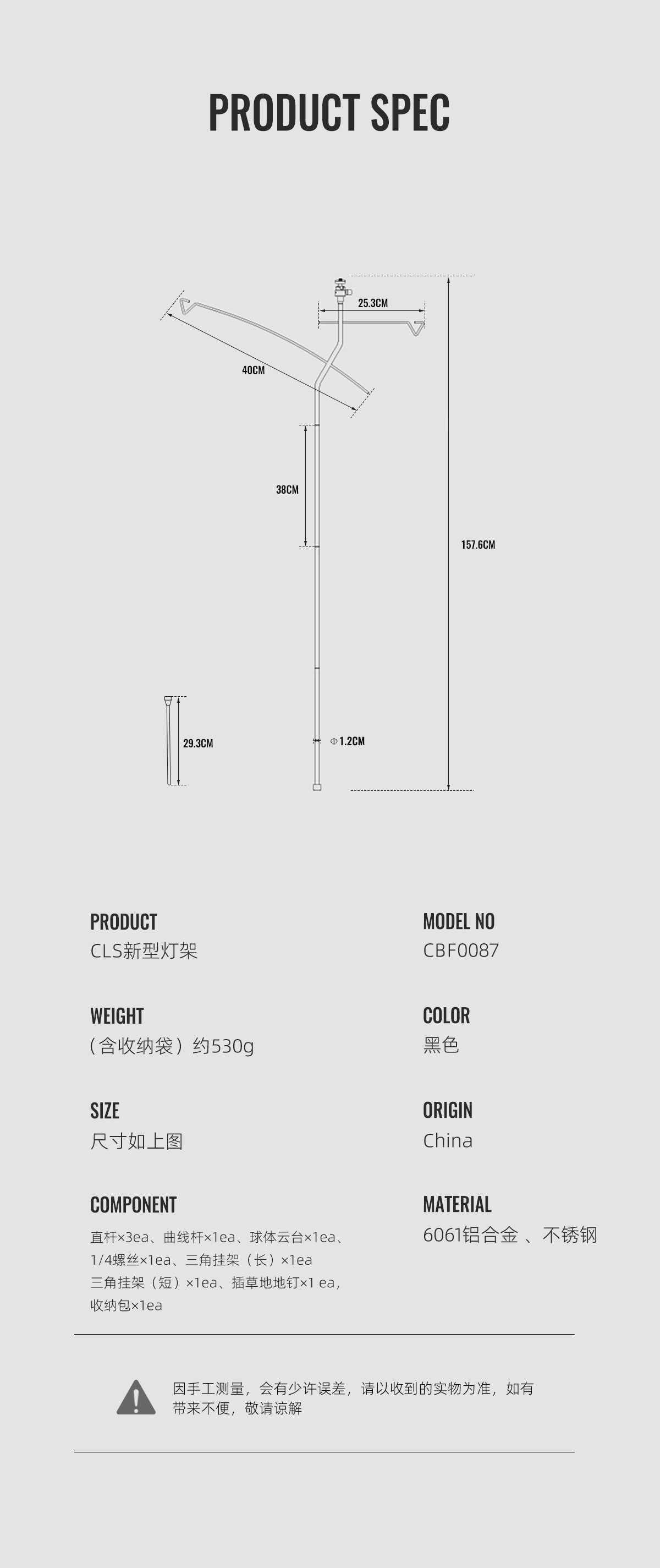 尺 寸:总长157.6cm,地钉-29.3cm,管φ-1.2cm,