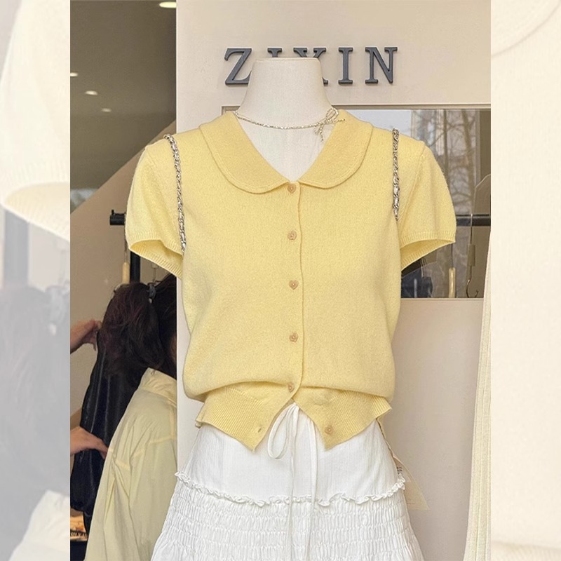 여름 여성을 위한 작은 노란색 짧은 니트 아이스 실크 인형 칼라 반팔 티셔츠, 아름답고 아름다운 오른쪽 어깨 탑