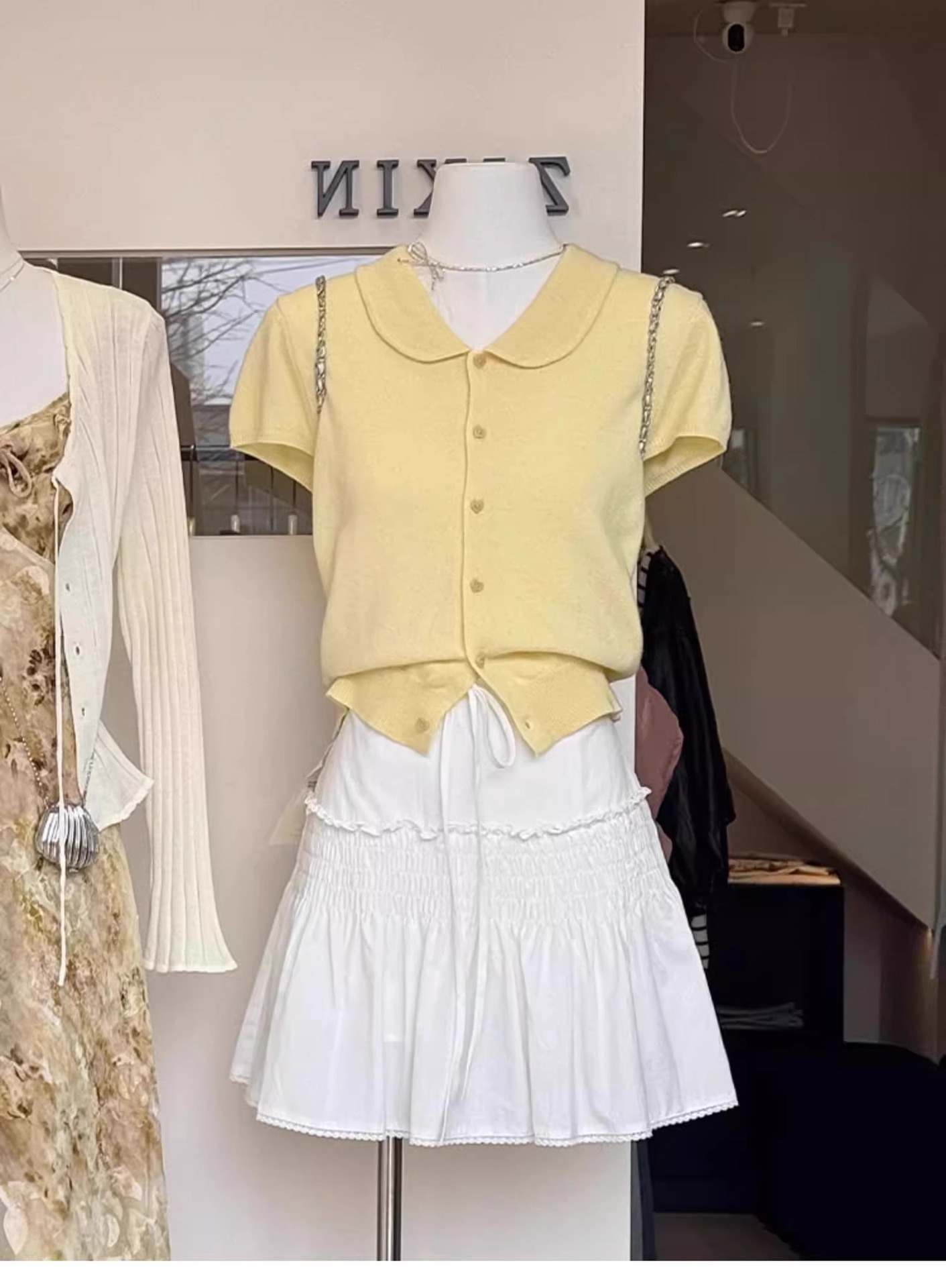 여름 여성을 위한 작은 노란색 짧은 니트 아이스 실크 인형 칼라 반팔 티셔츠, 아름답고 아름다운 오른쪽 어깨 탑스토어 가기