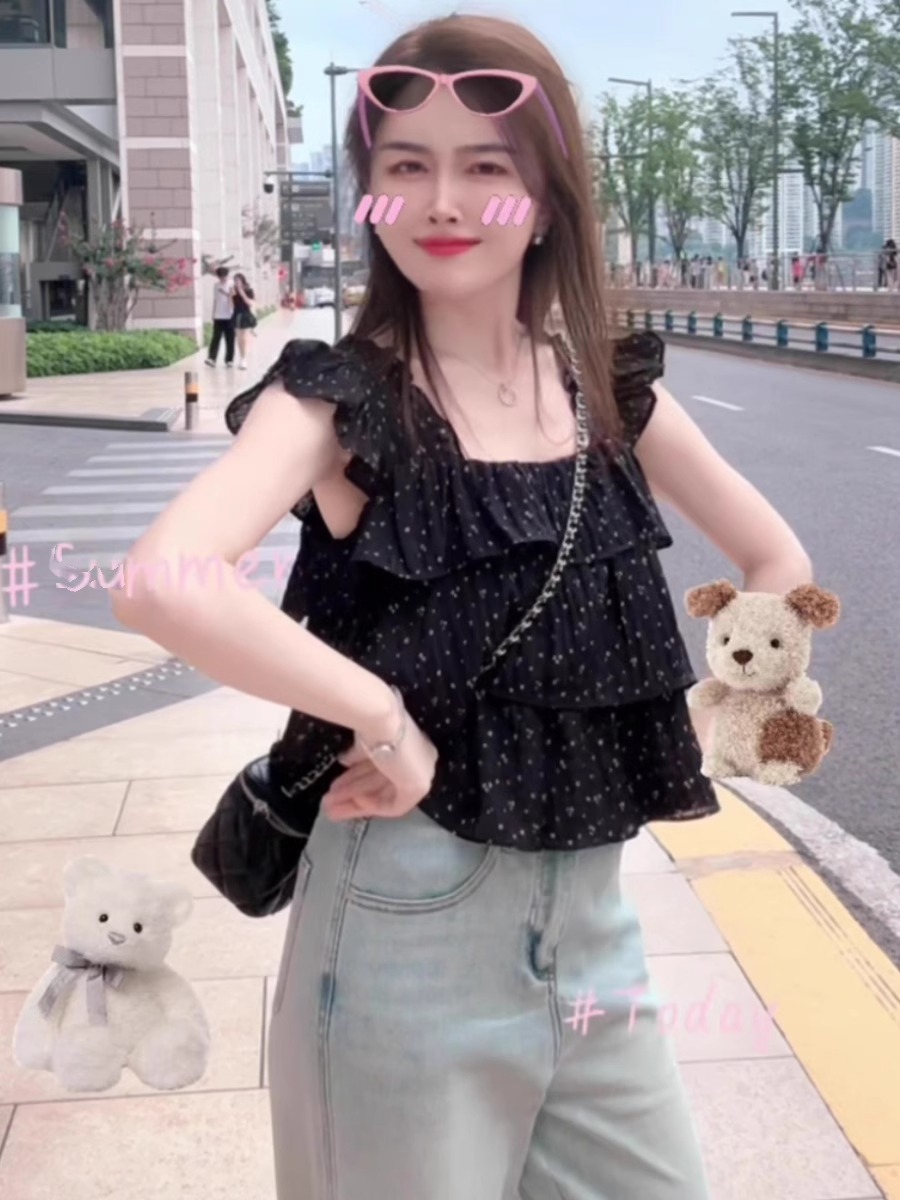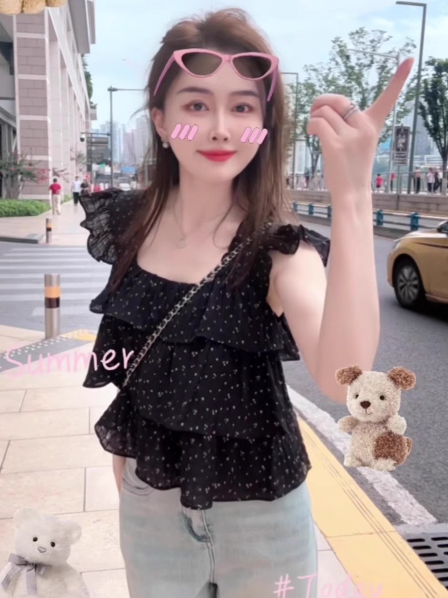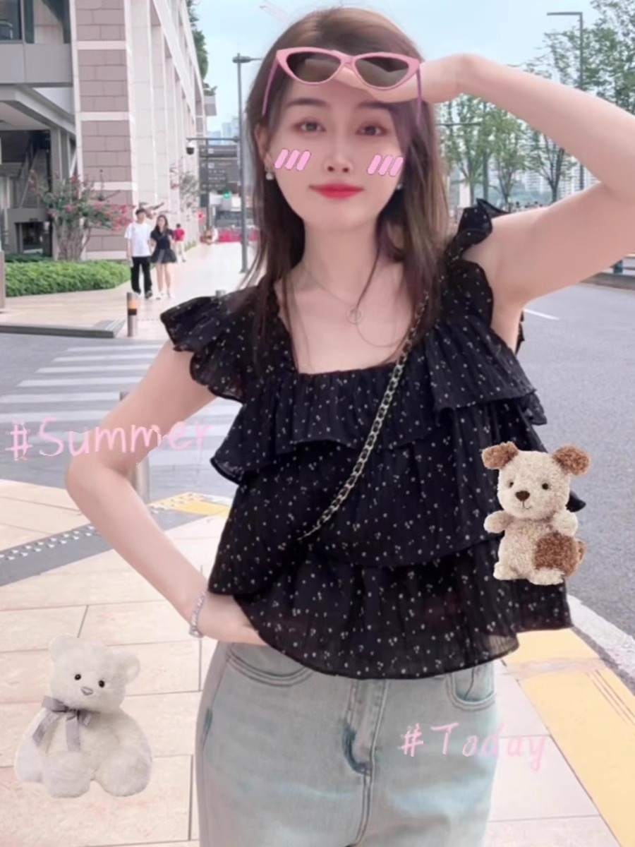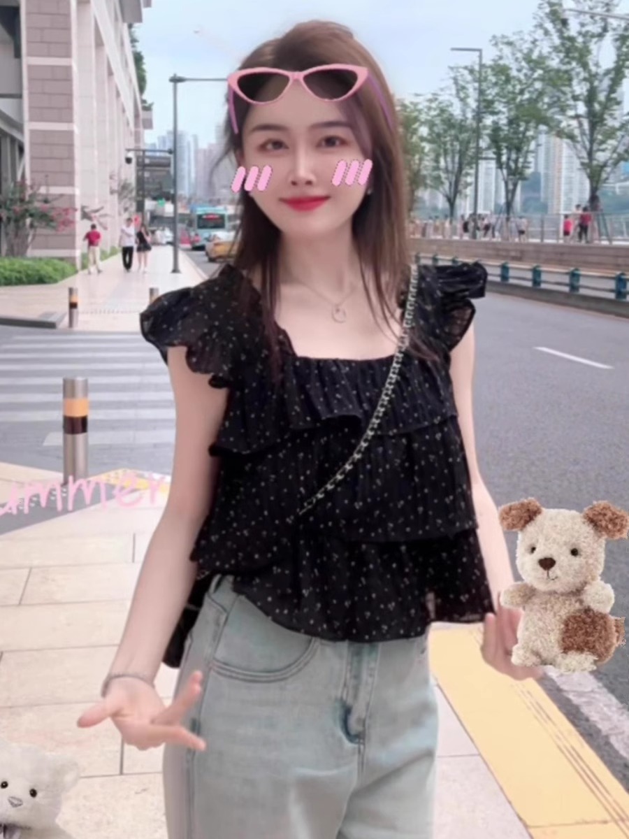 프랑스 스타일 스위트 웨이브 닷 작은 플라잉 슬리브 셔츠 여성의 여름 디자인 센스 에이지 감소 스퀘어 칼라 쉬폰 인형 셔츠 쇼트 탑