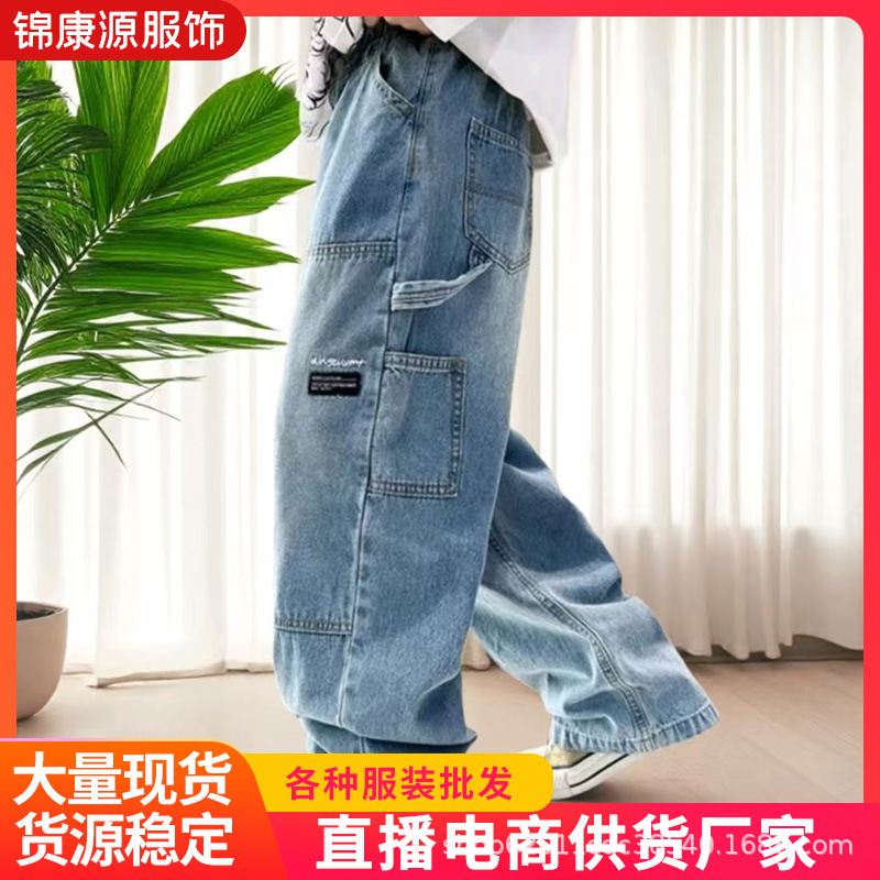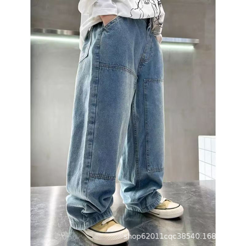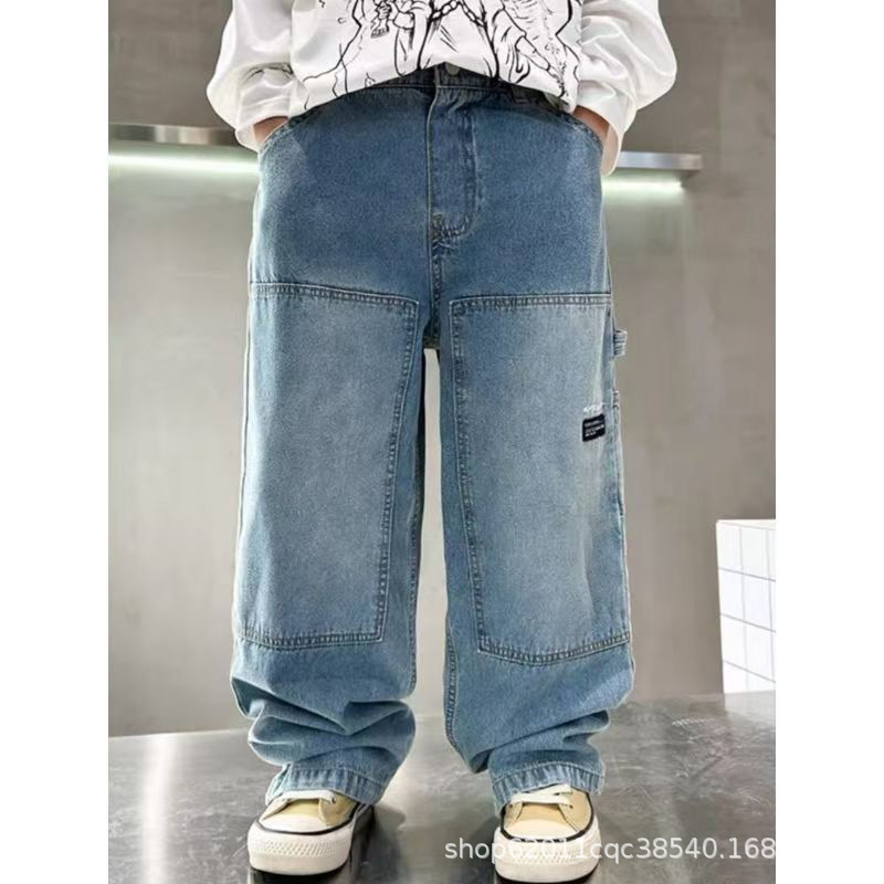 소년 가을 와이드 레그 작업복 청바지 2025 새로운 스타일 바지 중대형 아동복 봄, 가을 스트레이트 바지스토어 가기