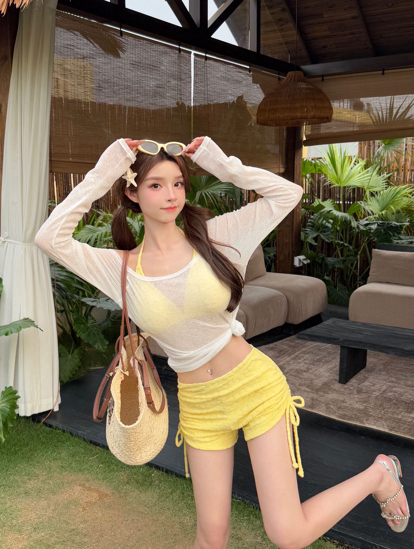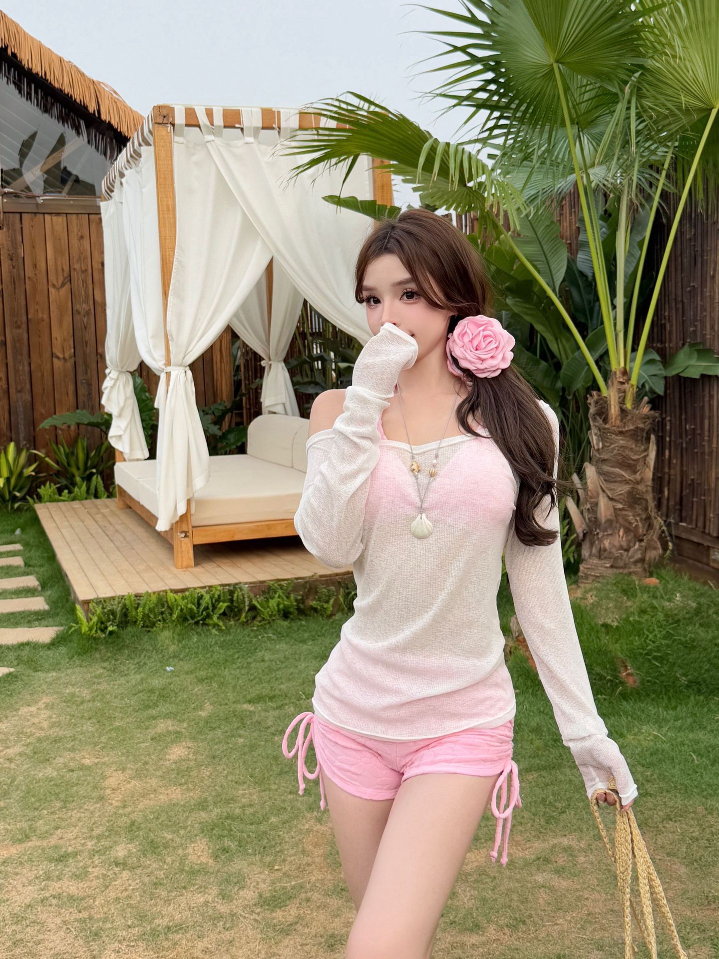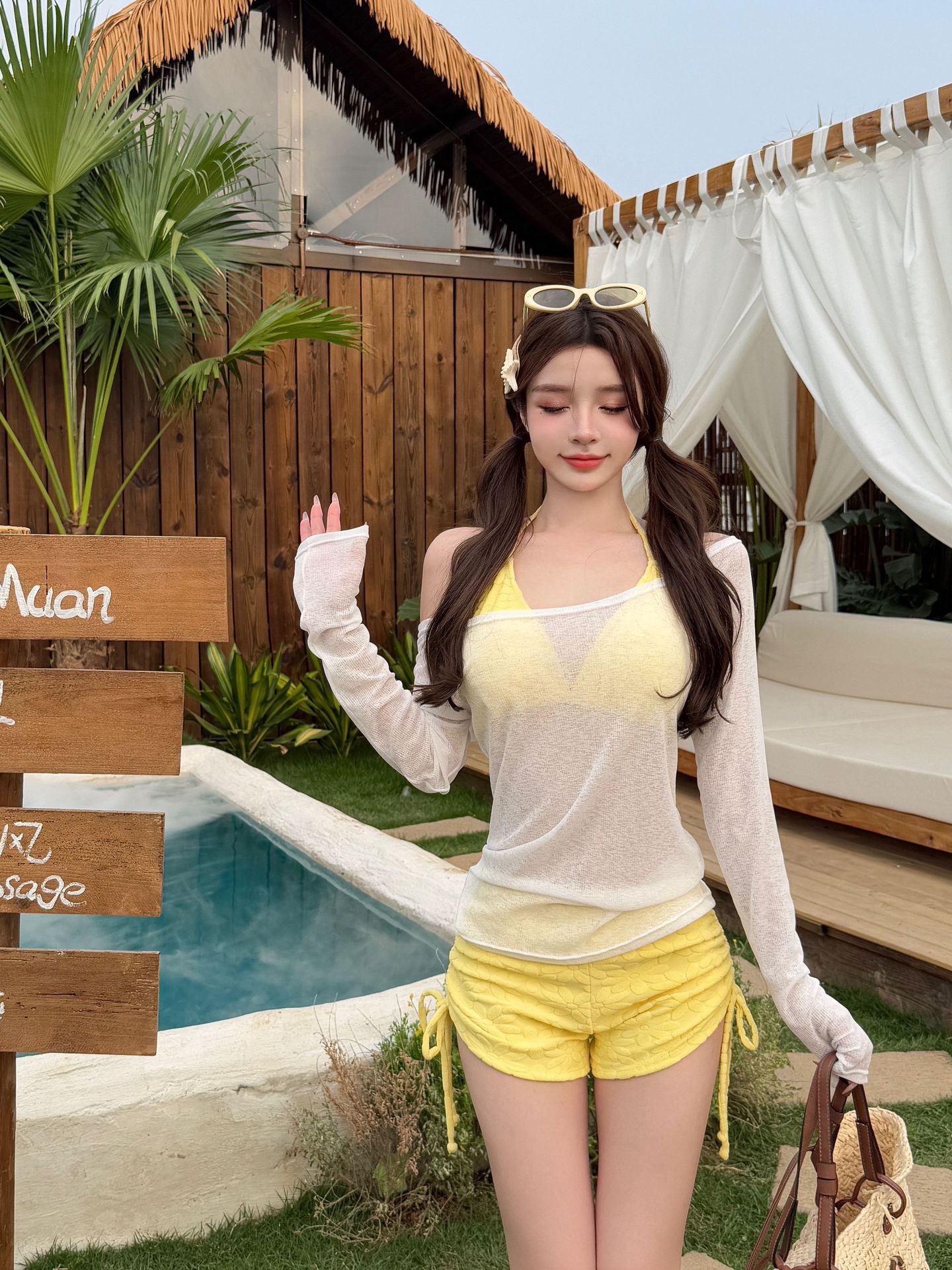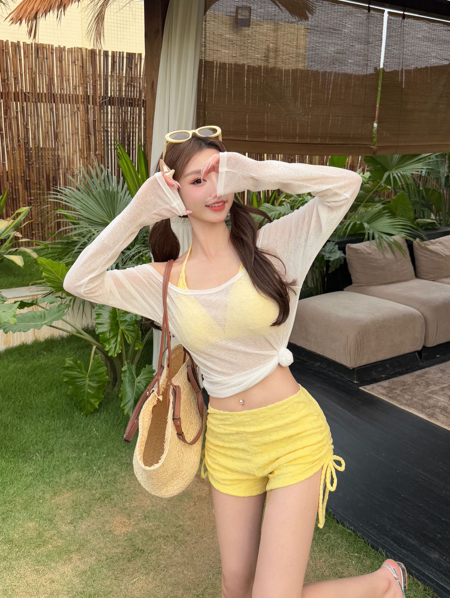 새로운 스타일의 여성용 크로스보더 수영복, 고급스럽고 귀엽고 달콤한 자외선 차단 긴팔 아우터, 온천용 배 가리개, 슬리밍 비키니스토어 가기