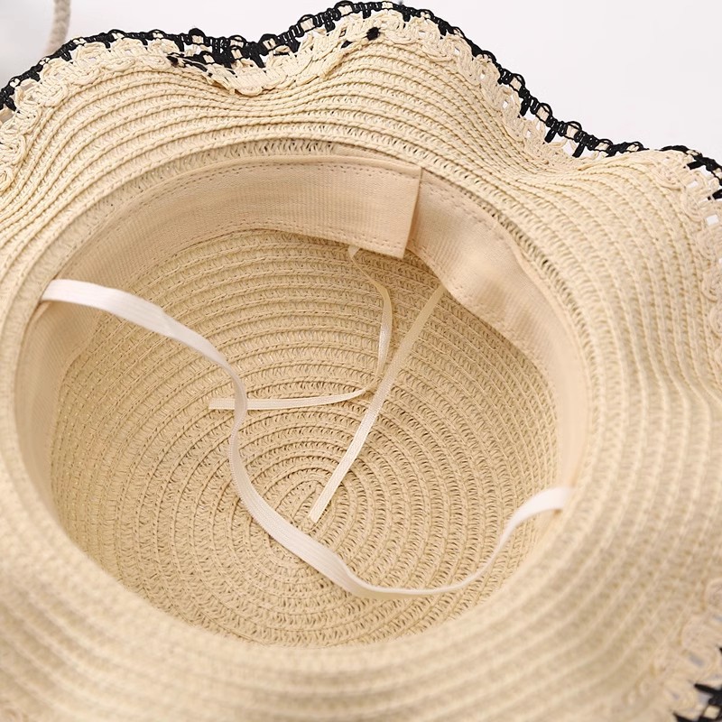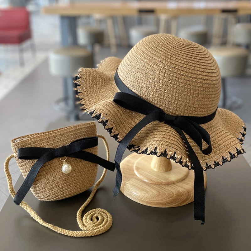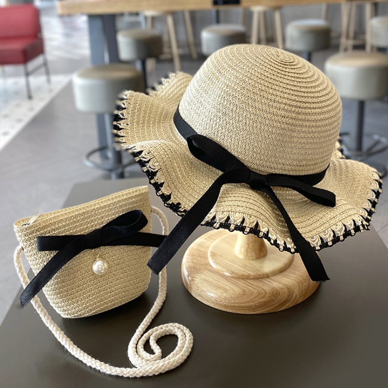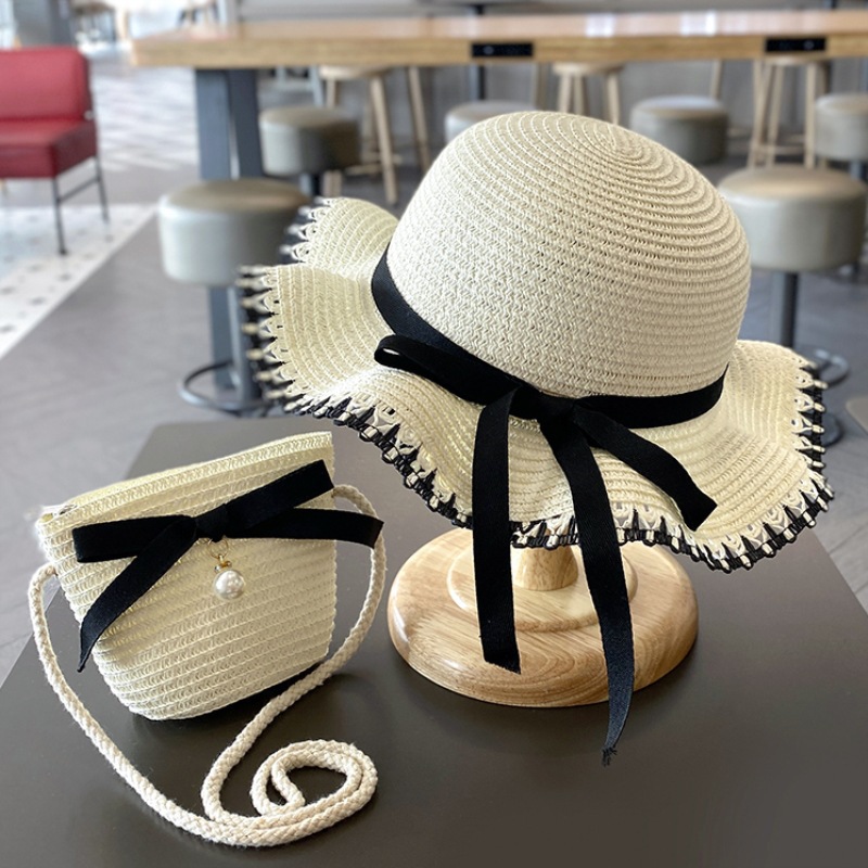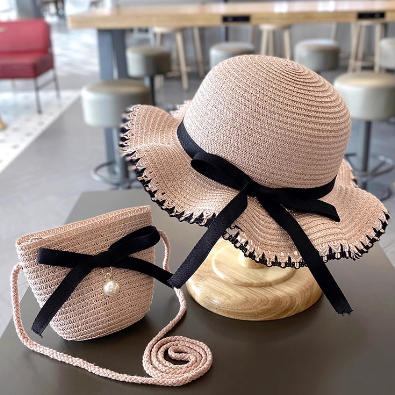여름 소녀 밀짚 모자 큰 챙 태양 모자 소녀 아기 태양 보호 태양 여행 해변 모자 가방 세트