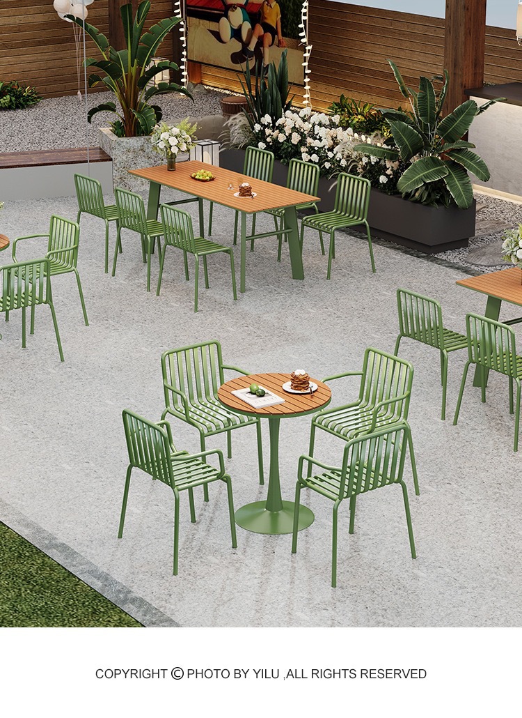 야외 식탁과 의자 조합 밀크티 숍 야외 인터넷 연예인 카페 플라스틱 목재 방수 및 자외선 차단제 철제 야외 협상 테이블