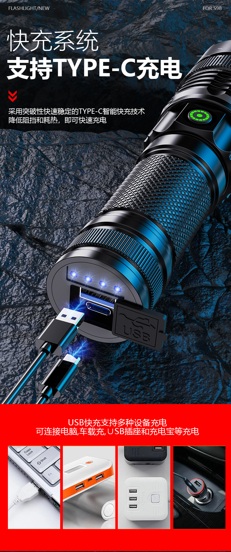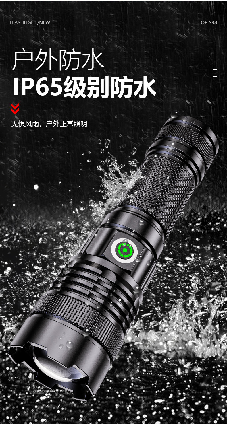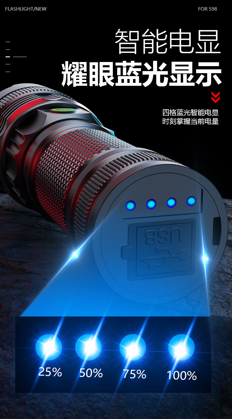 긴 수명 휴대용 알루미늄 합금 손전등을 충전하는 국경 새로운 야외 매우 밝은 콘덴서 장거리 Type-C스토어 가기