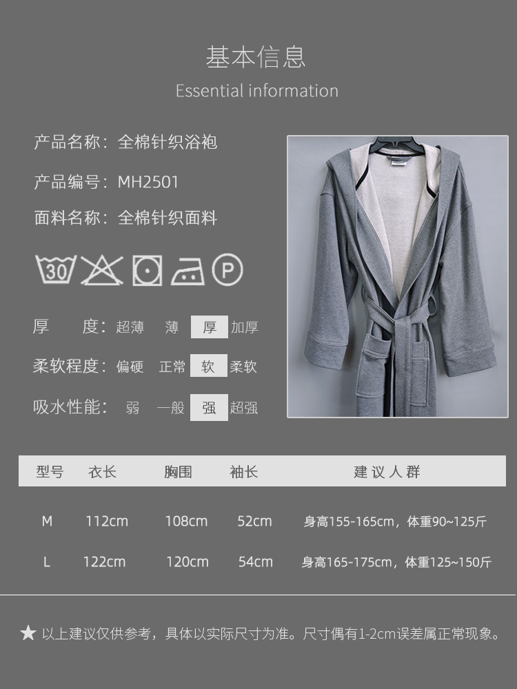 성인 순면 후드 호텔 목욕 가운, 남성용 및 여성용 올 시즌 잠옷, 면 B&B 목욕 가운, 가정복, 재고 있음