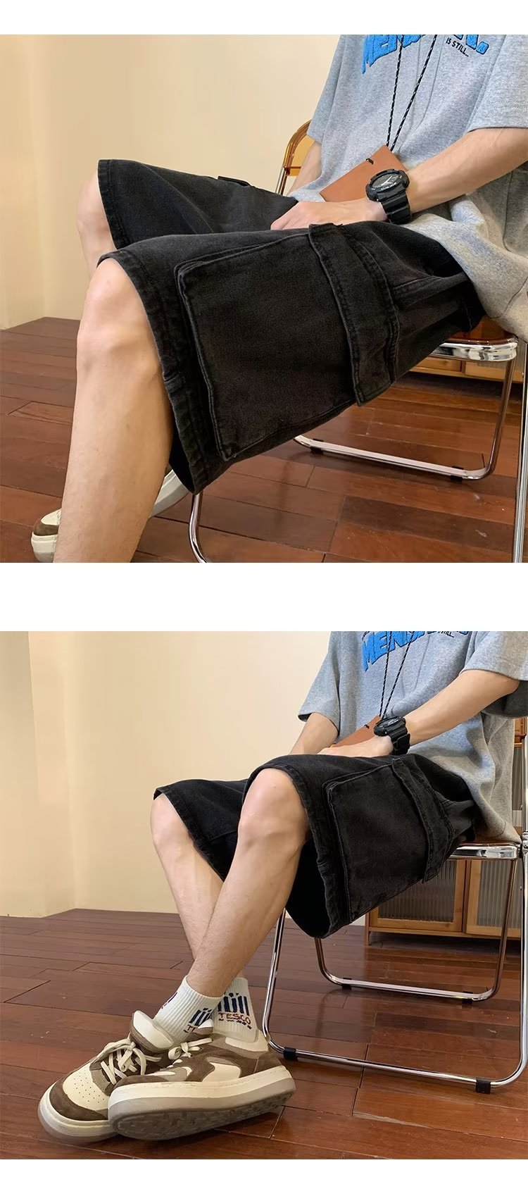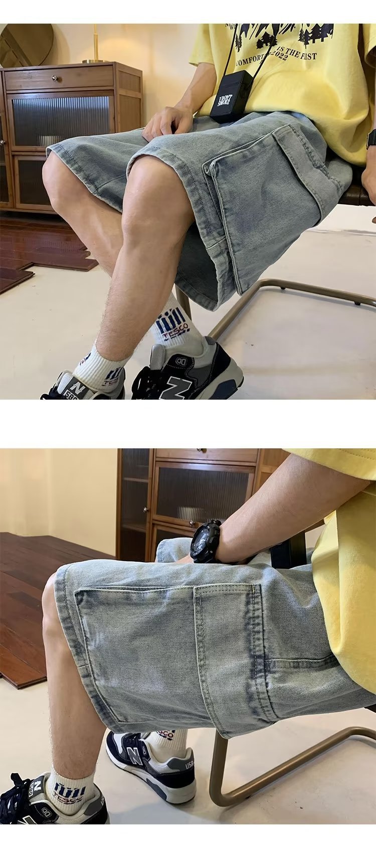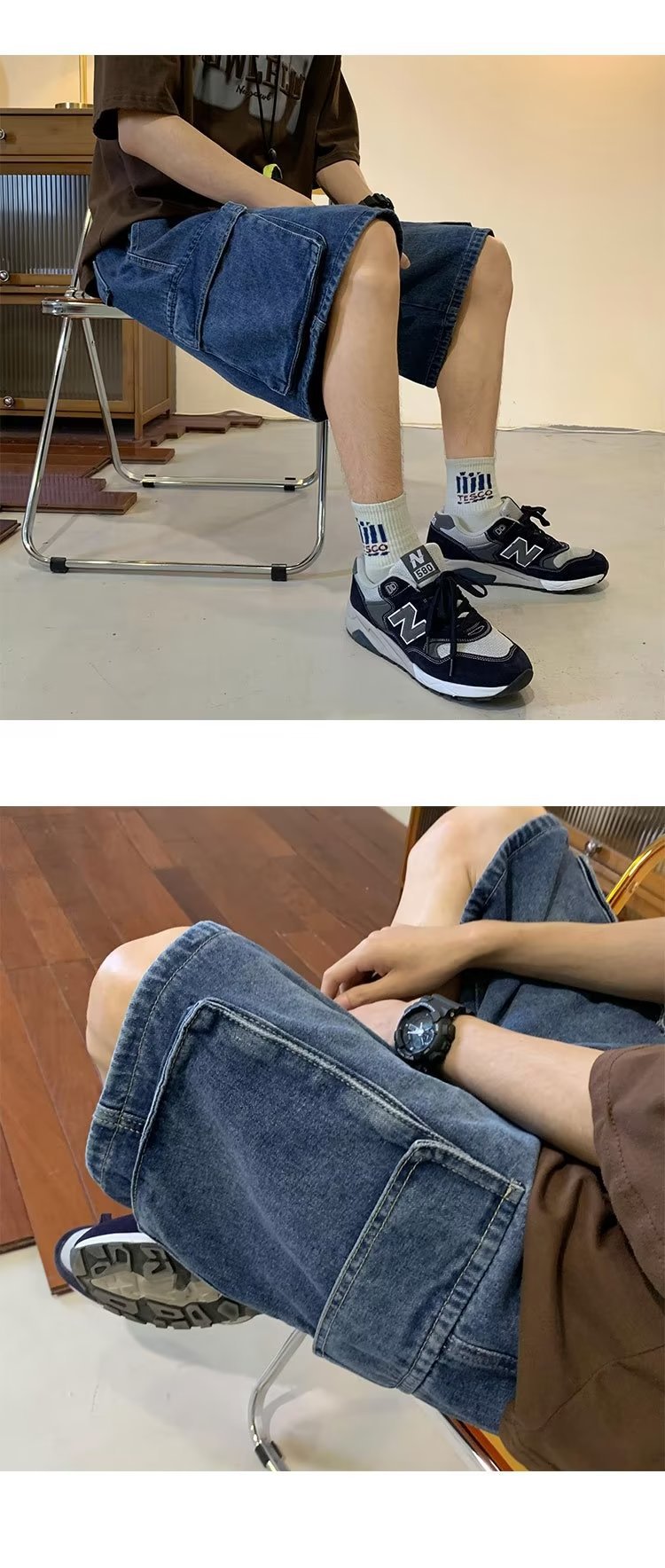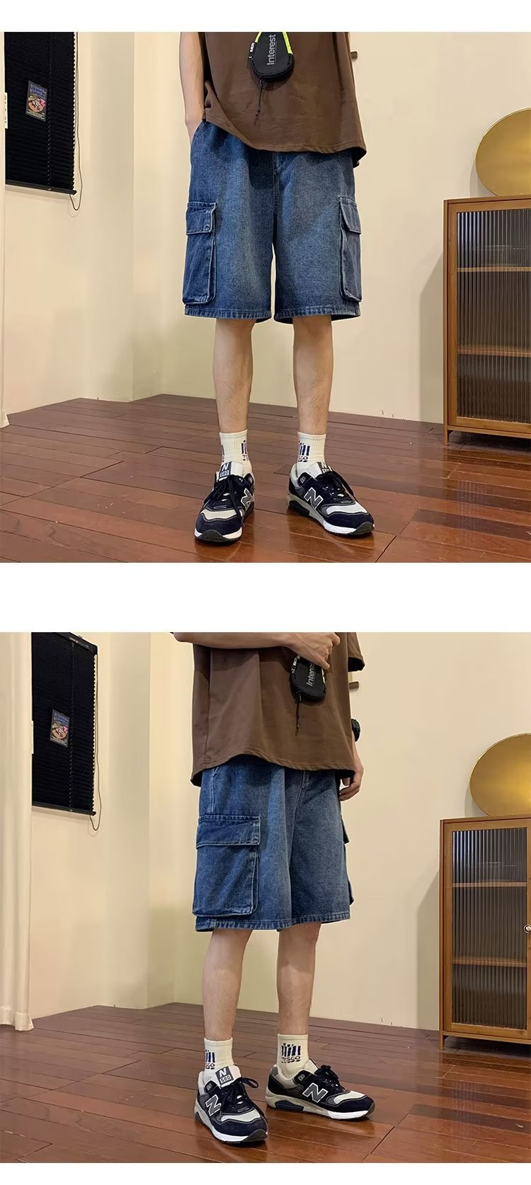 작업복 데님 반바지 남성 여름 새로운 복고풍 패션 탄성 허리 느슨한 캐주얼 중간 길이 바지 드롭 배송스토어 가기