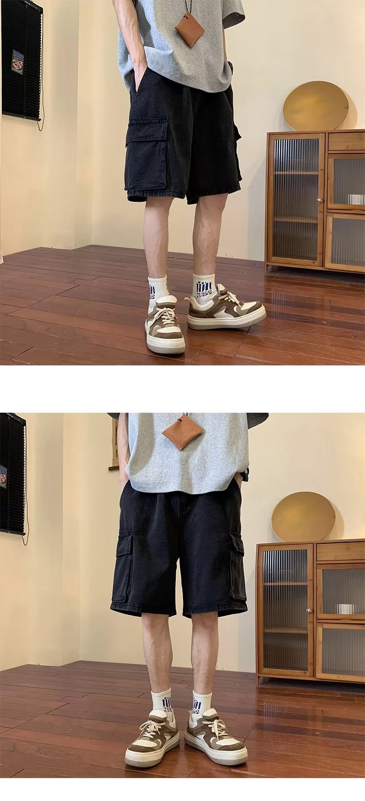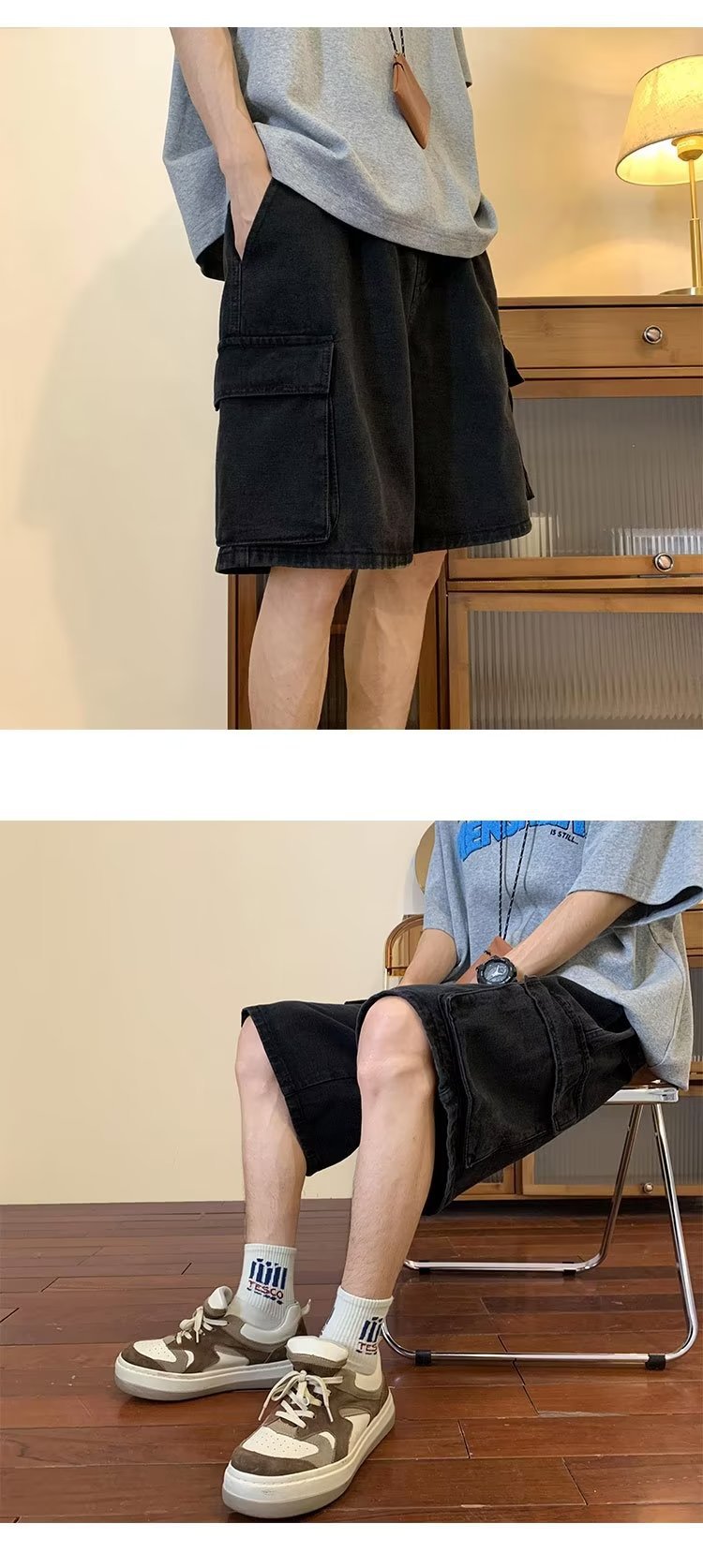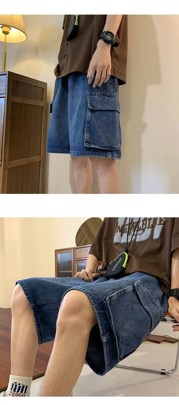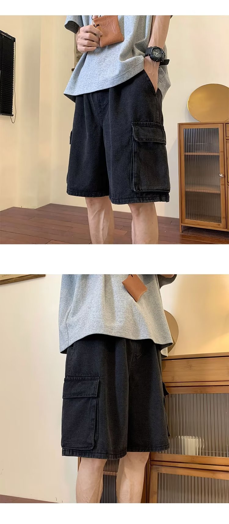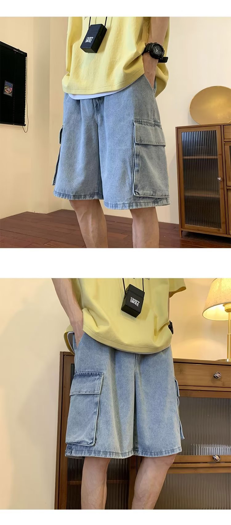 작업복 데님 반바지 남성 여름 새로운 복고풍 패션 탄성 허리 느슨한 캐주얼 중간 길이 바지 드롭 배송