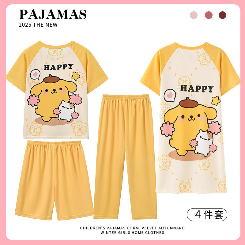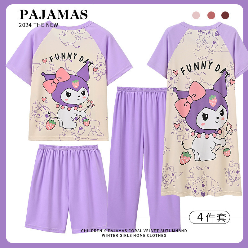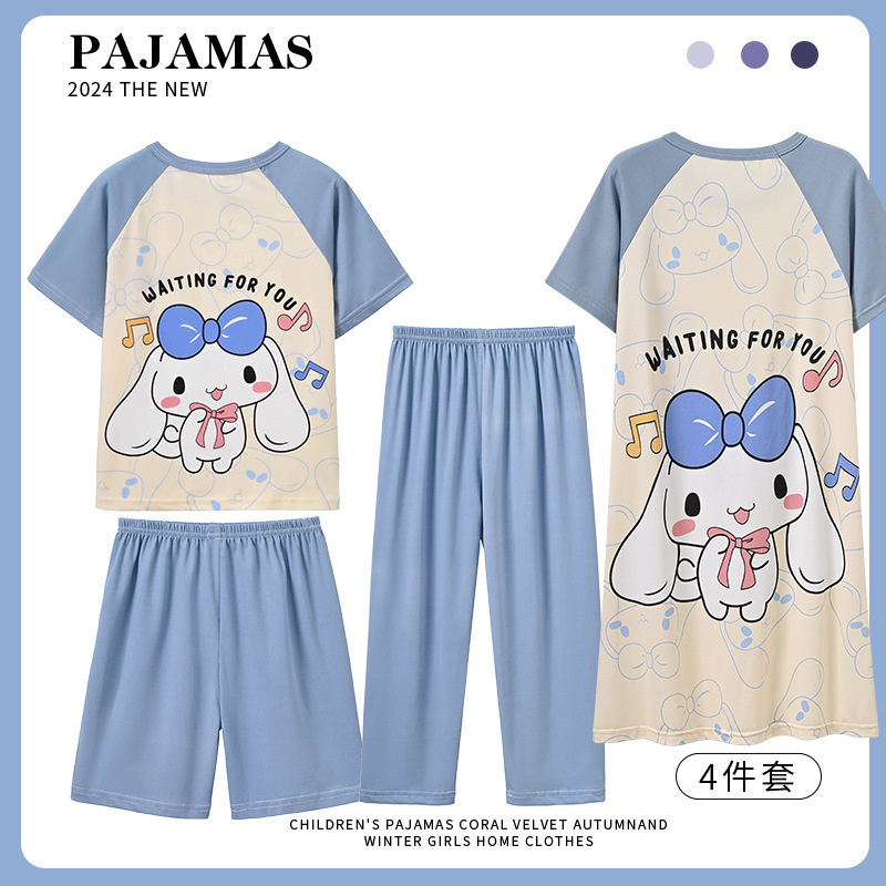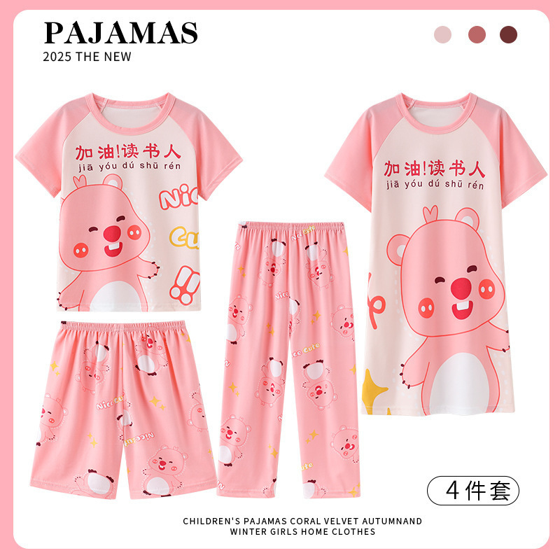 여름 만화 잠옷 4 피스 홈웨어 밀크 실크 어린이 라운드 넥 소녀 반팔 모조 면화 동남 아시아 국경 간