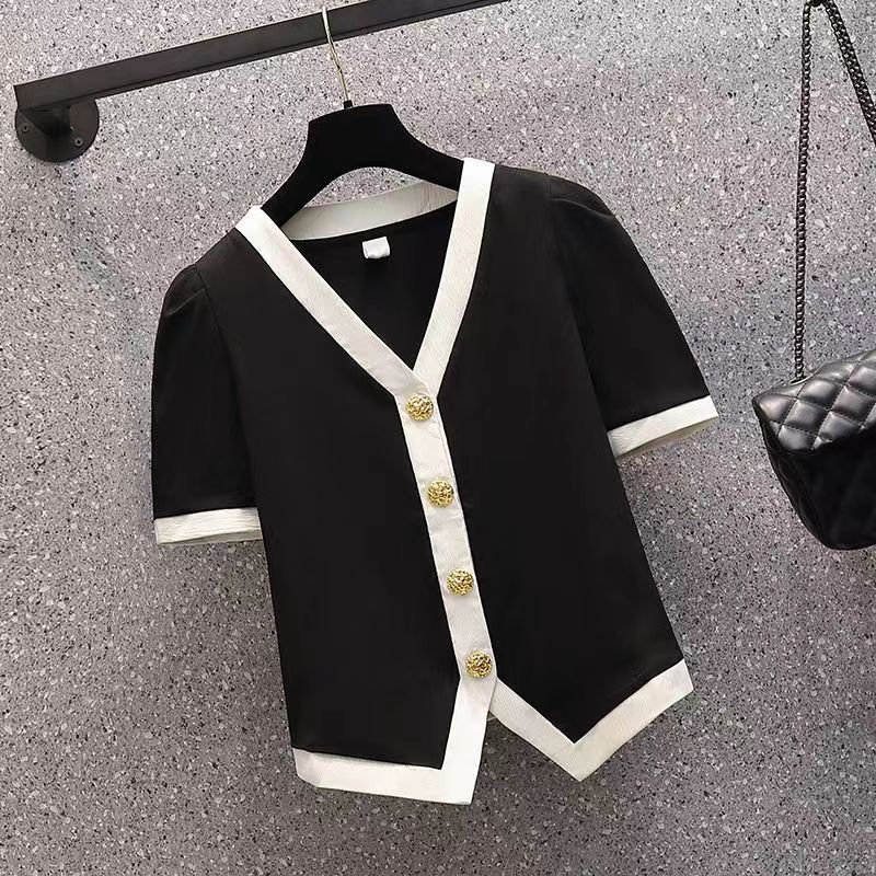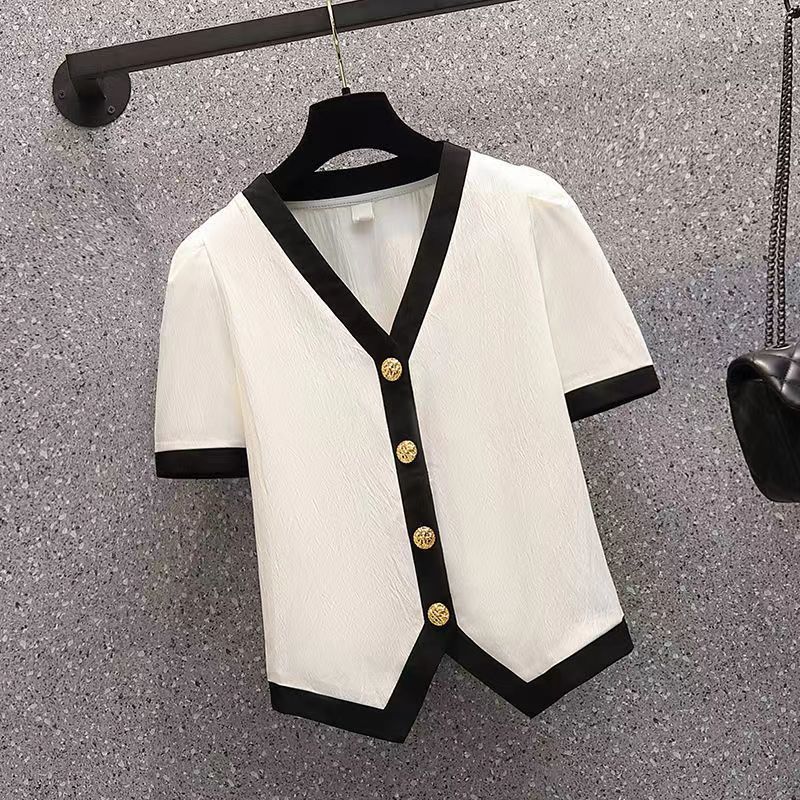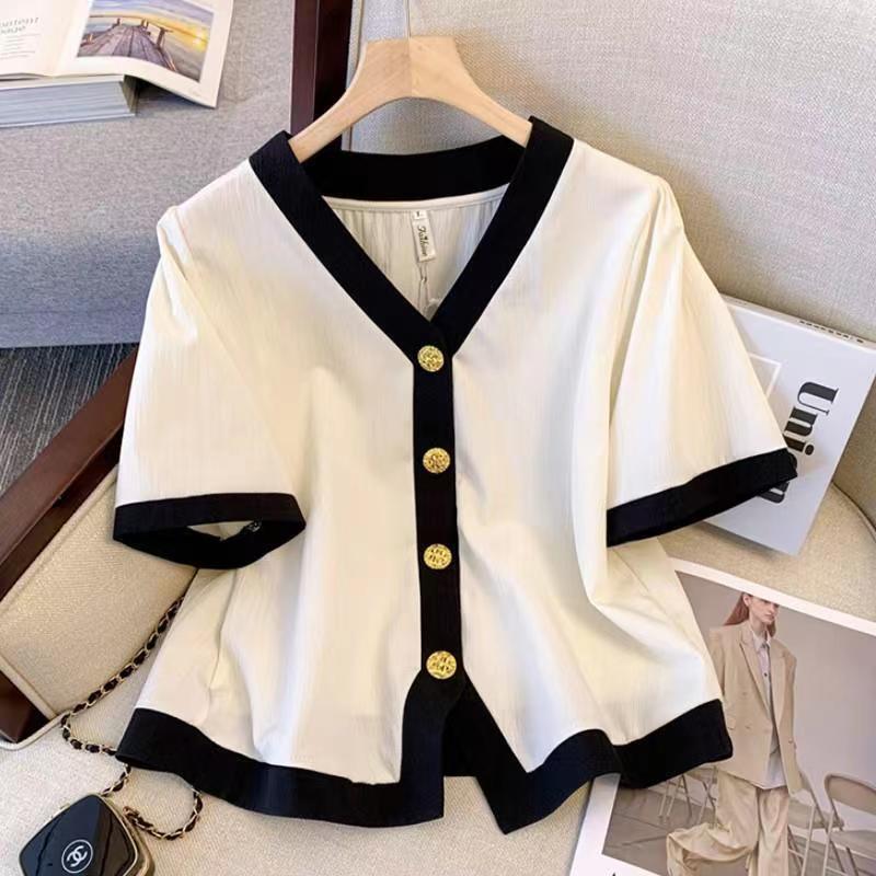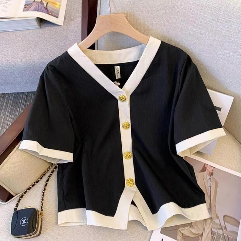 플러스 사이즈 쉬폰 셔츠 흑백 스플리싱 반팔 셔츠 여름 신작 뚱뚱하고 얇은 루즈 캐주얼 향기로운 셔츠