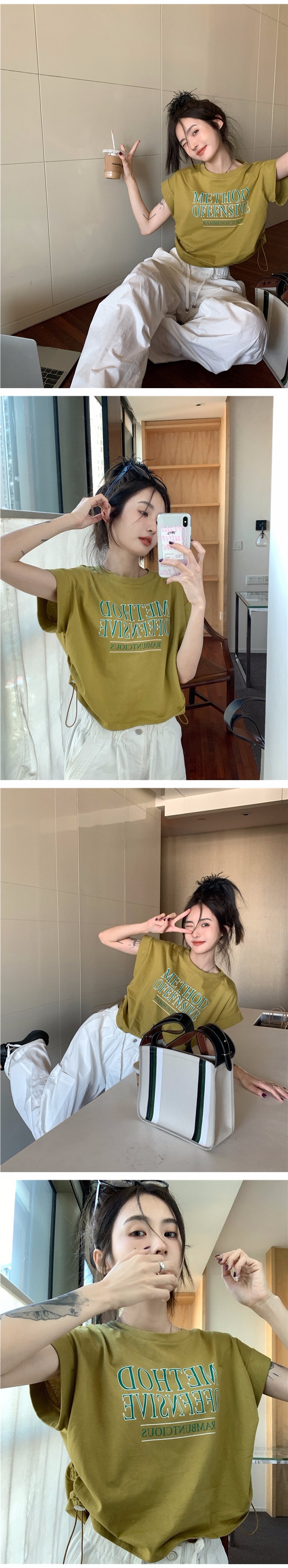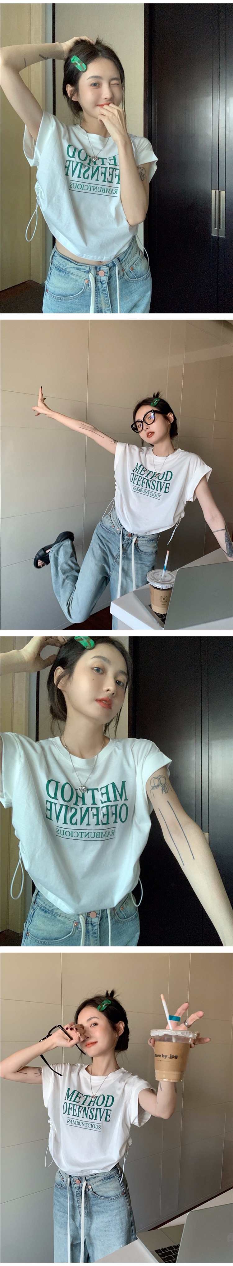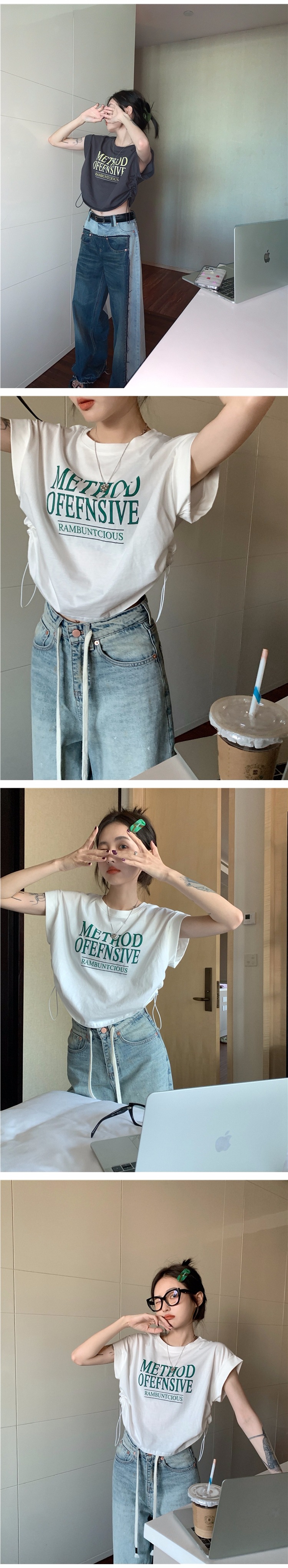 여성을위한 새로운 미국 스타일 오른쪽 어깨 드로스트링 반팔 티셔츠 여름 짧은 재즈 댄스 루즈하고 시크한 배꼽 노출 탑 달콤하고 감성스토어 가기
