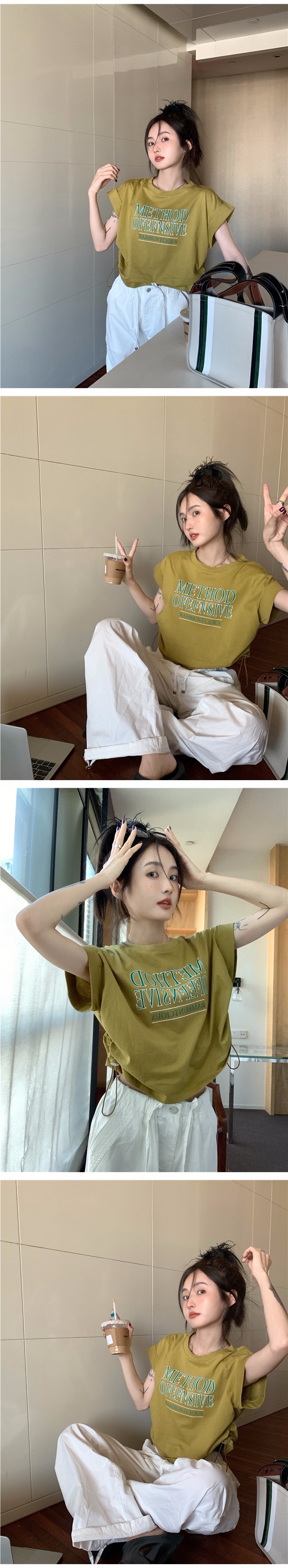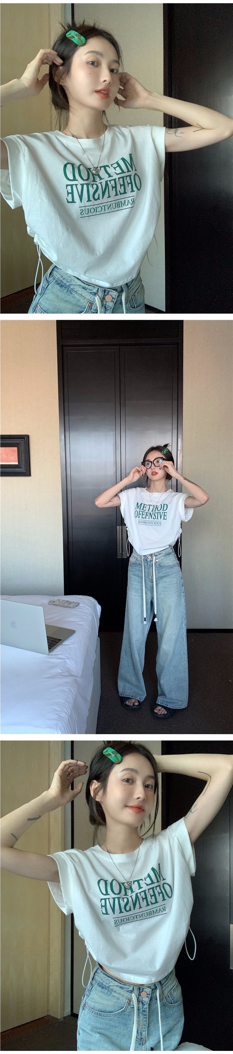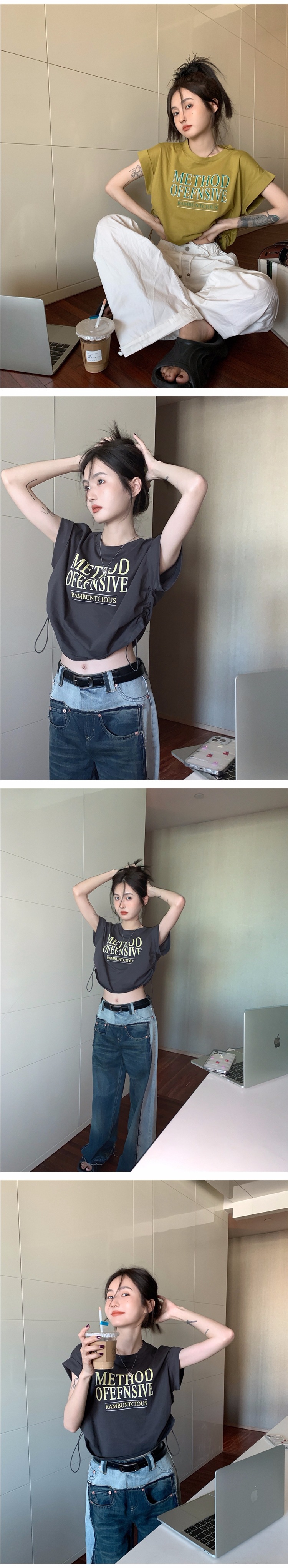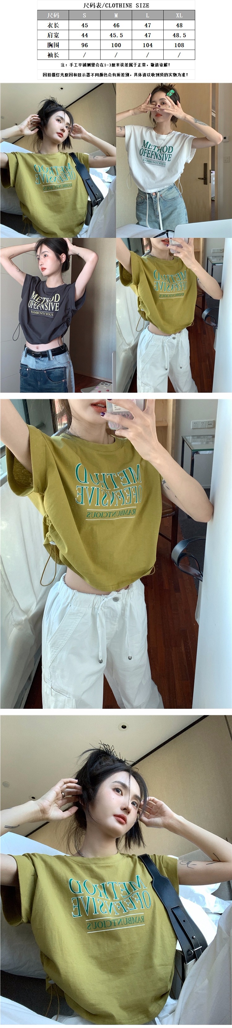 여성을위한 새로운 미국 스타일 오른쪽 어깨 드로스트링 반팔 티셔츠 여름 짧은 재즈 댄스 루즈하고 시크한 배꼽 노출 탑 달콤하고 감성스토어 가기