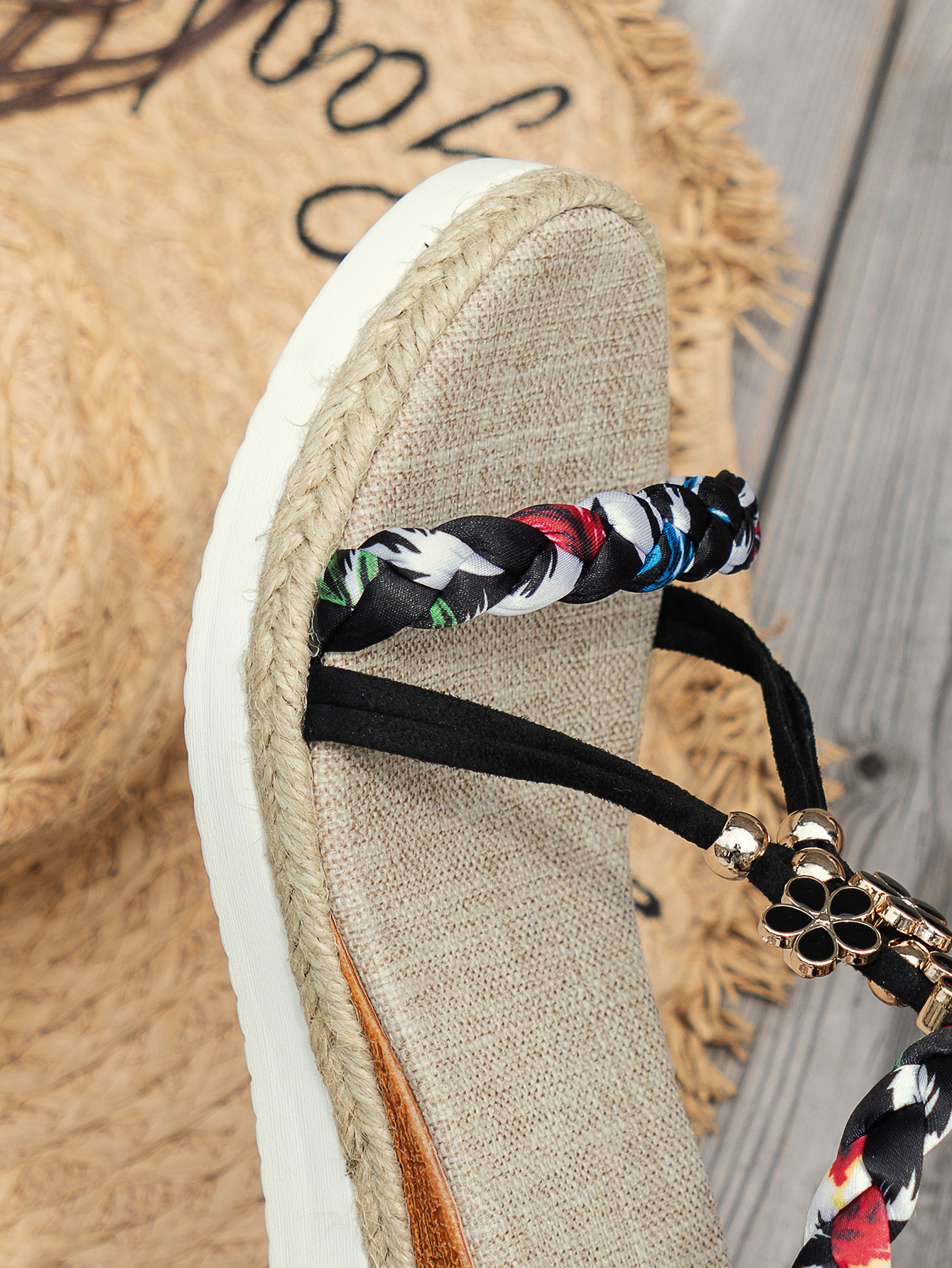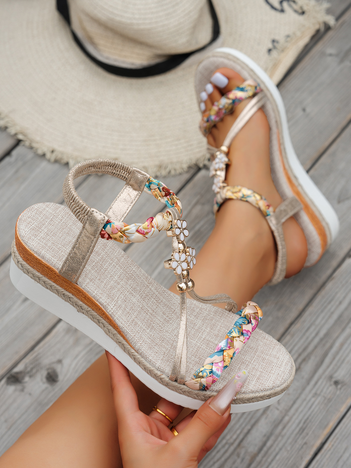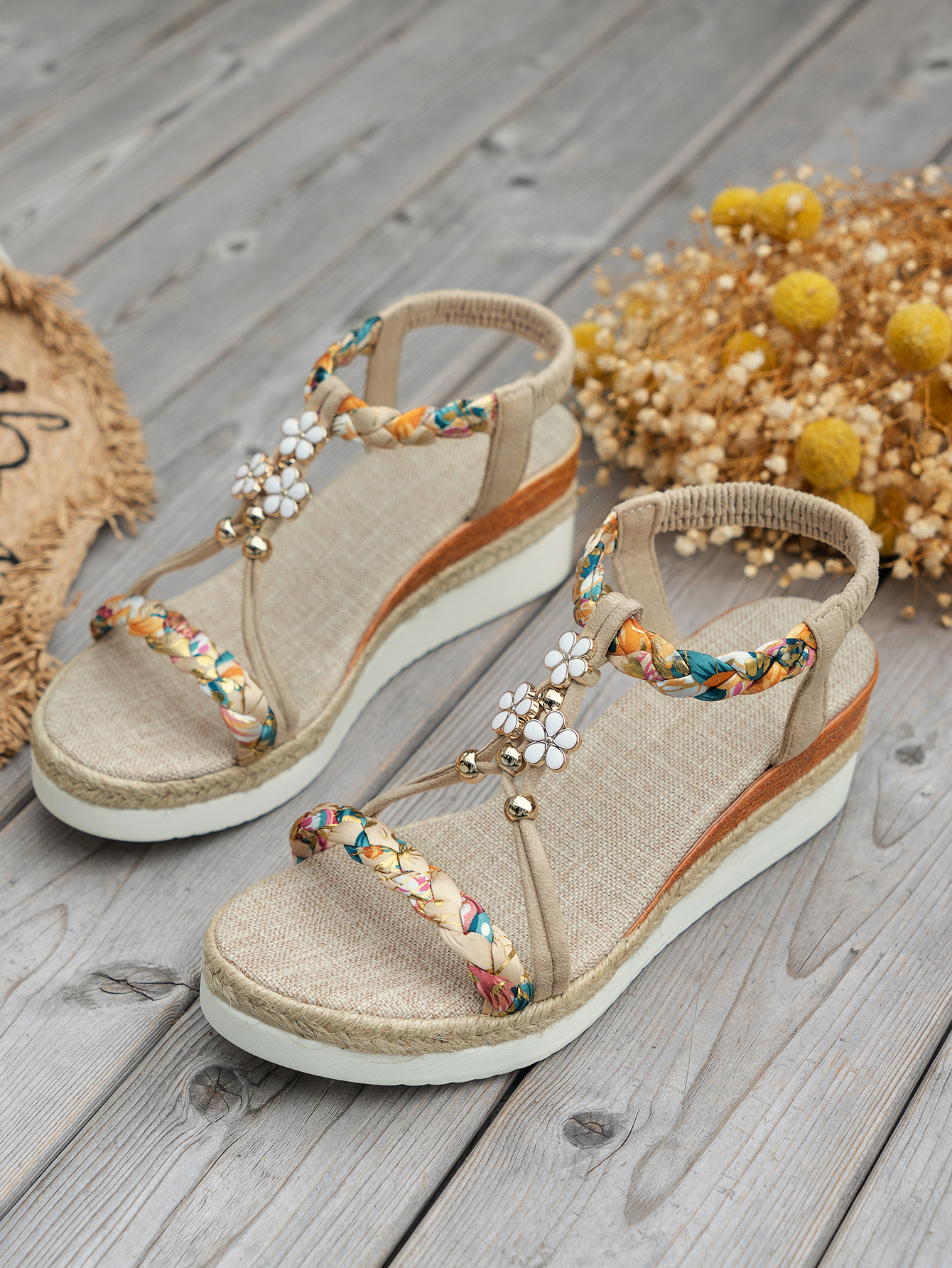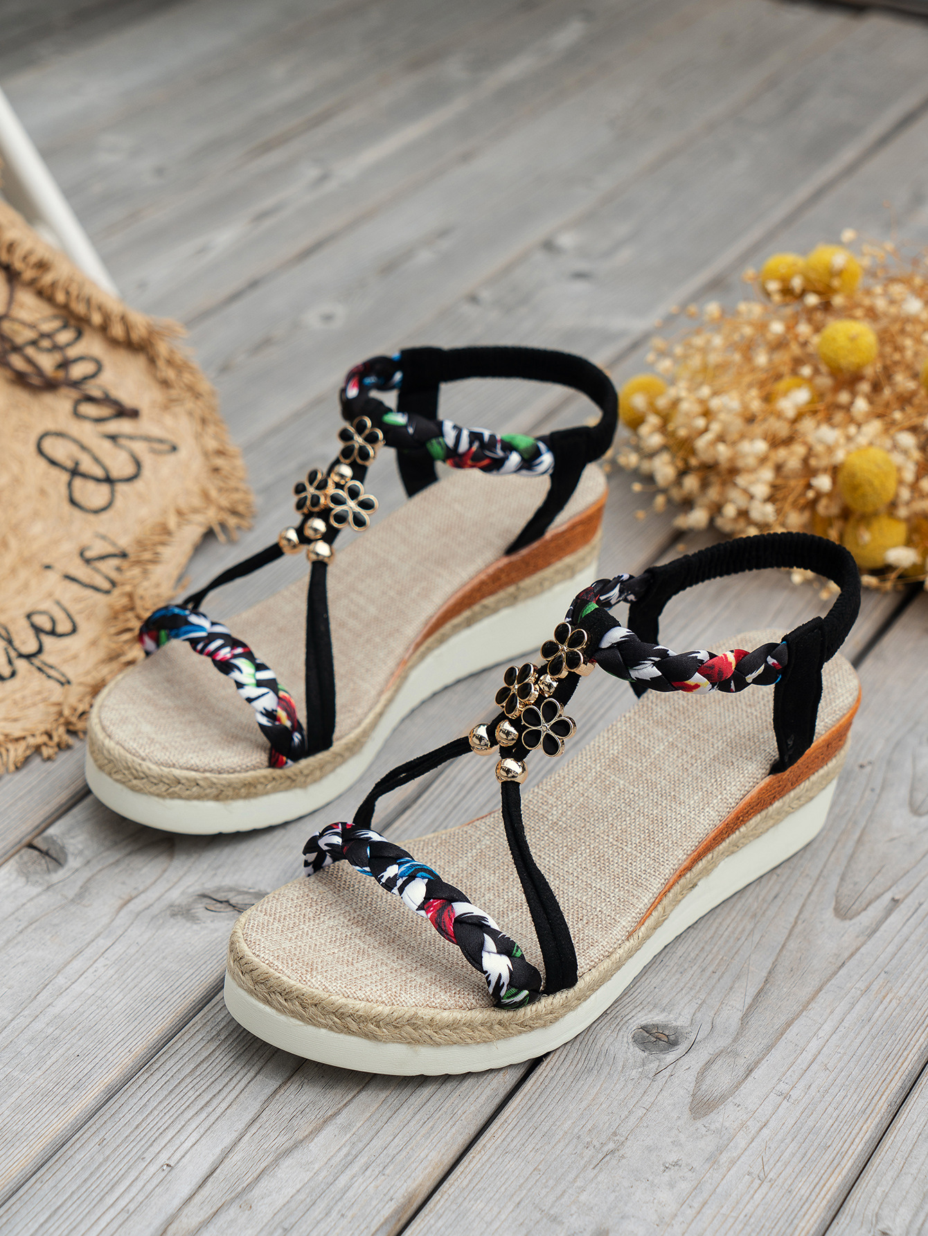 국경 간 대형 민족 스타일 새로운 스타일의 라인 석 장식 웨지 패션 비치 여성 탄성 밴드 샌들 짠 여성 신발