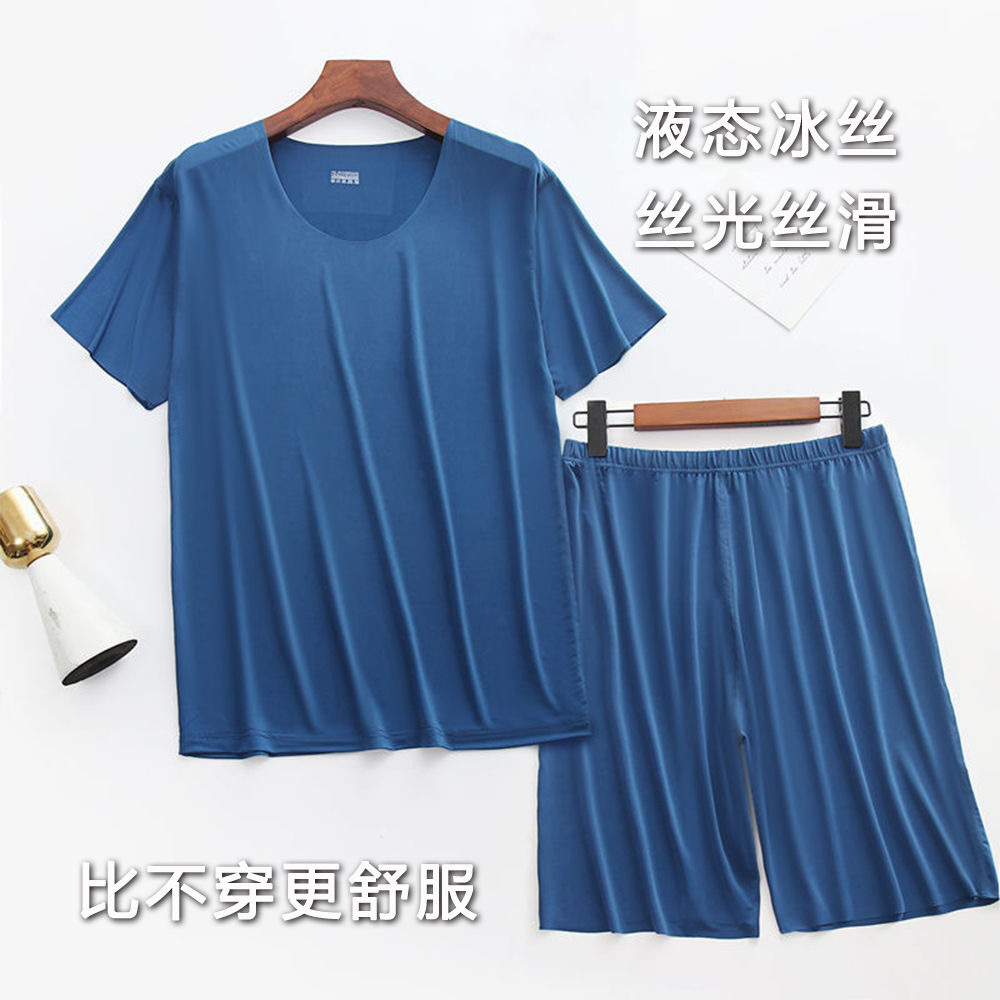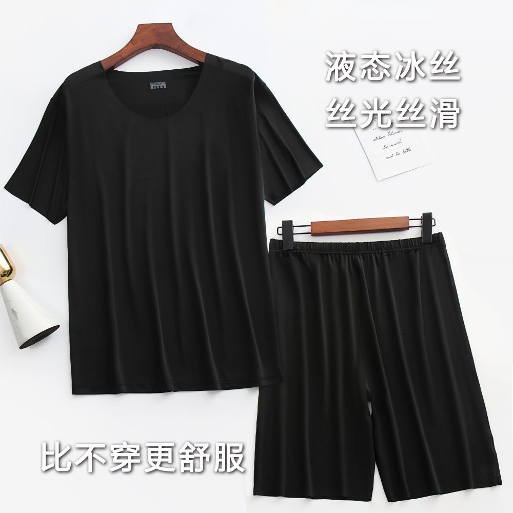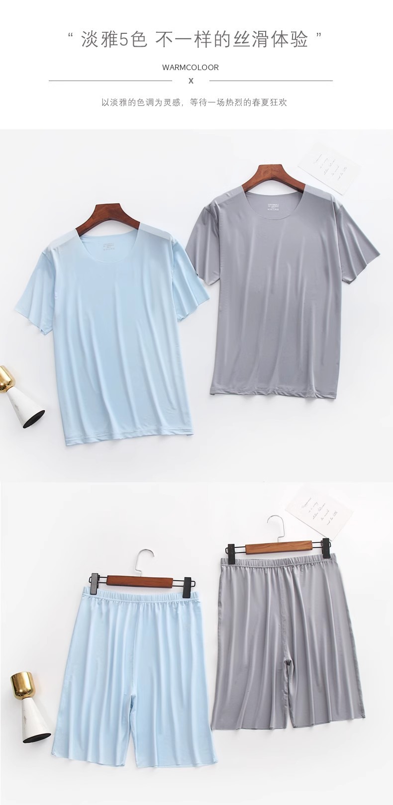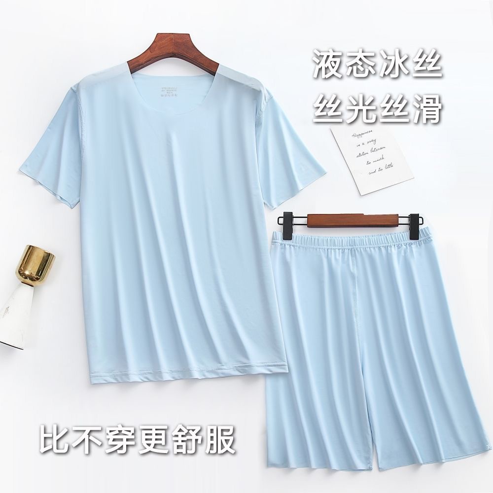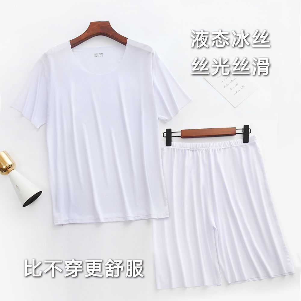 여름 액체 얼음 실크 원활한 잠옷 세트 누드 고탄성 티셔츠 반팔 5 점 반바지 남성용 홈웨어스토어 가기
