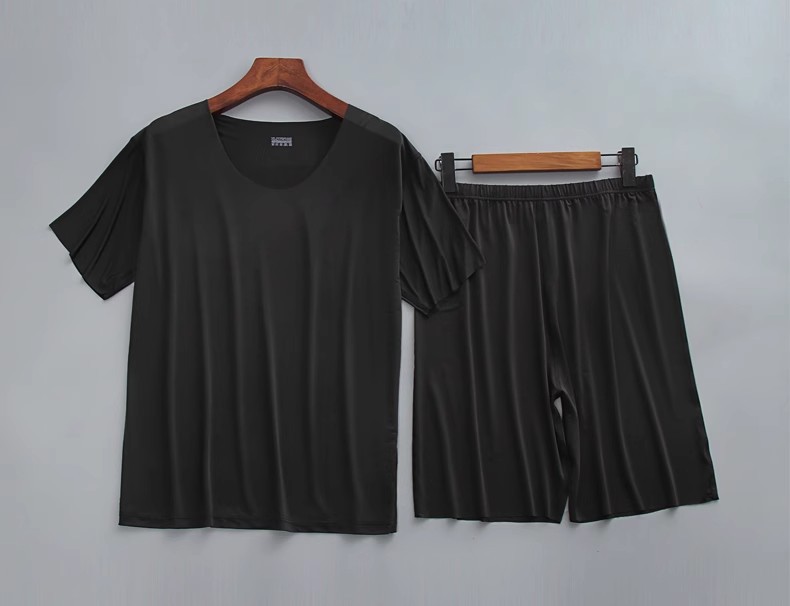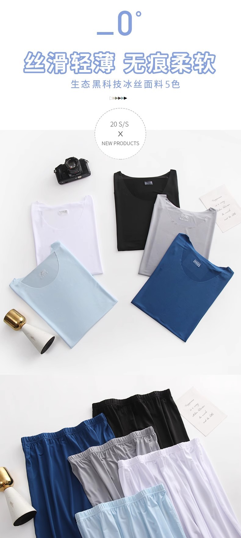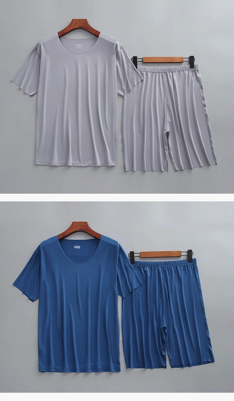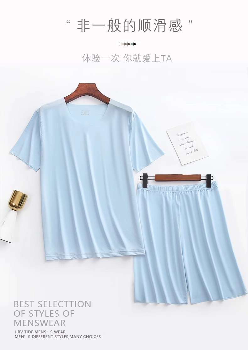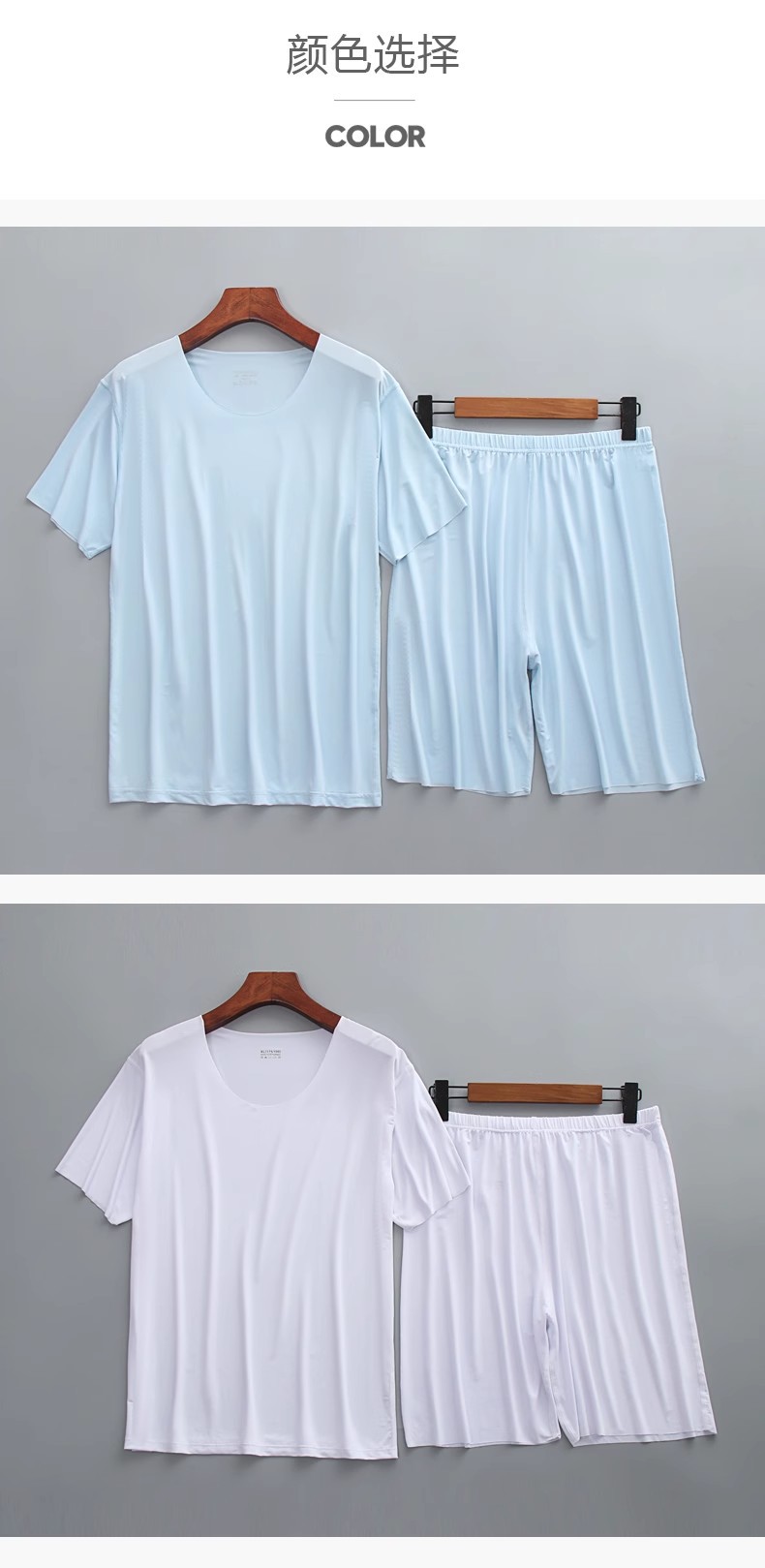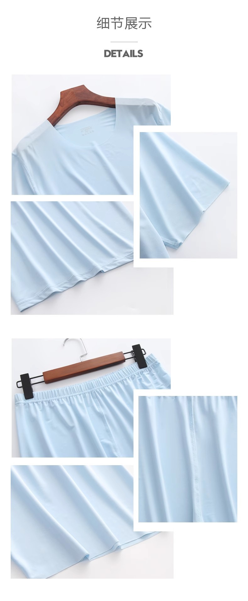 여름 액체 얼음 실크 원활한 잠옷 세트 누드 고탄성 티셔츠 반팔 5 점 반바지 남성용 홈웨어스토어 가기