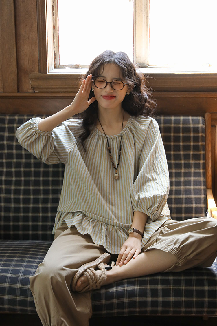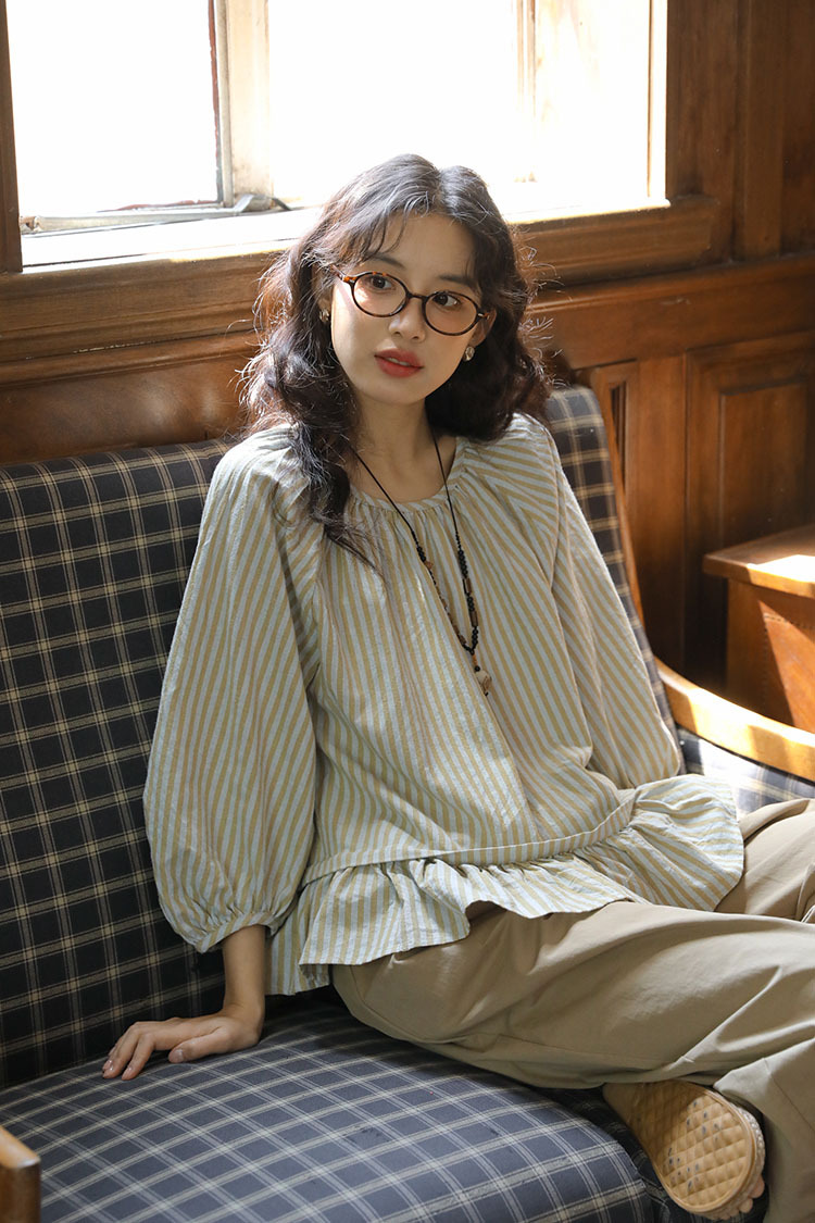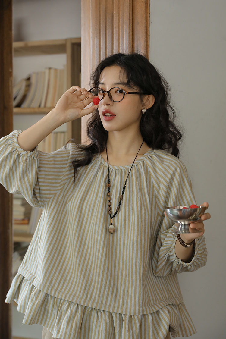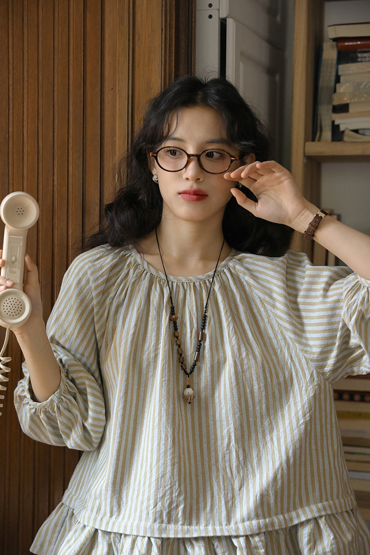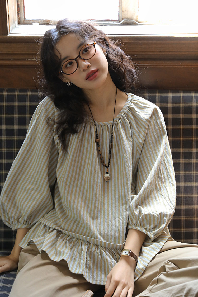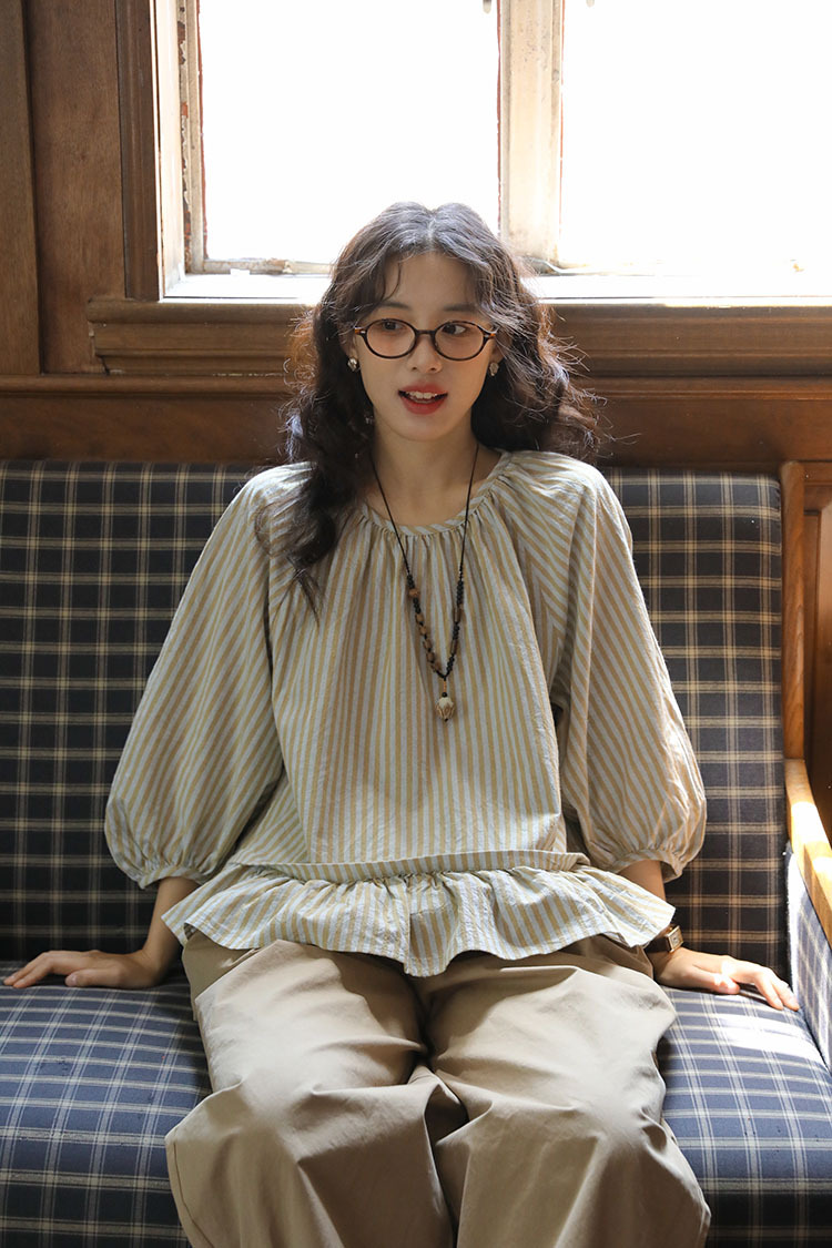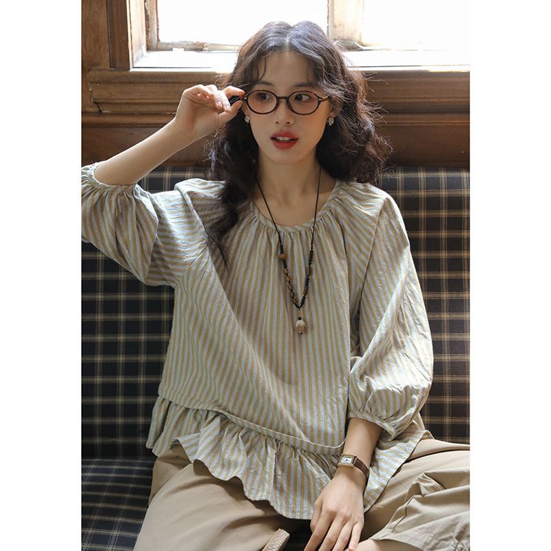 실제 촬영 2026년 여름 신상 일본풍 문학적이고 신선한 스타일의 라운드넥 통근용 레이스 5부 소매 스트라이프 셔츠 여성용스토어 가기