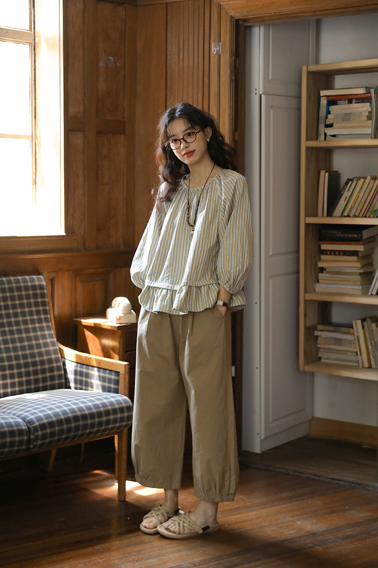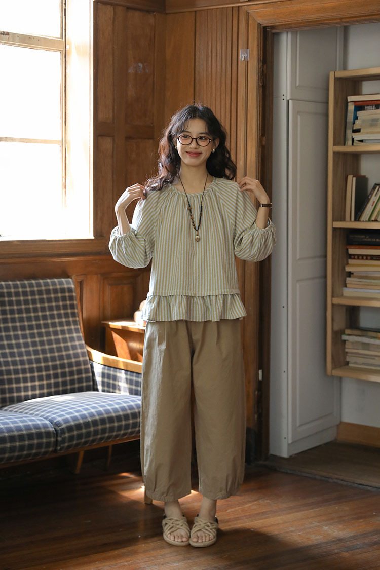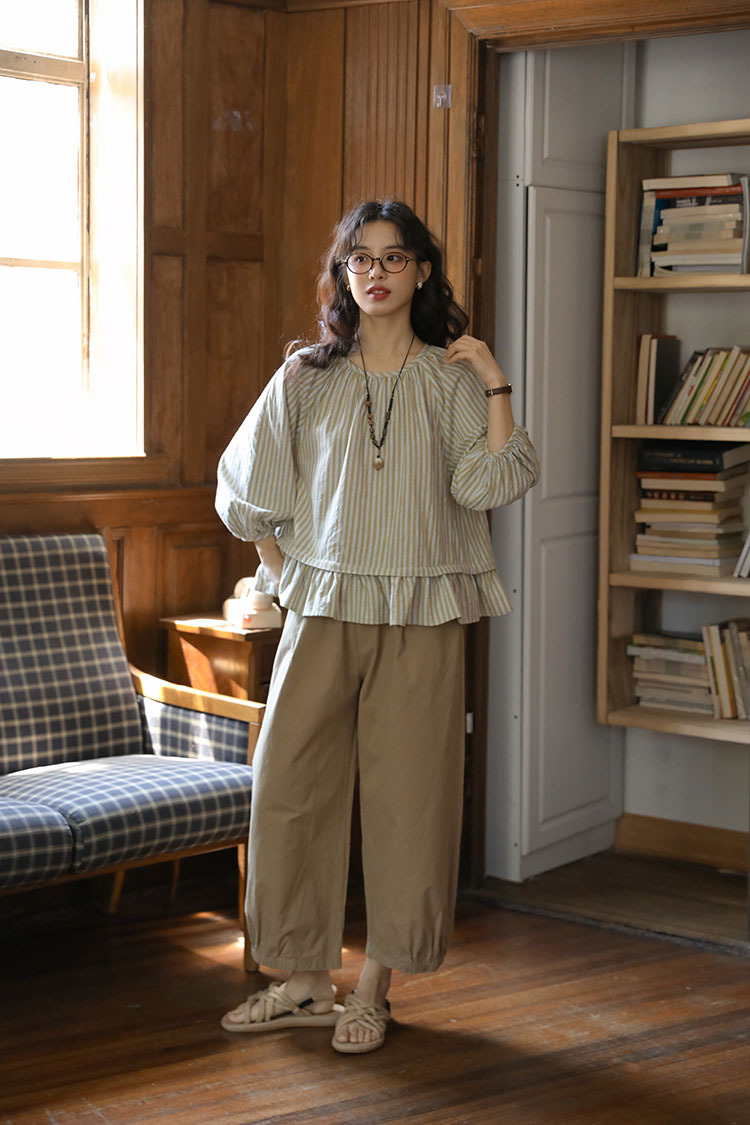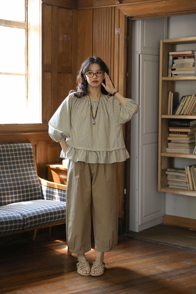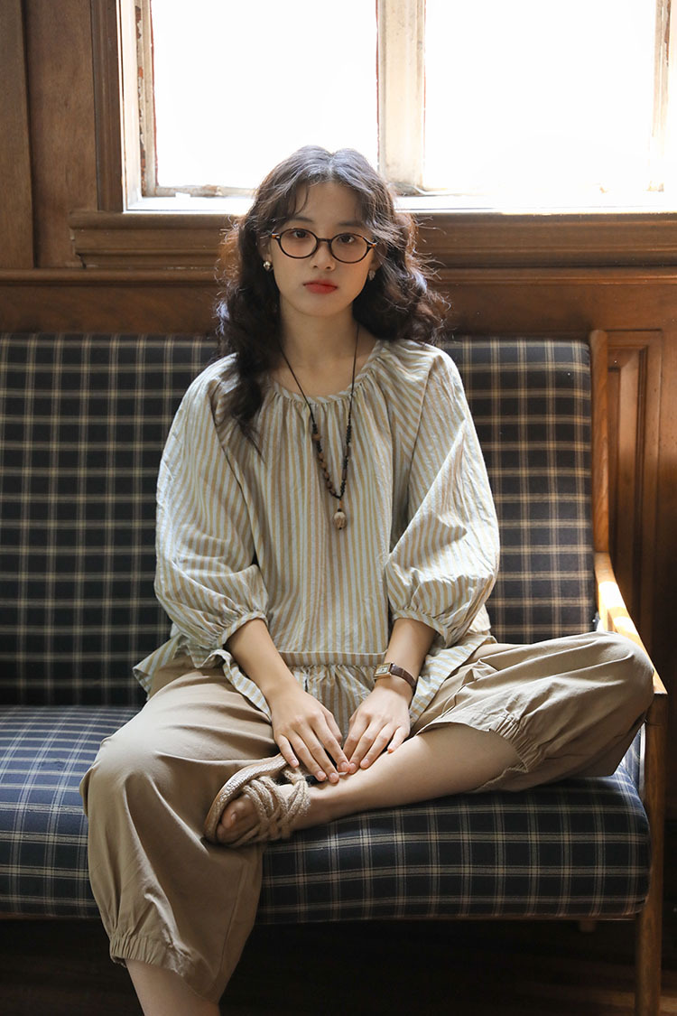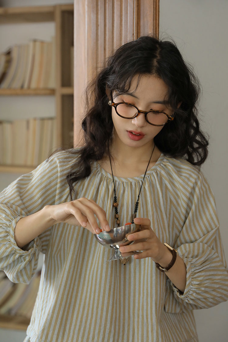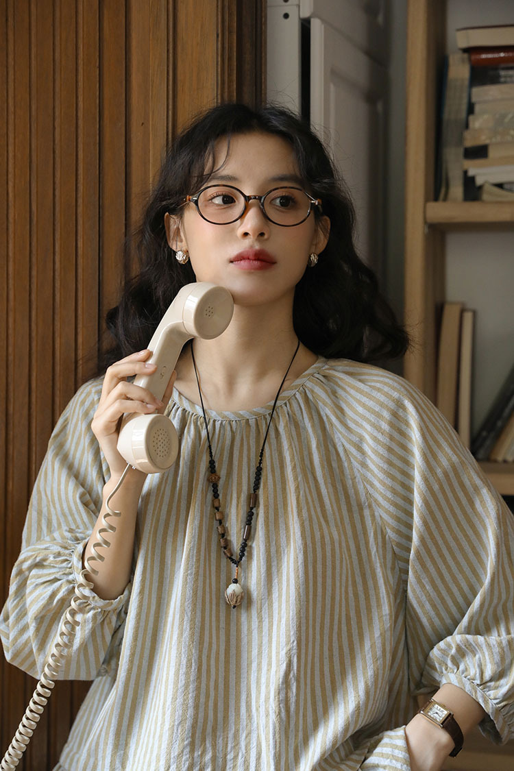 실제 촬영 2026년 여름 신상 일본풍 문학적이고 신선한 스타일의 라운드넥 통근용 레이스 5부 소매 스트라이프 셔츠 여성용스토어 가기