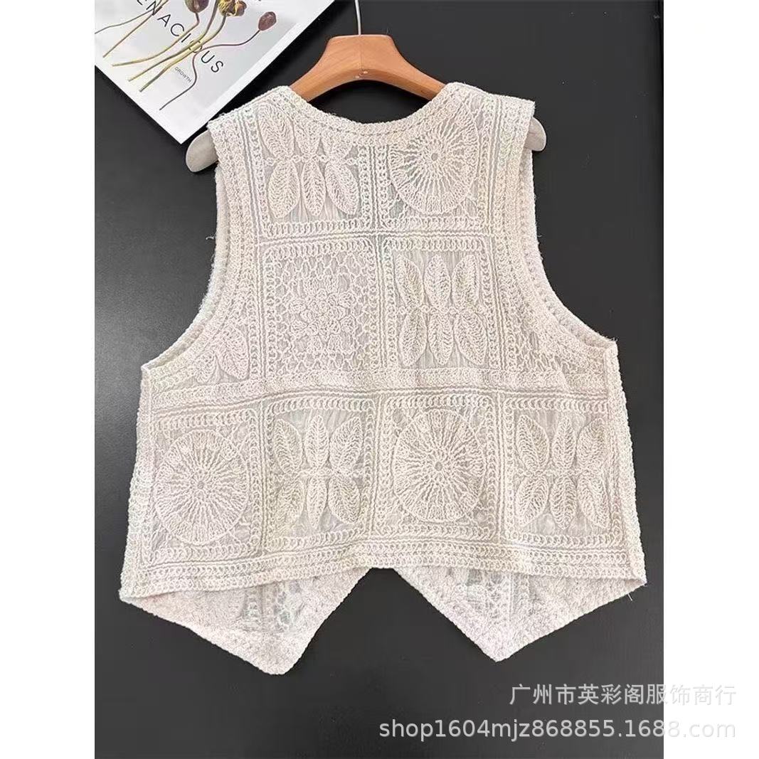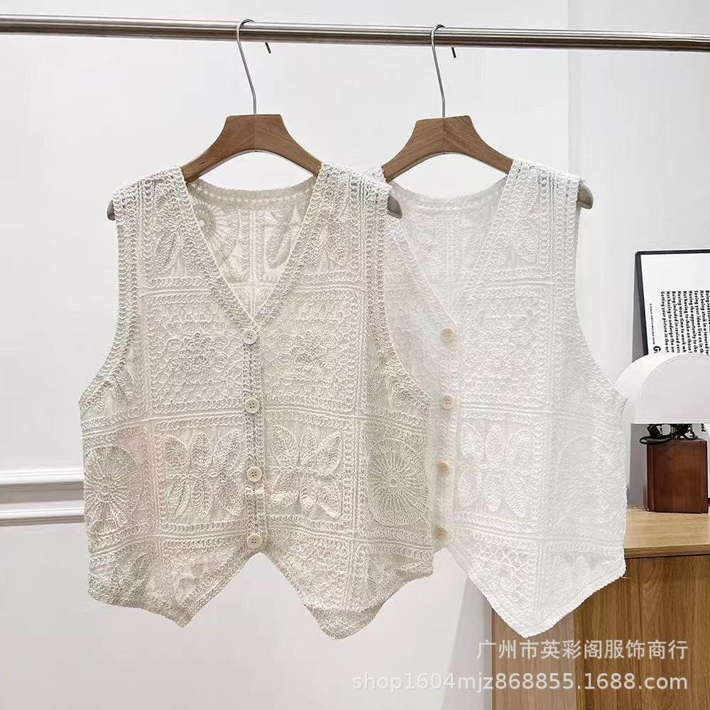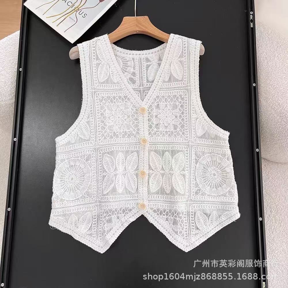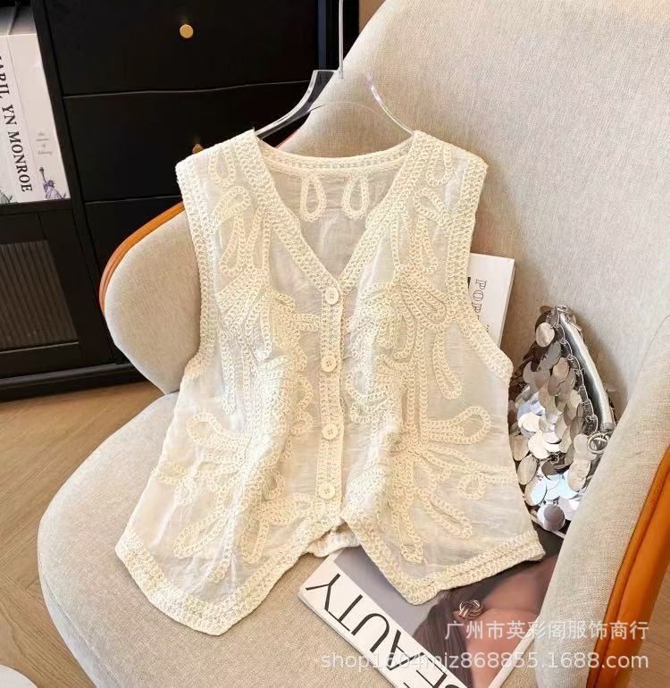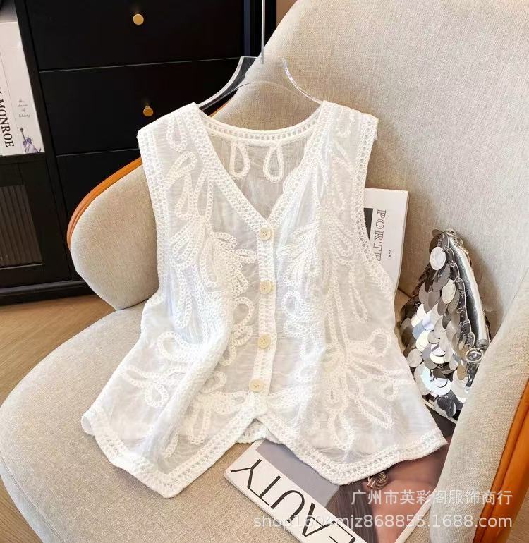 여성을위한 하이 엔드 기질 중공 크로 셰 뜨개질 v 조끼 여름 얇은 스타일 민소매 자수 조끼 카디건 탑 여성용