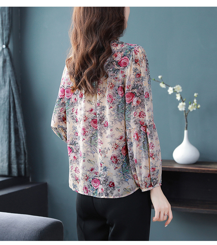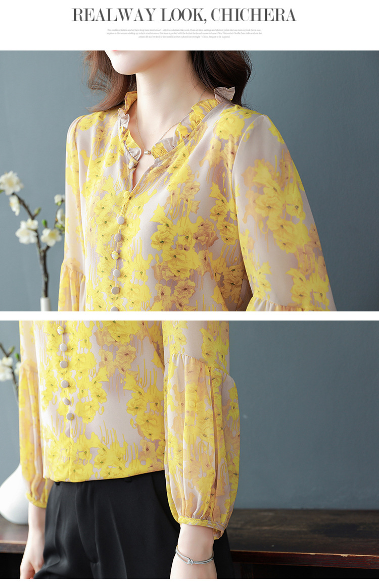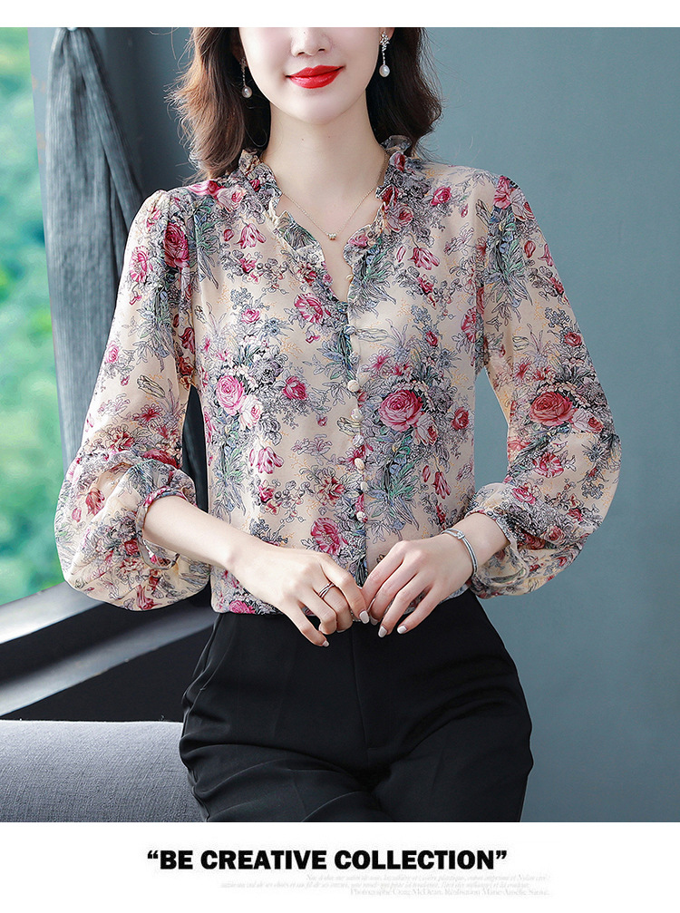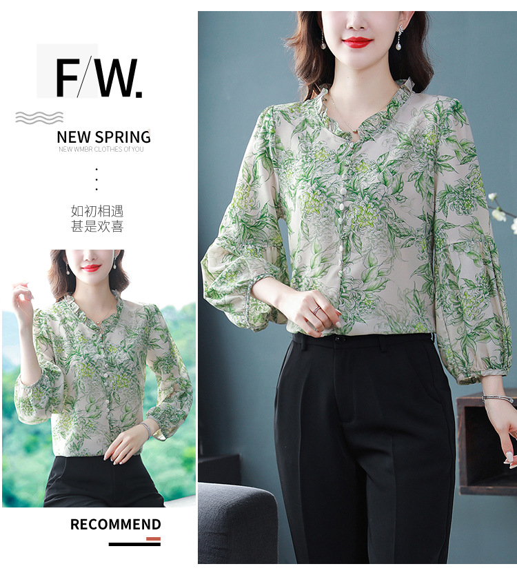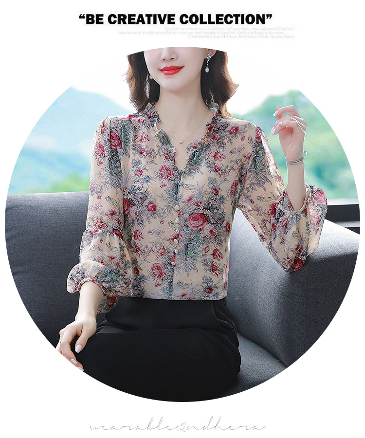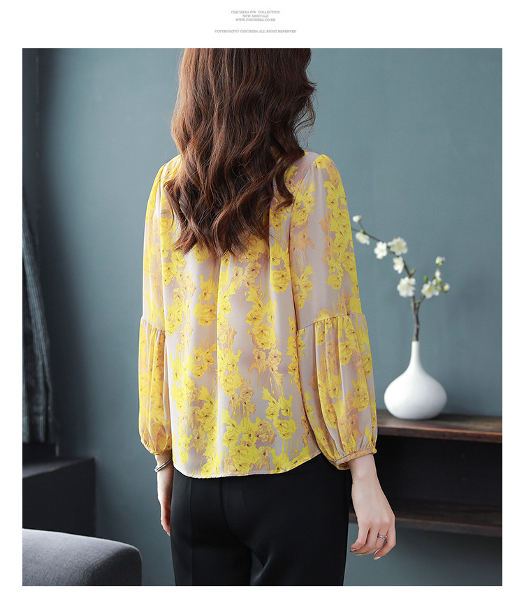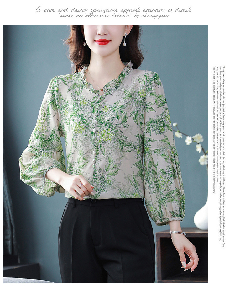 2023 봄 여름 새로운 한국 스타일 브이넥 9점 랜턴 슬리브 패셔너블한 쉬폰 셔츠 여성용 귀 프린트 풀오버 탑스토어 가기