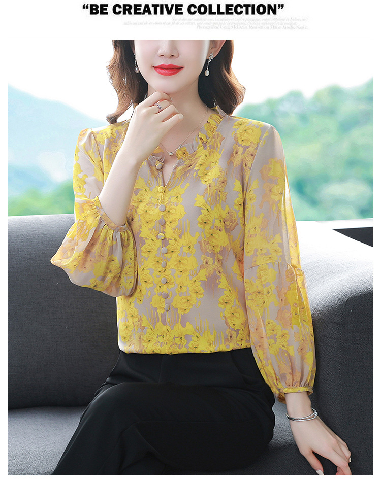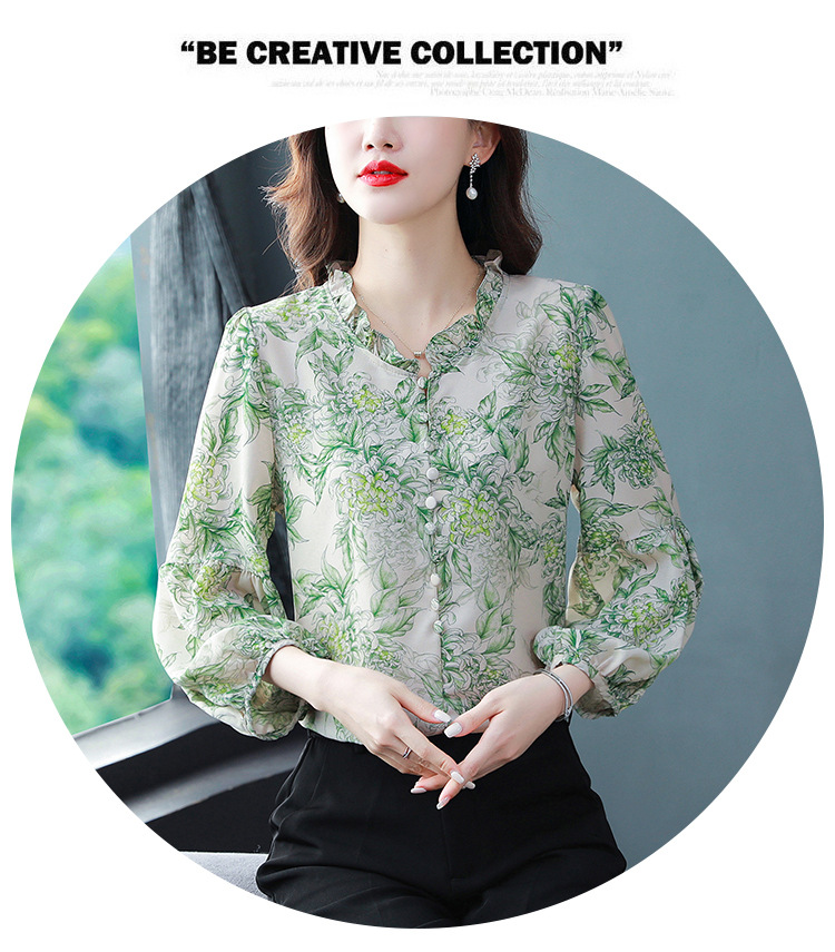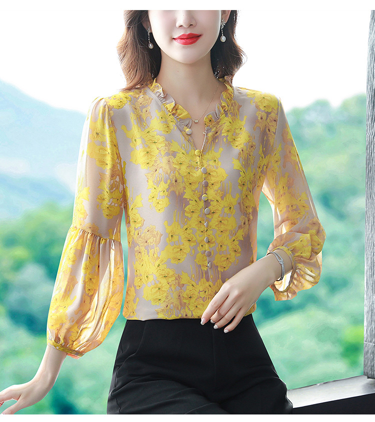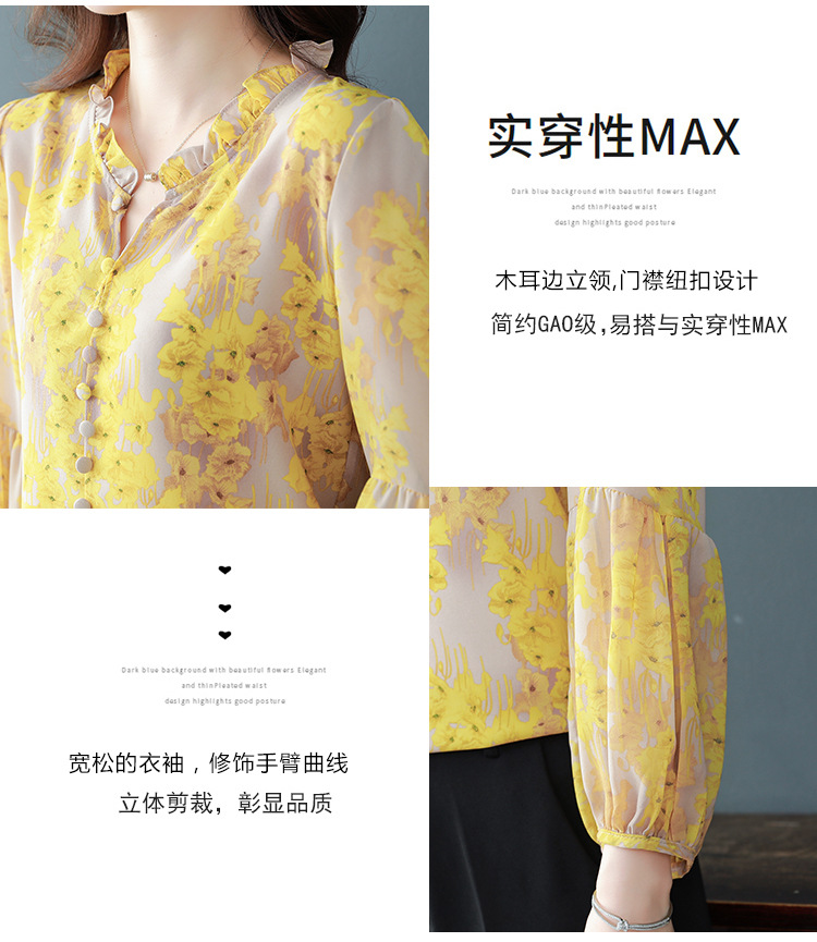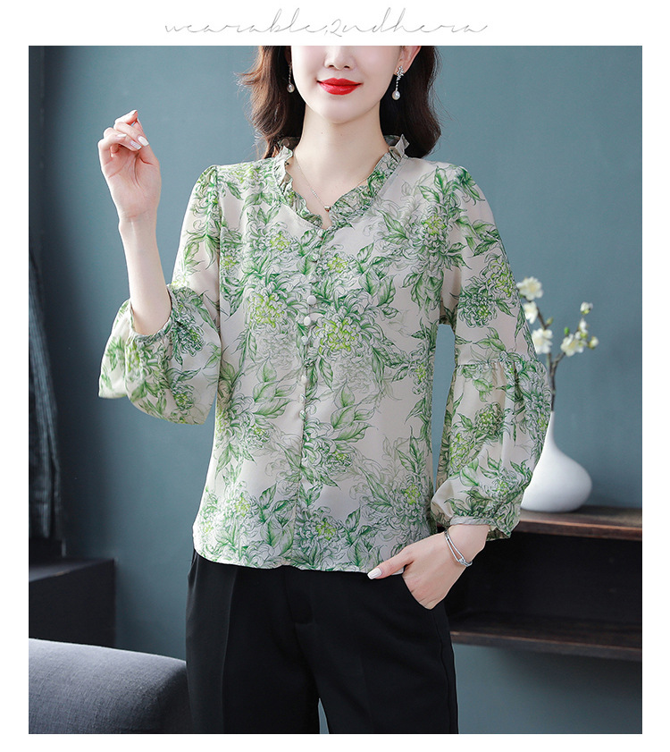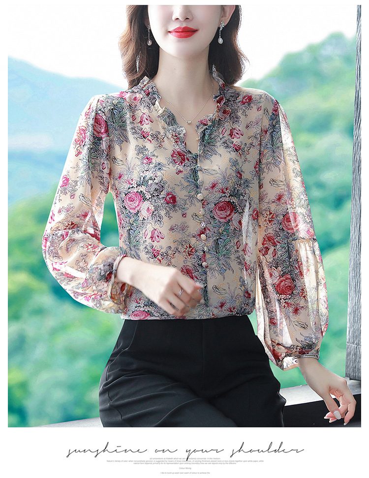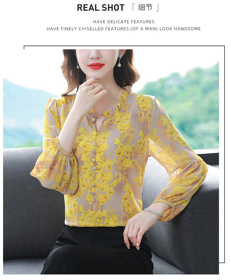 2023 봄 여름 새로운 한국 스타일 브이넥 9점 랜턴 슬리브 패셔너블한 쉬폰 셔츠 여성용 귀 프린트 풀오버 탑스토어 가기