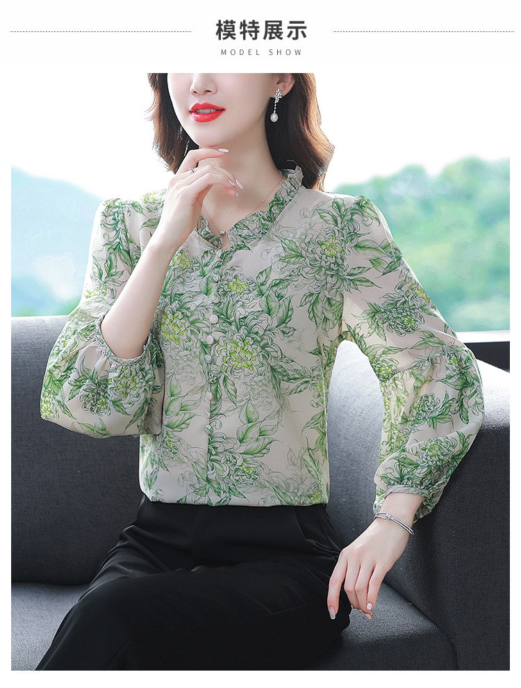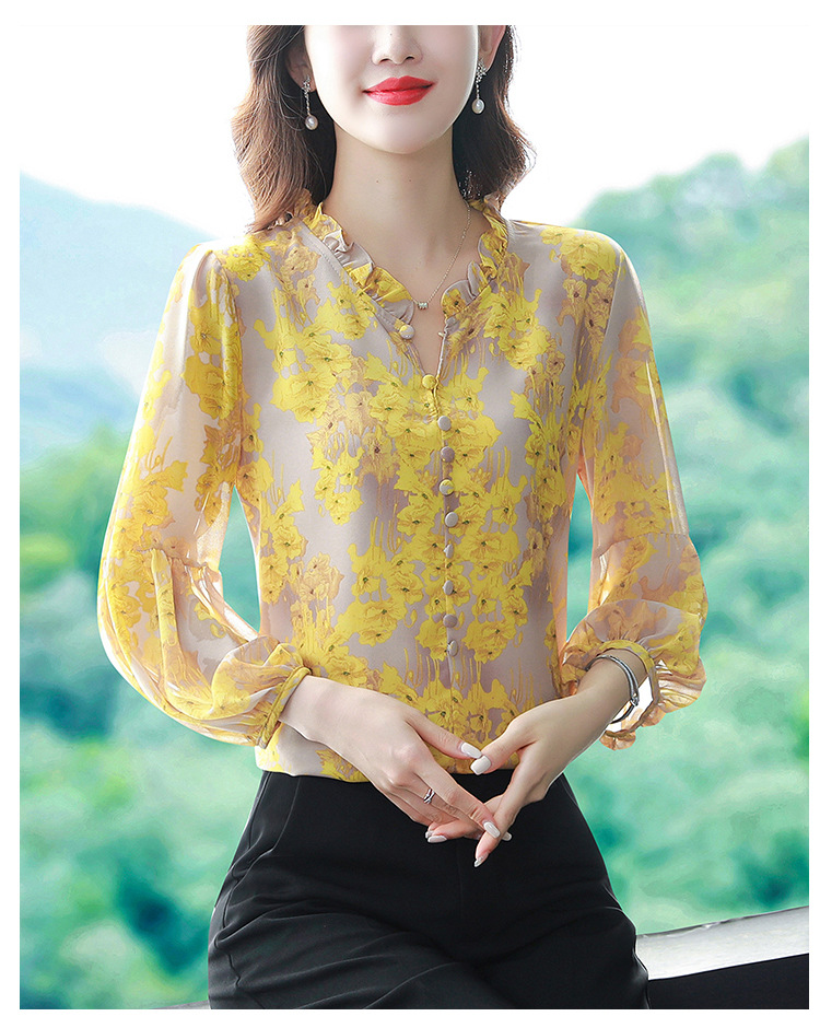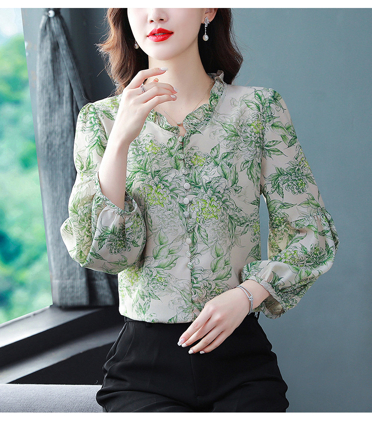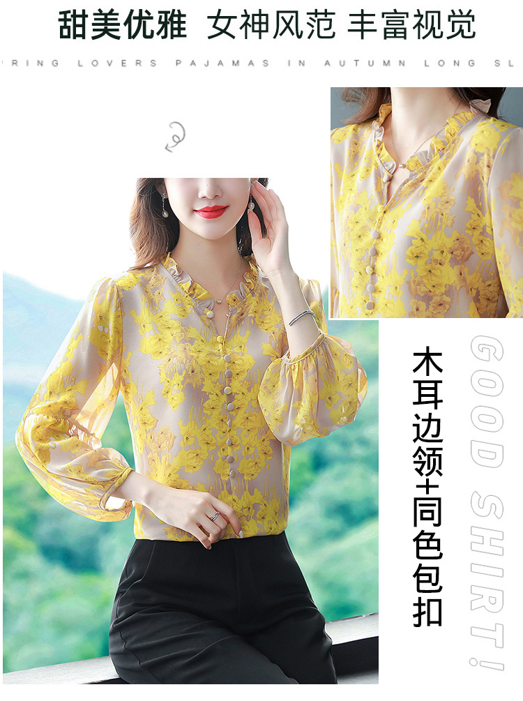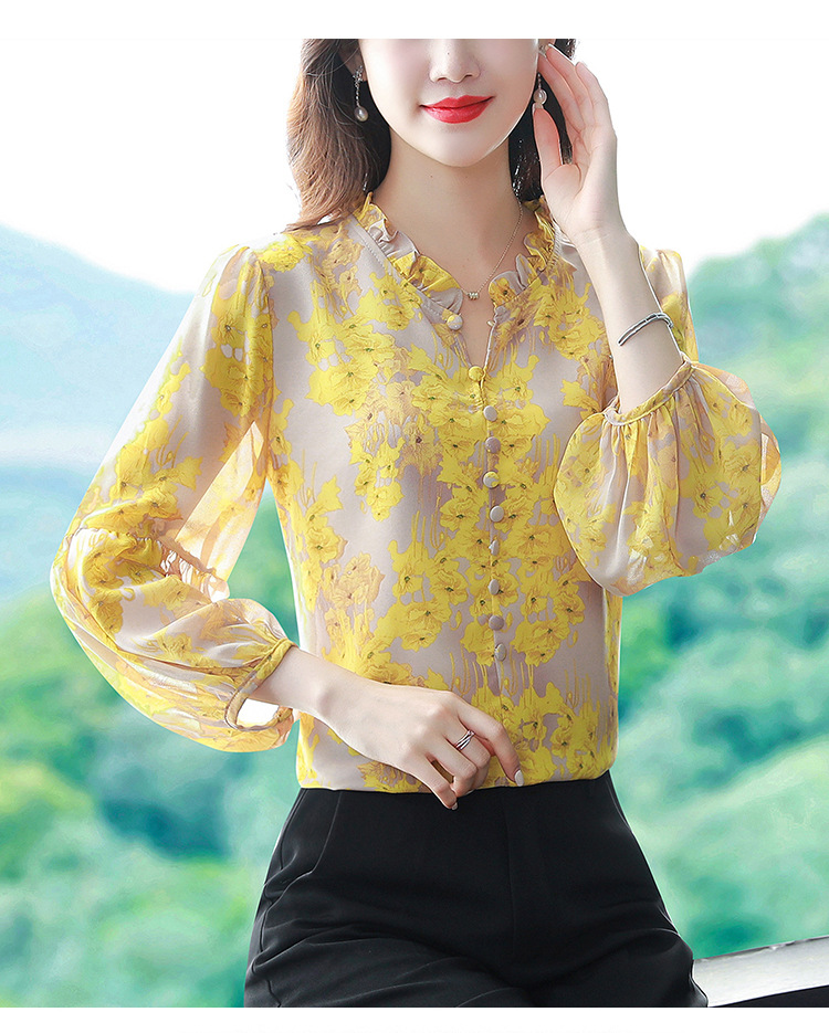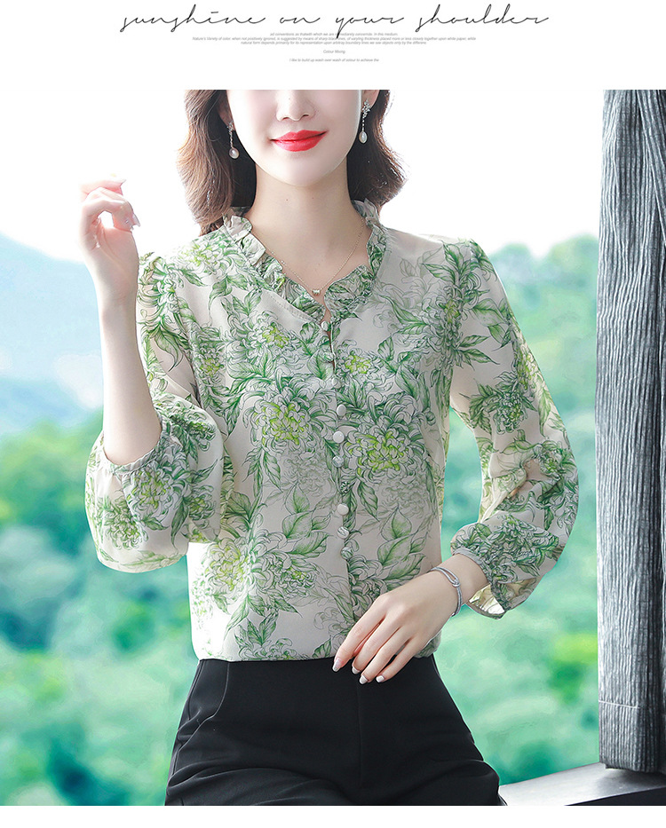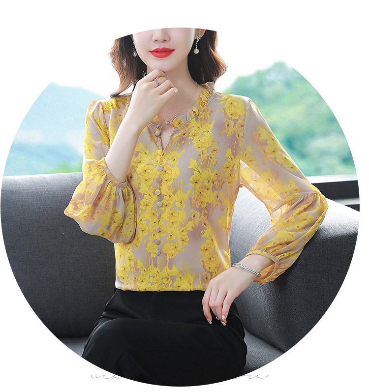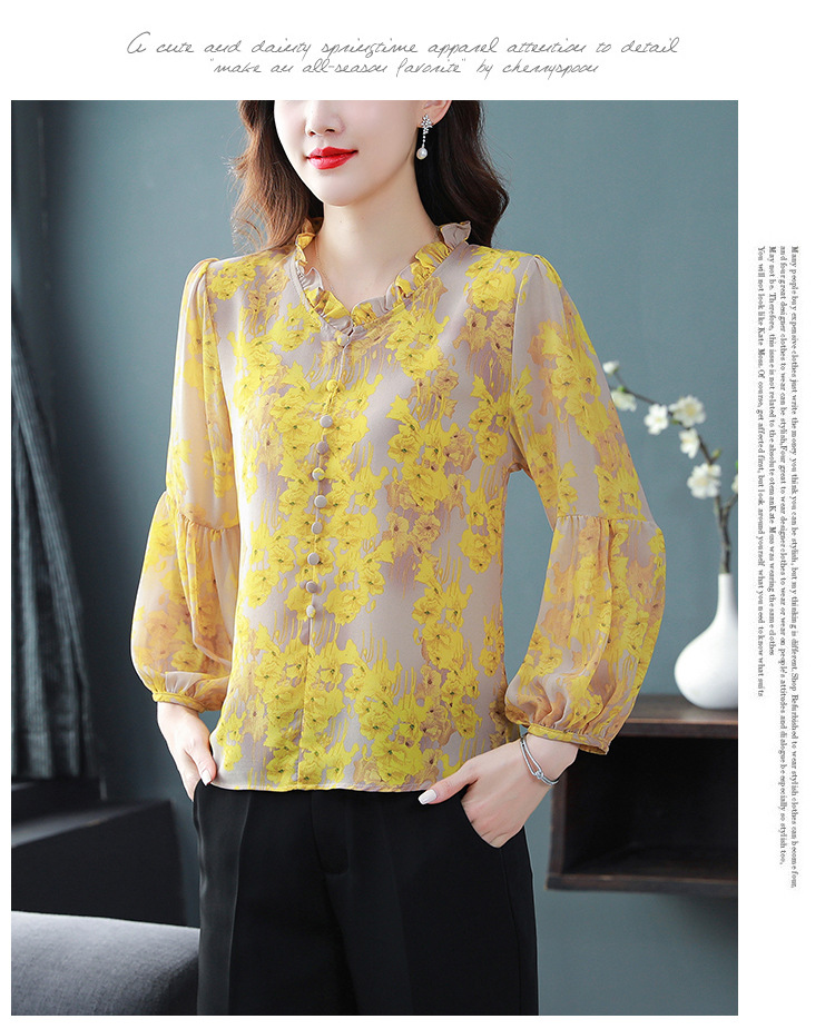 2023 봄 여름 새로운 한국 스타일 브이넥 9점 랜턴 슬리브 패셔너블한 쉬폰 셔츠 여성용 귀 프린트 풀오버 탑스토어 가기
