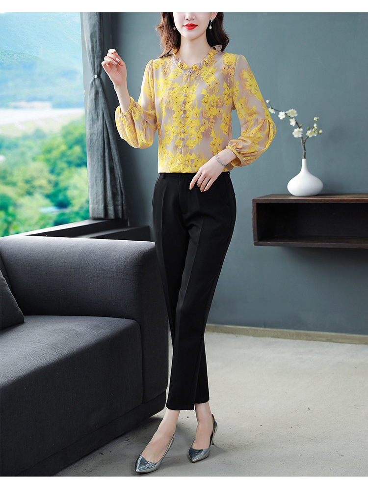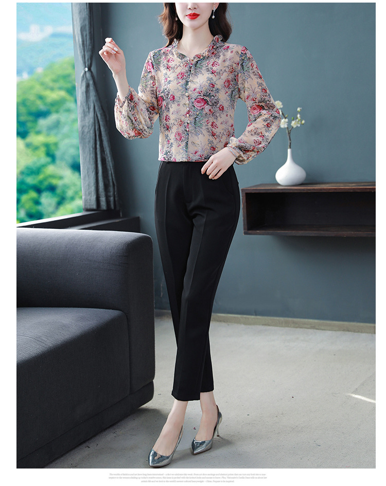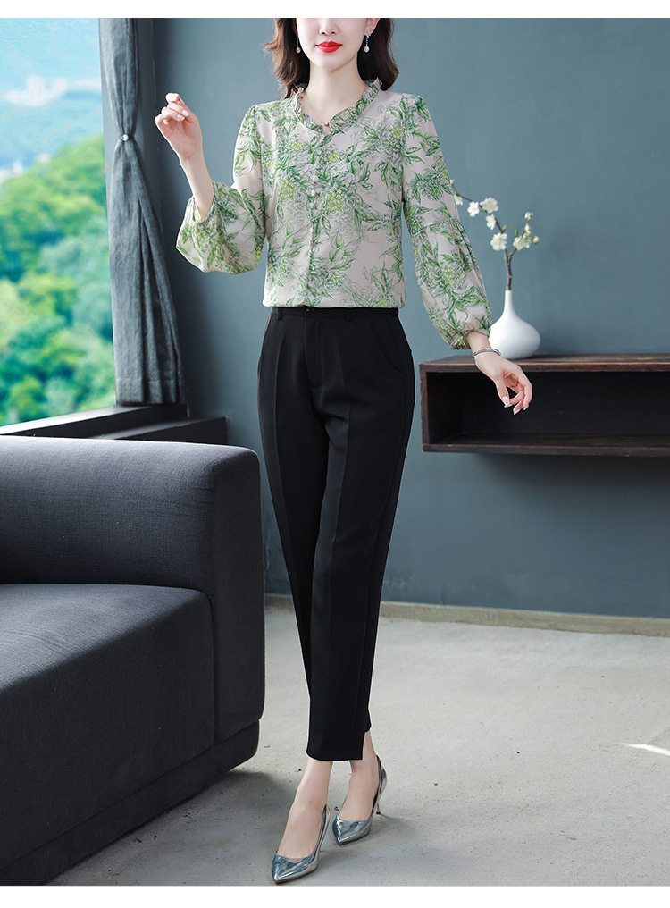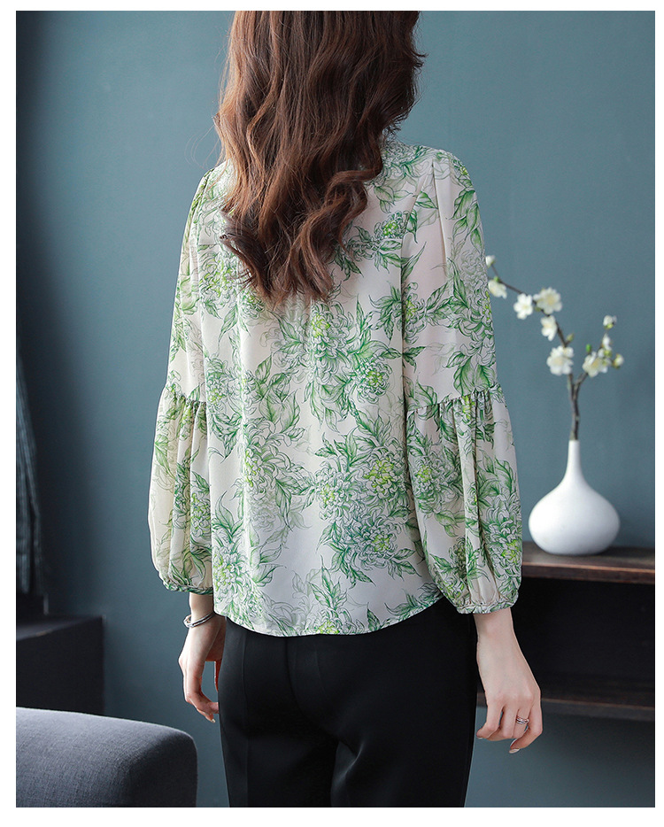 2023 봄 여름 새로운 한국 스타일 브이넥 9점 랜턴 슬리브 패셔너블한 쉬폰 셔츠 여성용 귀 프린트 풀오버 탑