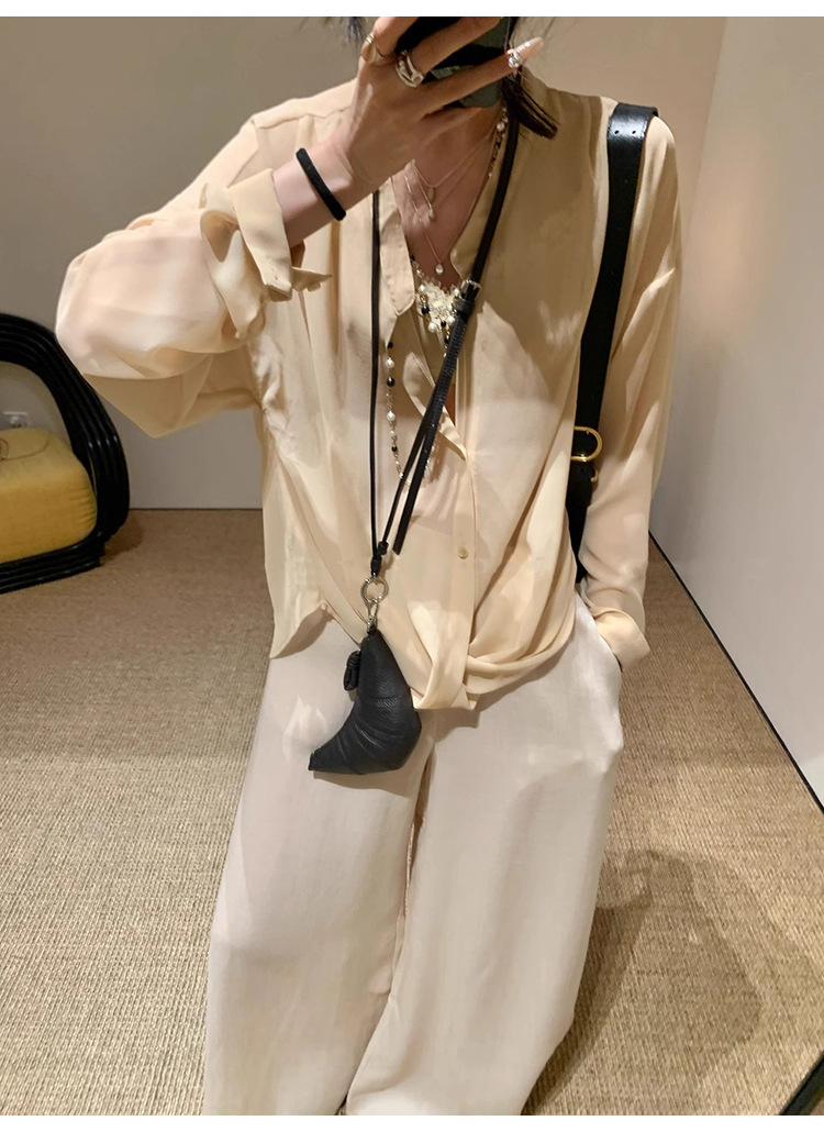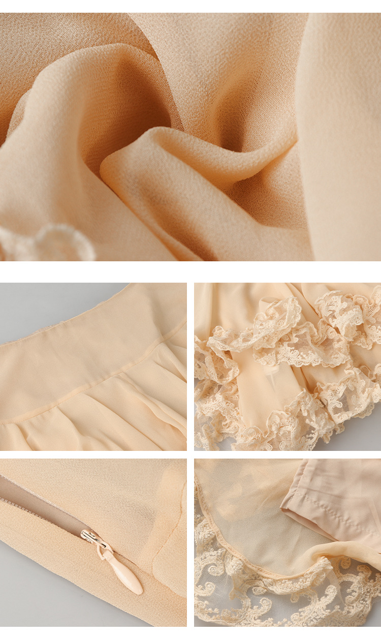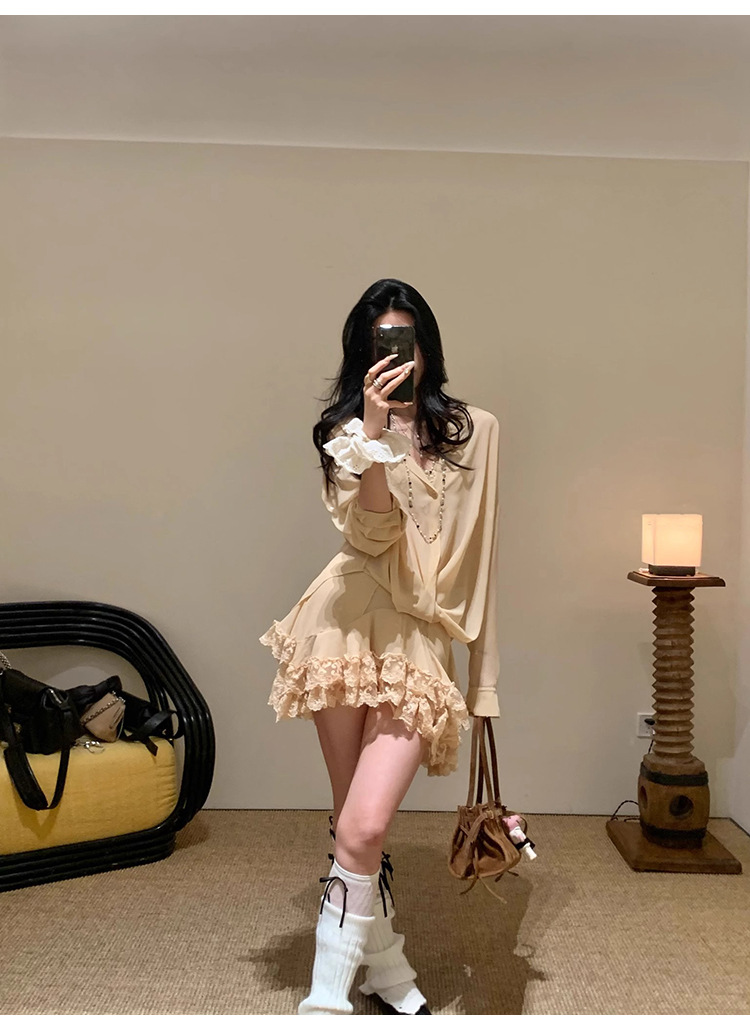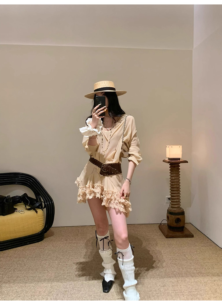 즉시 배송【카라멜 브륄】 러브리스토리 여주인공 레트로 브이넥 셔츠 분위기 있는 레이스 스커트 3종 세트