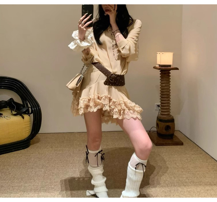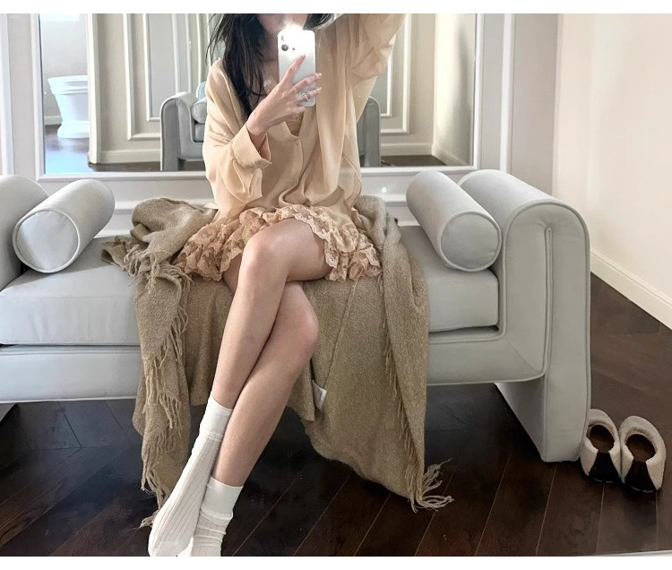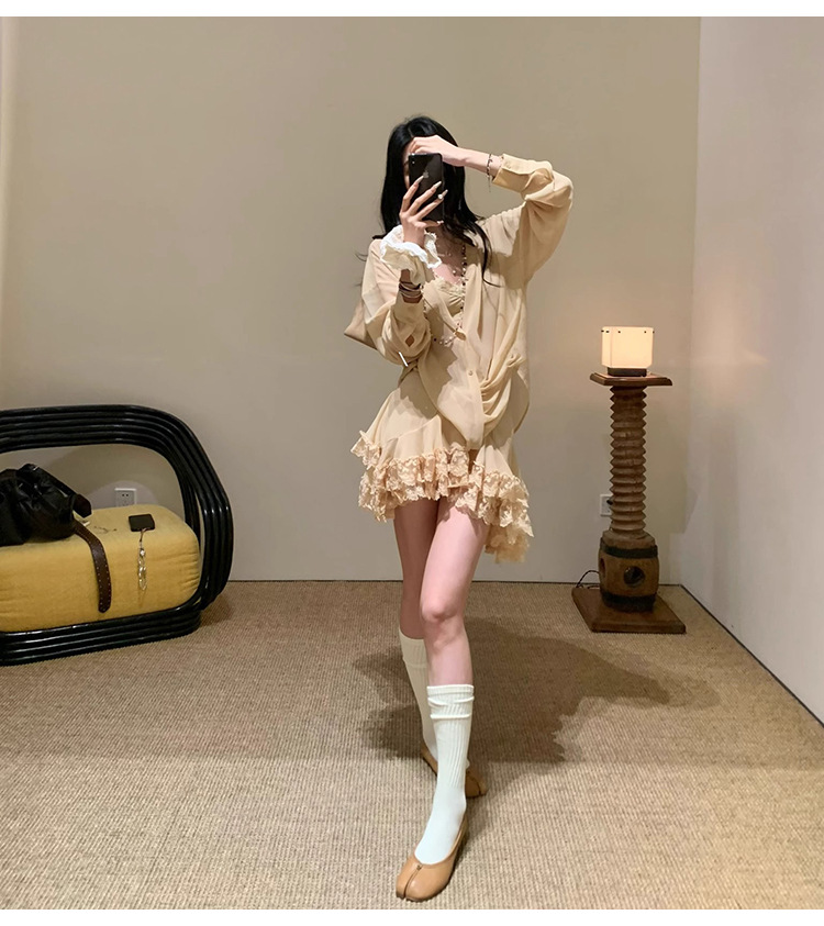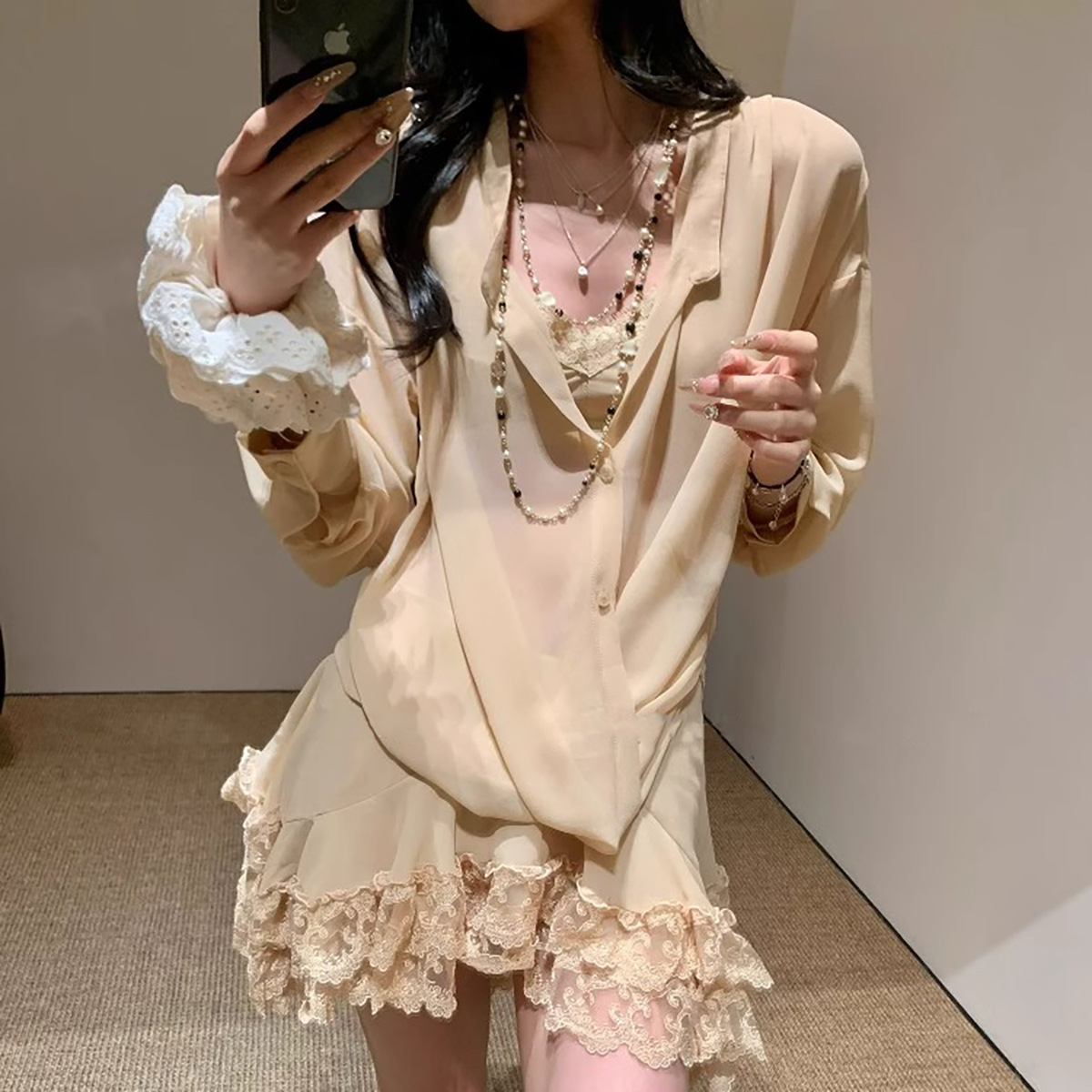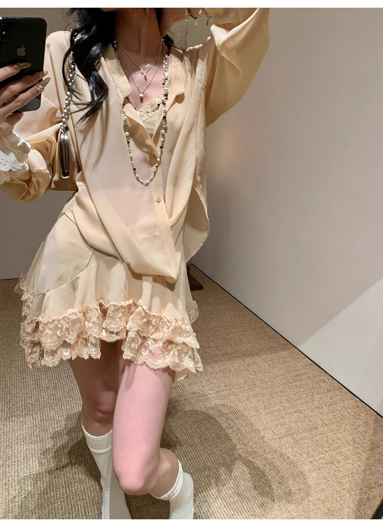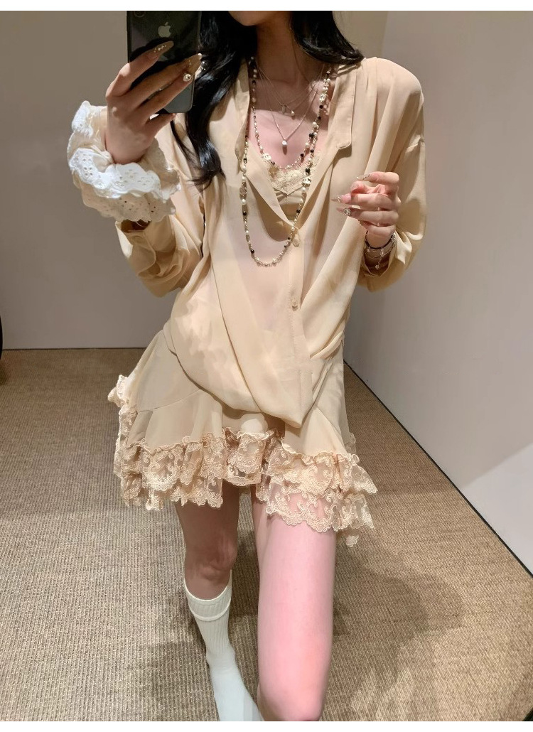 즉시 배송【카라멜 브륄】 러브리스토리 여주인공 레트로 브이넥 셔츠 분위기 있는 레이스 스커트 3종 세트스토어 가기