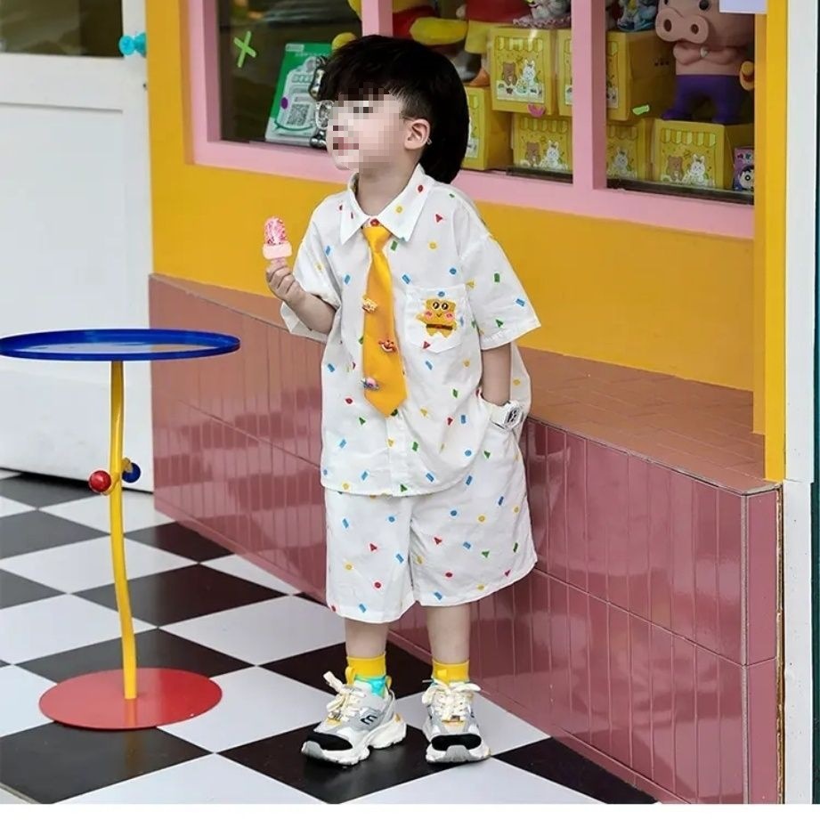 • 기하학 반팔 셔츠 + 바지 투피스 세트, 프리 타이