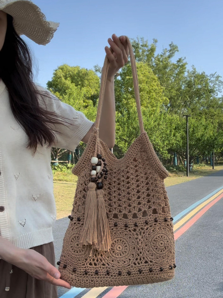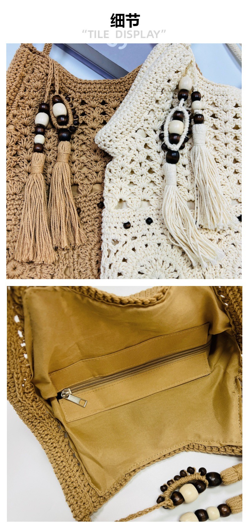세련된 나무 구슬 태슬 숄더 코튼 브레이드 백 새로운 스타일 중공 대용량 브레이드 백 홀리데이 스타일 비치 백