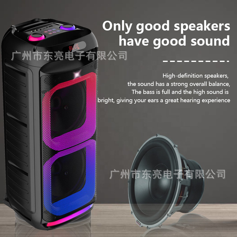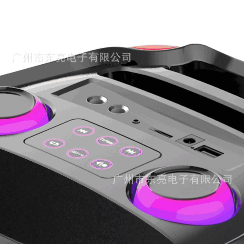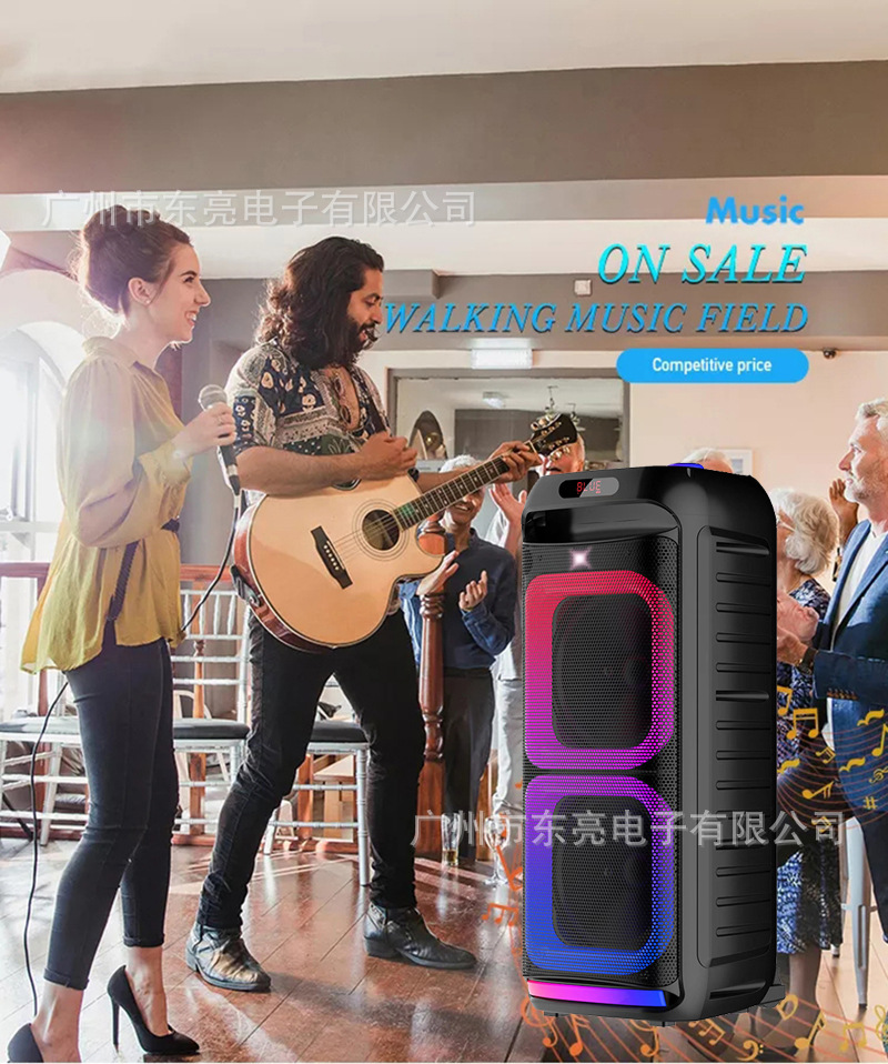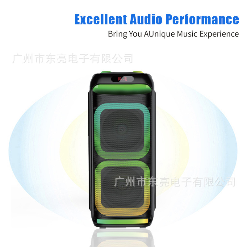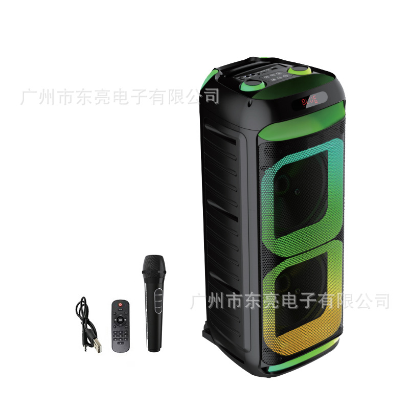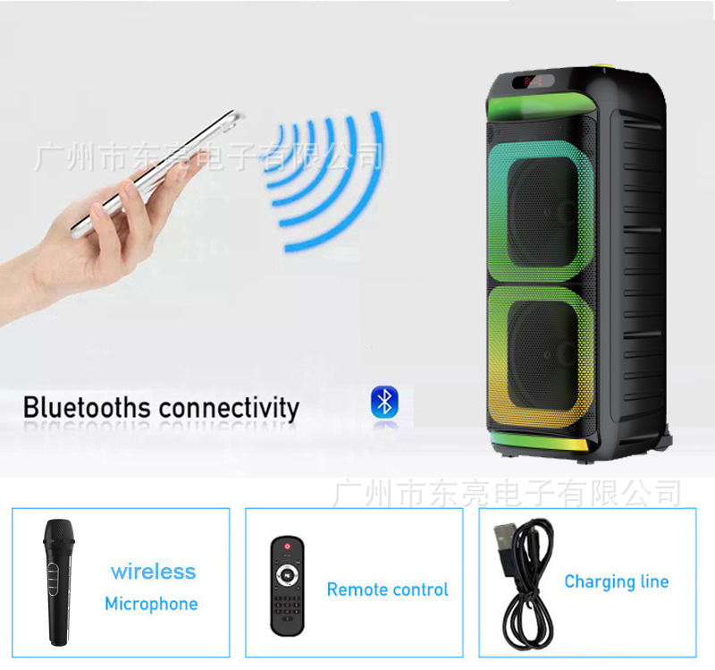 Supports USB/TF/FM/AUX/Bluetooth/TWS, true stereo, rechargeable wireless microphone with microphone function. Equipped with remote control function. Light knob for volume control, with display screen and flame light