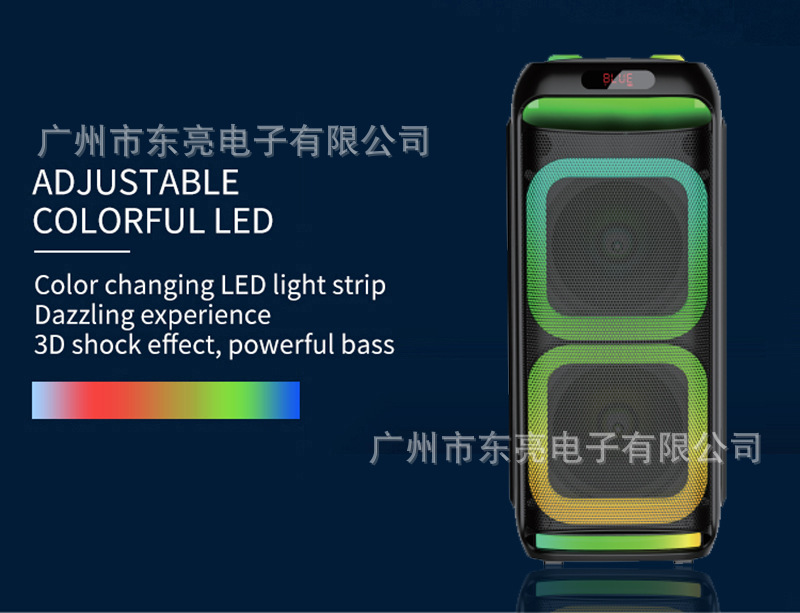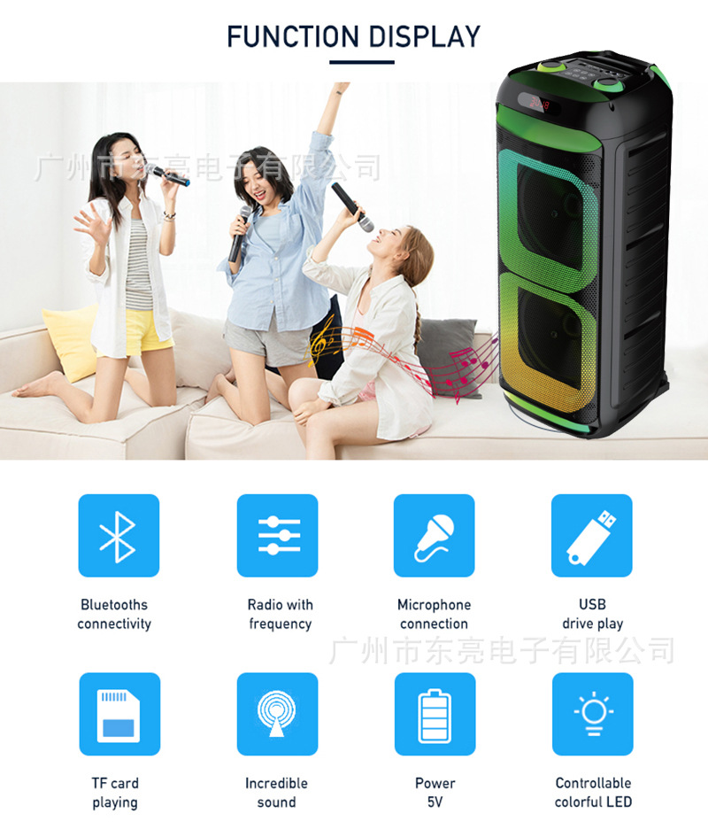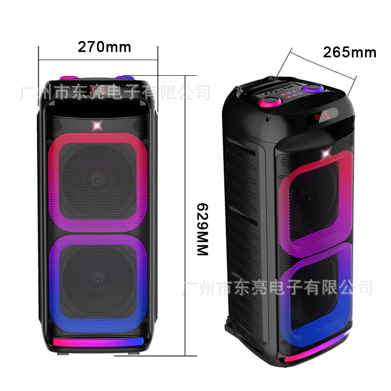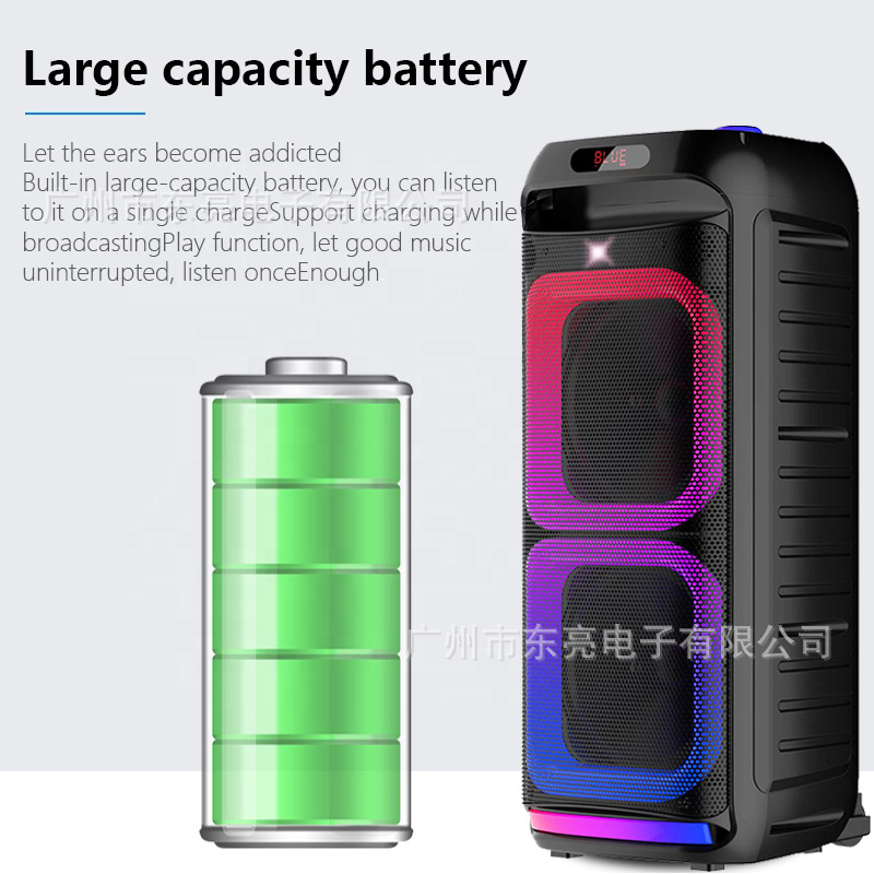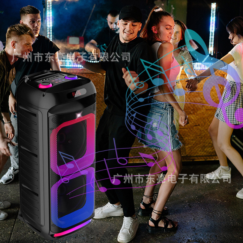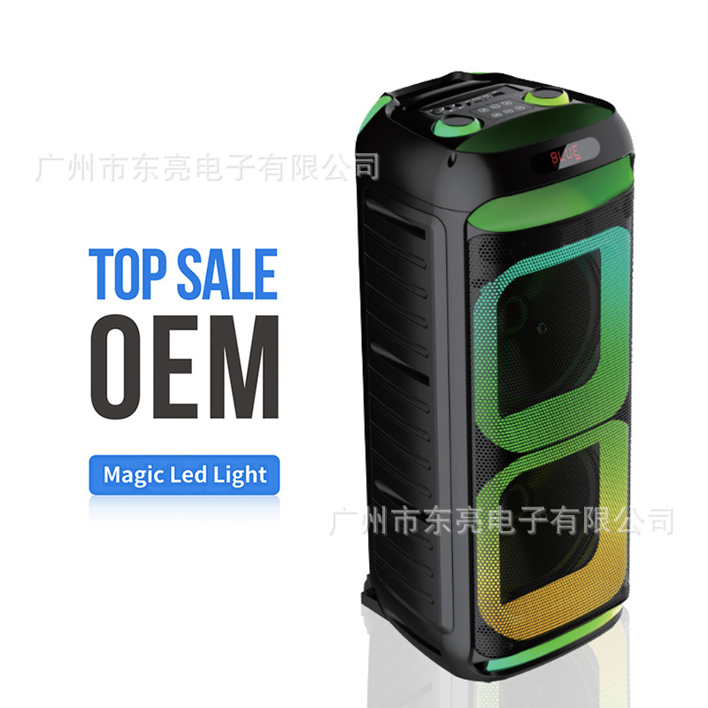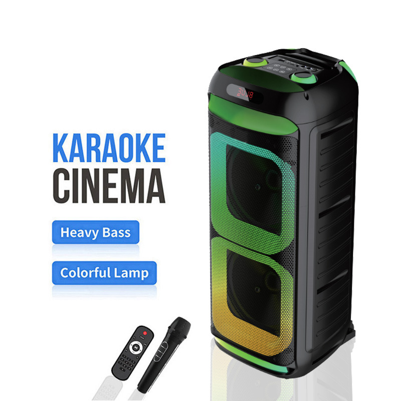 Supports USB/TF/FM/AUX/Bluetooth/TWS, true stereo, rechargeable wireless microphone with microphone function. Equipped with remote control function. Light knob for volume control, with display screen and flame light