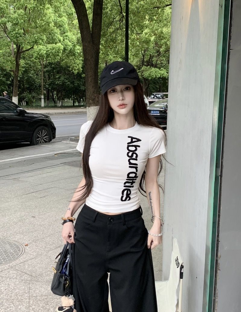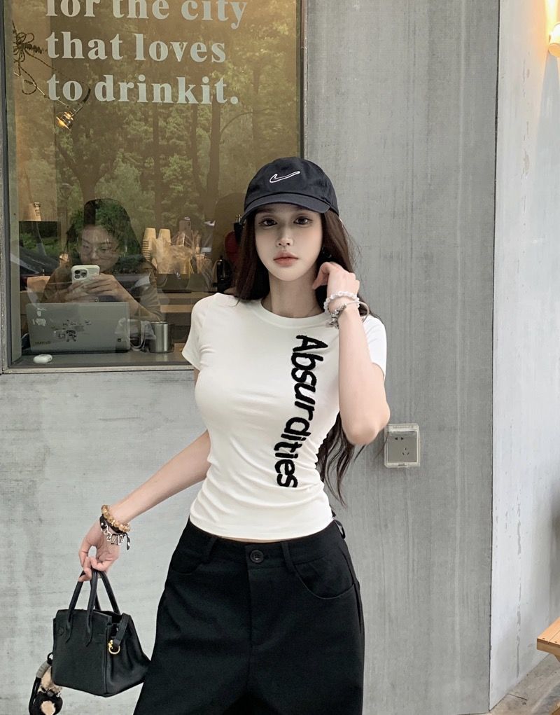 레터 타월 자수 반팔 티셔츠 여성 여름 아메리칸 디자인 틈새 슬림 자수 라운드 넥 타이트 탑스토어 가기