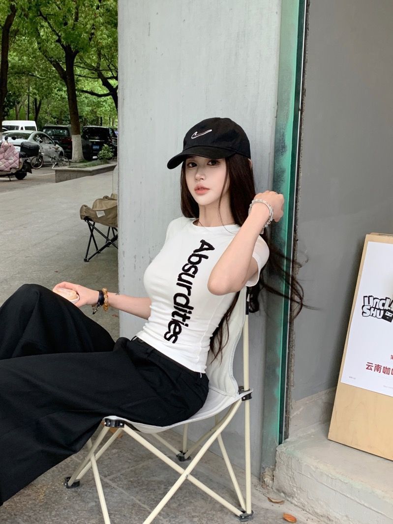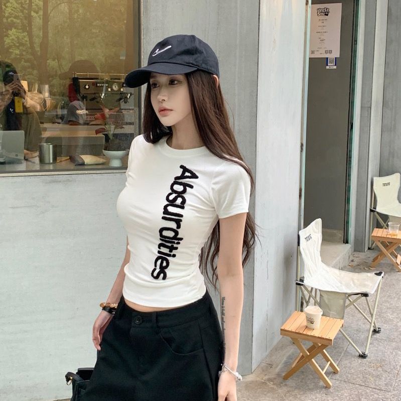 레터 타월 자수 반팔 티셔츠 여성 여름 아메리칸 디자인 틈새 슬림 자수 라운드 넥 타이트 탑