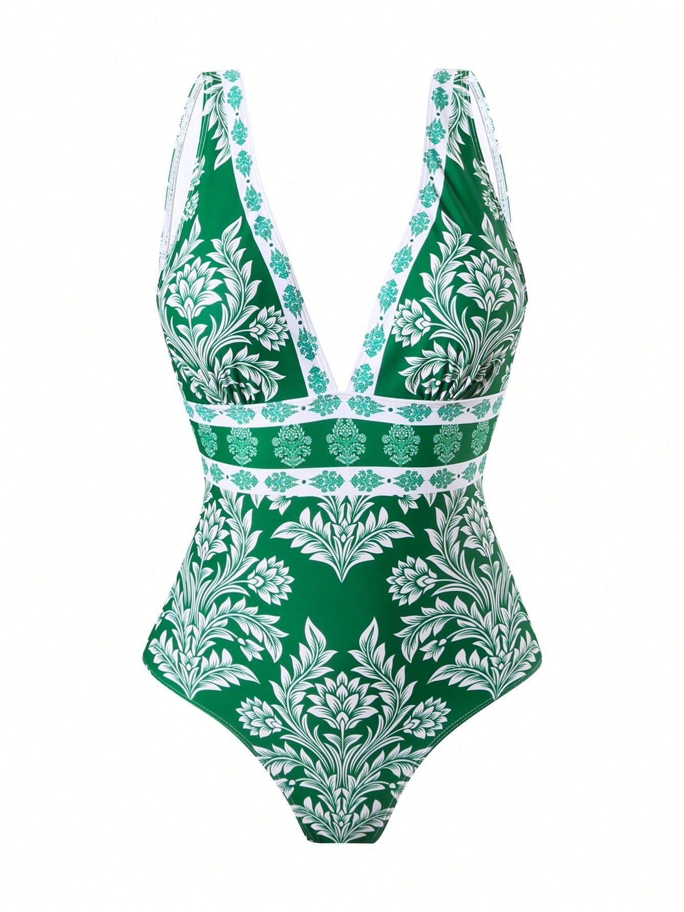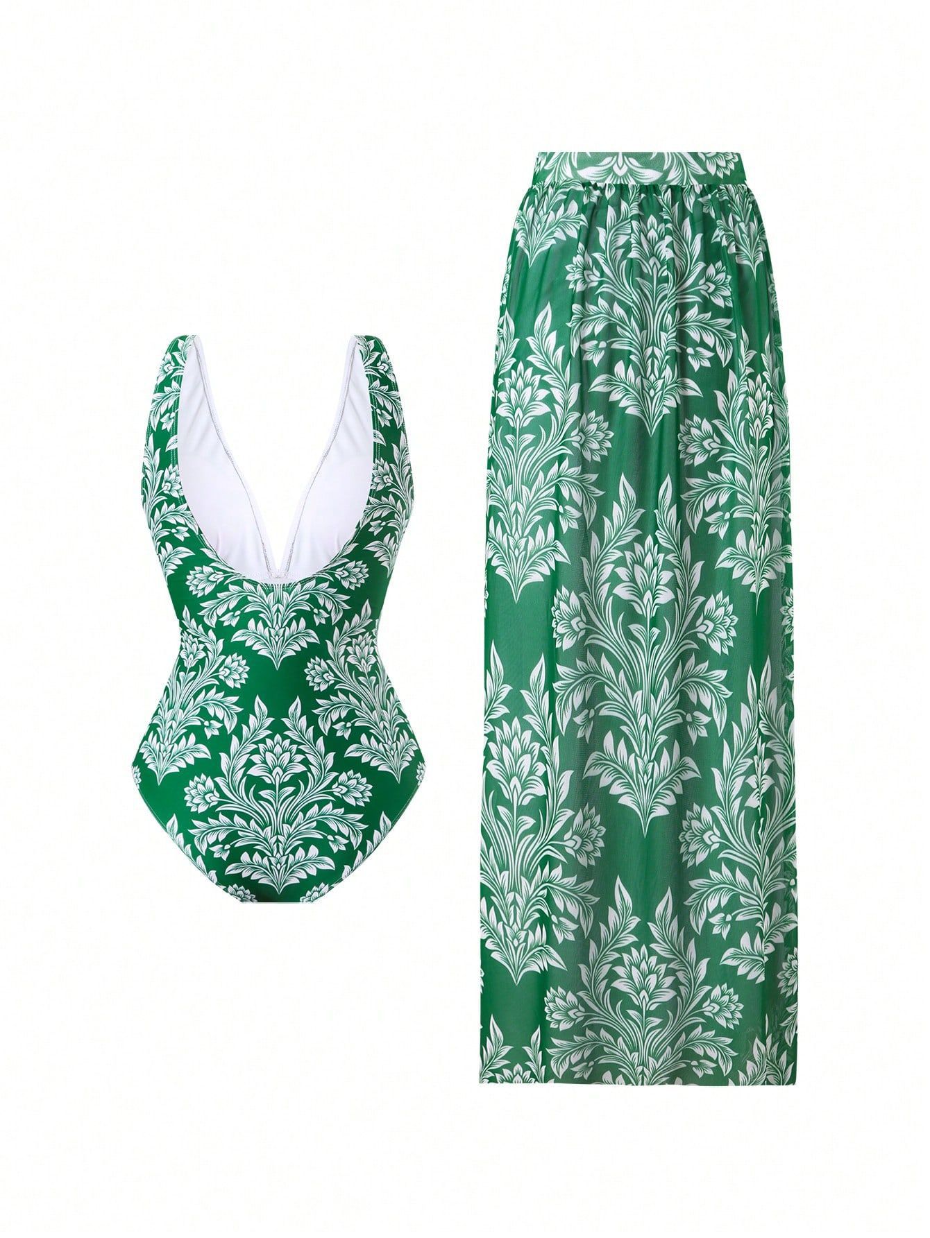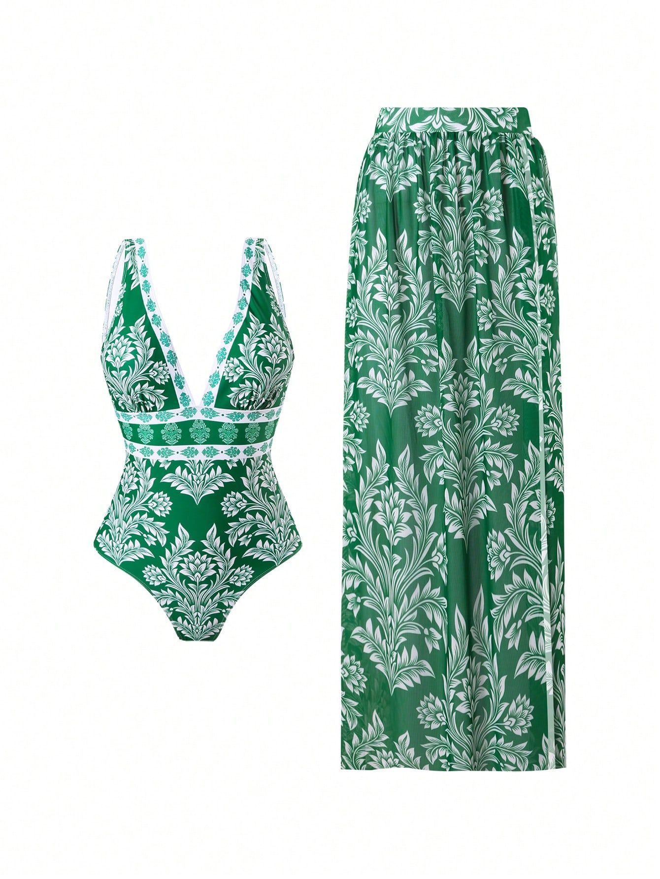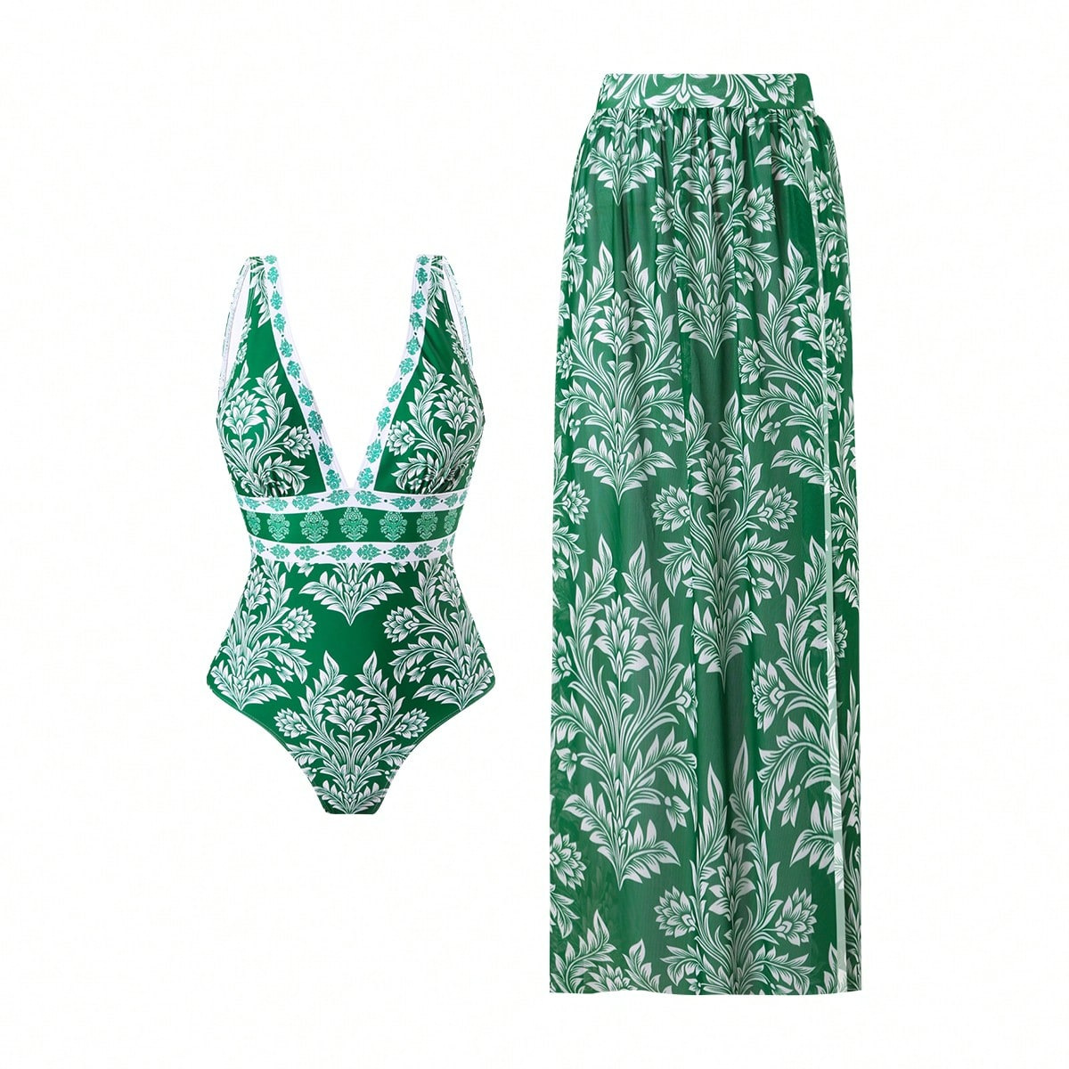 유럽과 미국의 섹시한 비키니 원피스 수영복 쉬폰 스커트 더블 숄더 브이넥 수영복 비치 보수적인 배 커버 수영복 세트