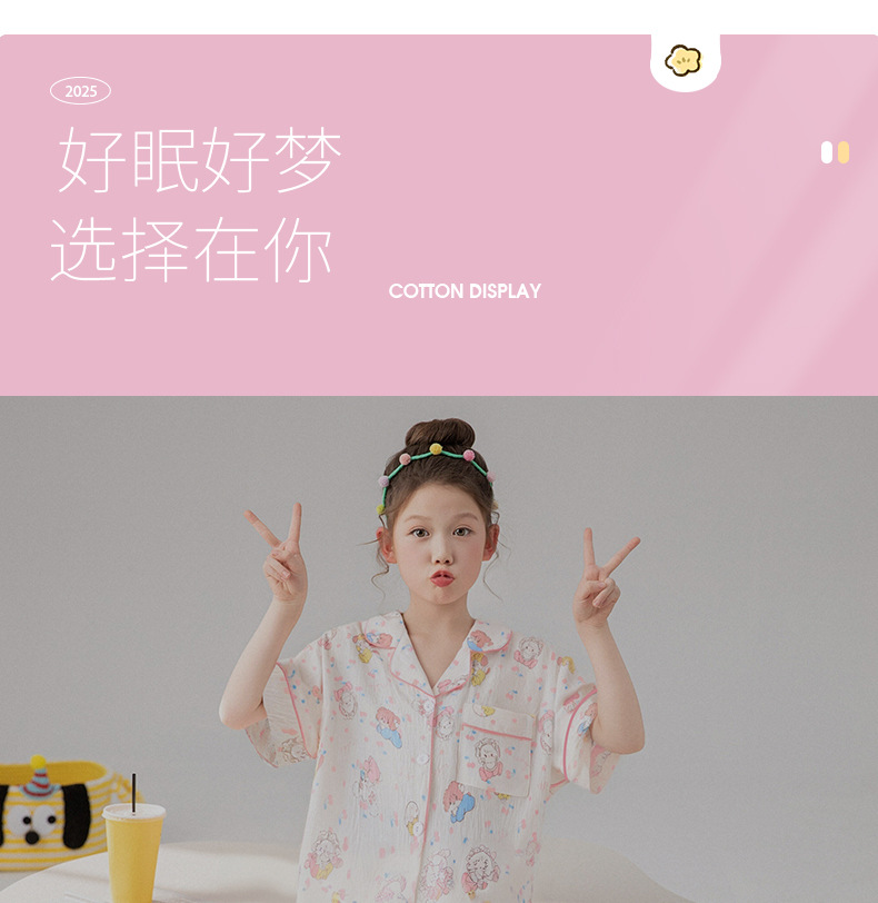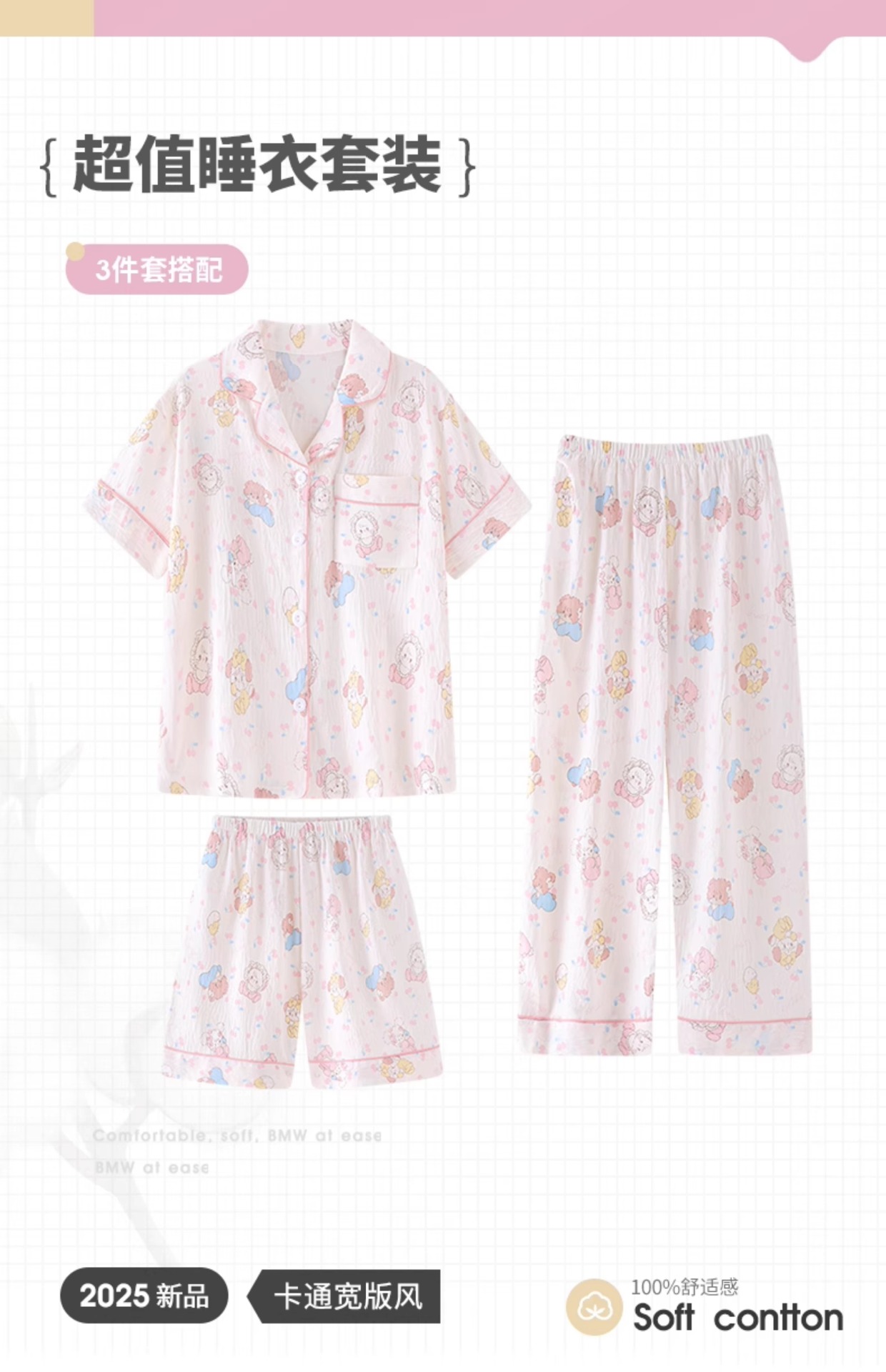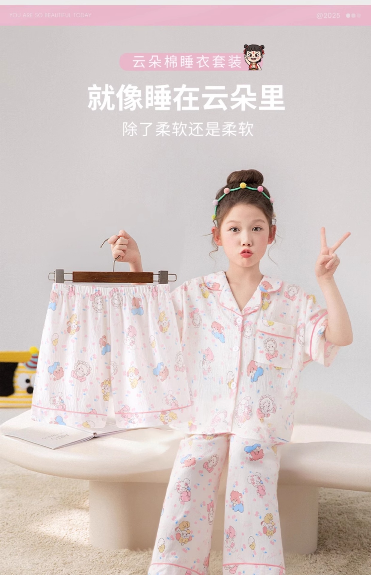 儿童睡衣夏季云朵棉薄款短袖女童三件套夏款2025新款小女孩家居服