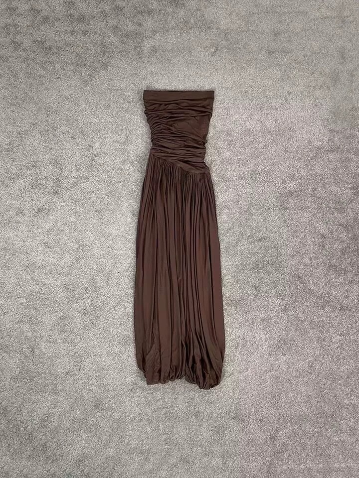 "모달 회전 곡선" 25 봄 여름 틈새 디자이너 심플 플리츠 튜브탑 여성용 롱 드레스