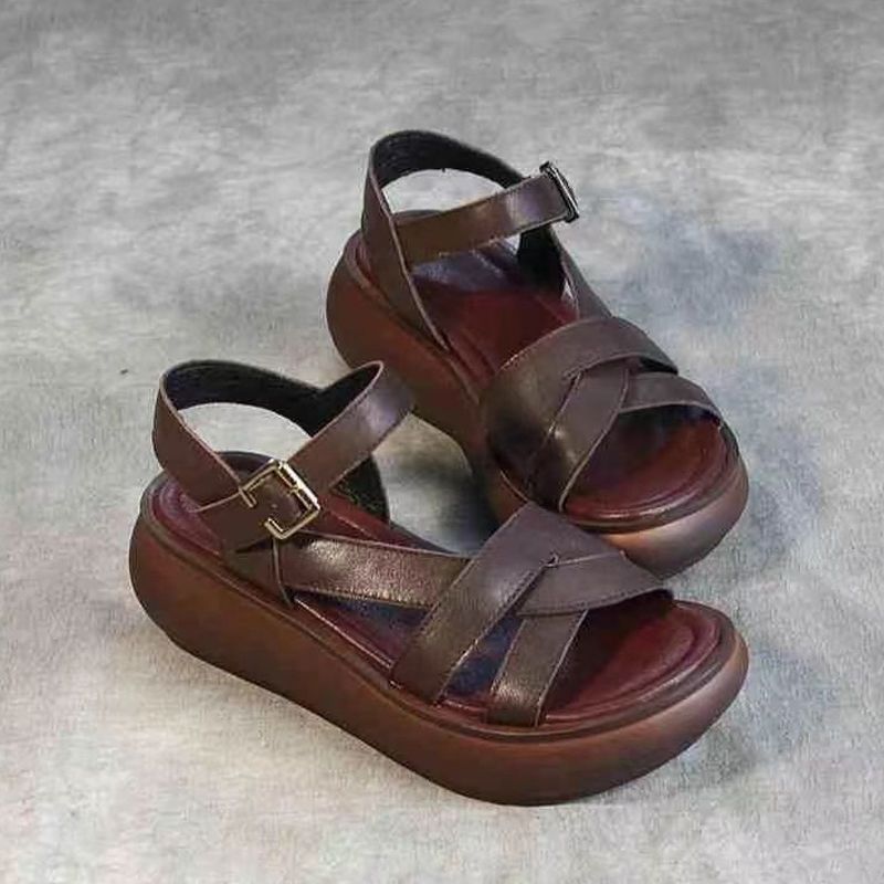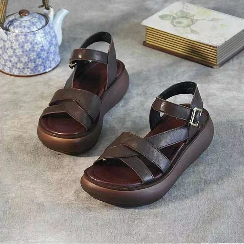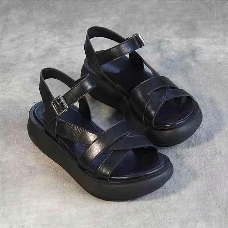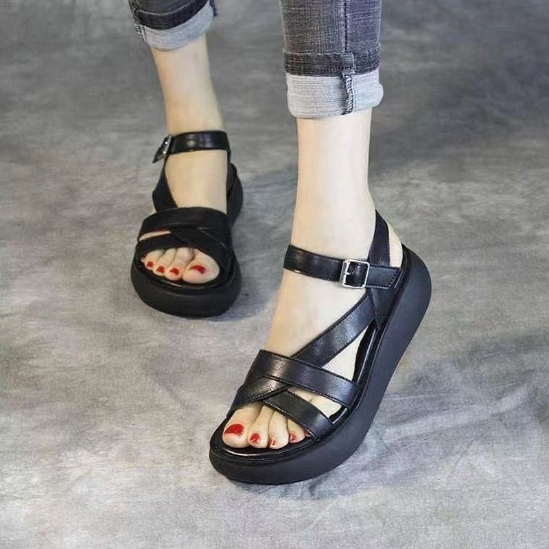 2024 여름 여성 샌들 두꺼운 밑창 플랫폼 신발 얇은 스트랩 오픈 발가락 웨지 캐주얼 복고풍 수제 로마 샌들