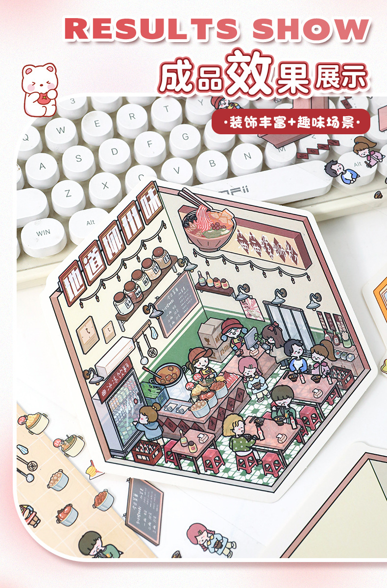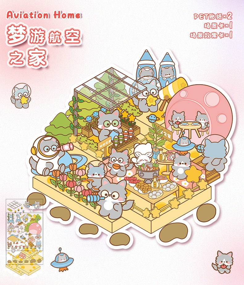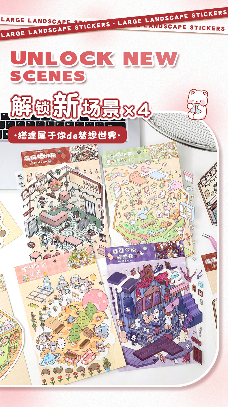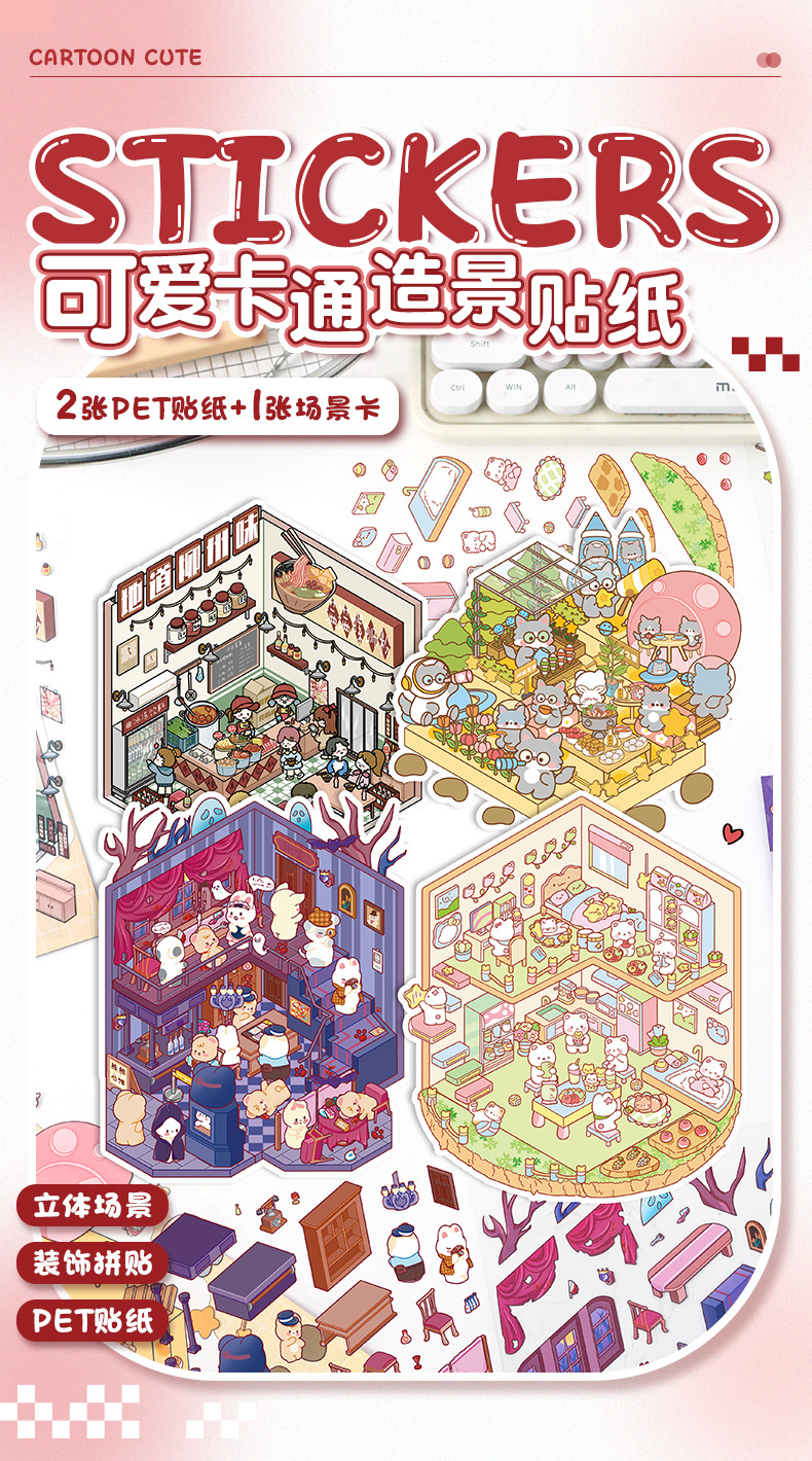 만화 소형 풍경 스티커 귀여운 3D 입체 오두막 핸드북 스티커 미니어처 장면 콜라주 DIY 스티커스토어 가기