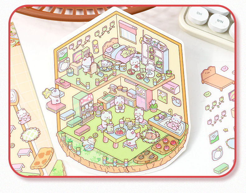 만화 소형 풍경 스티커 귀여운 3D 입체 오두막 핸드북 스티커 미니어처 장면 콜라주 DIY 스티커