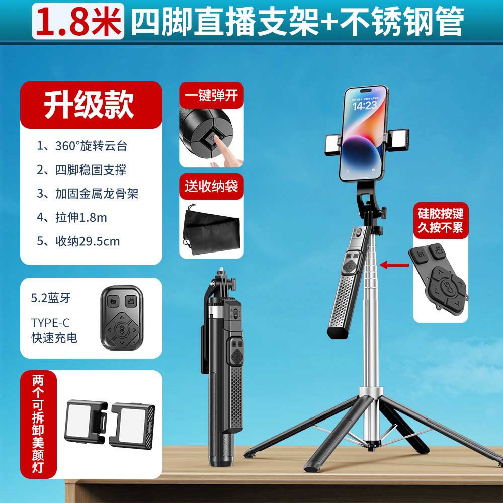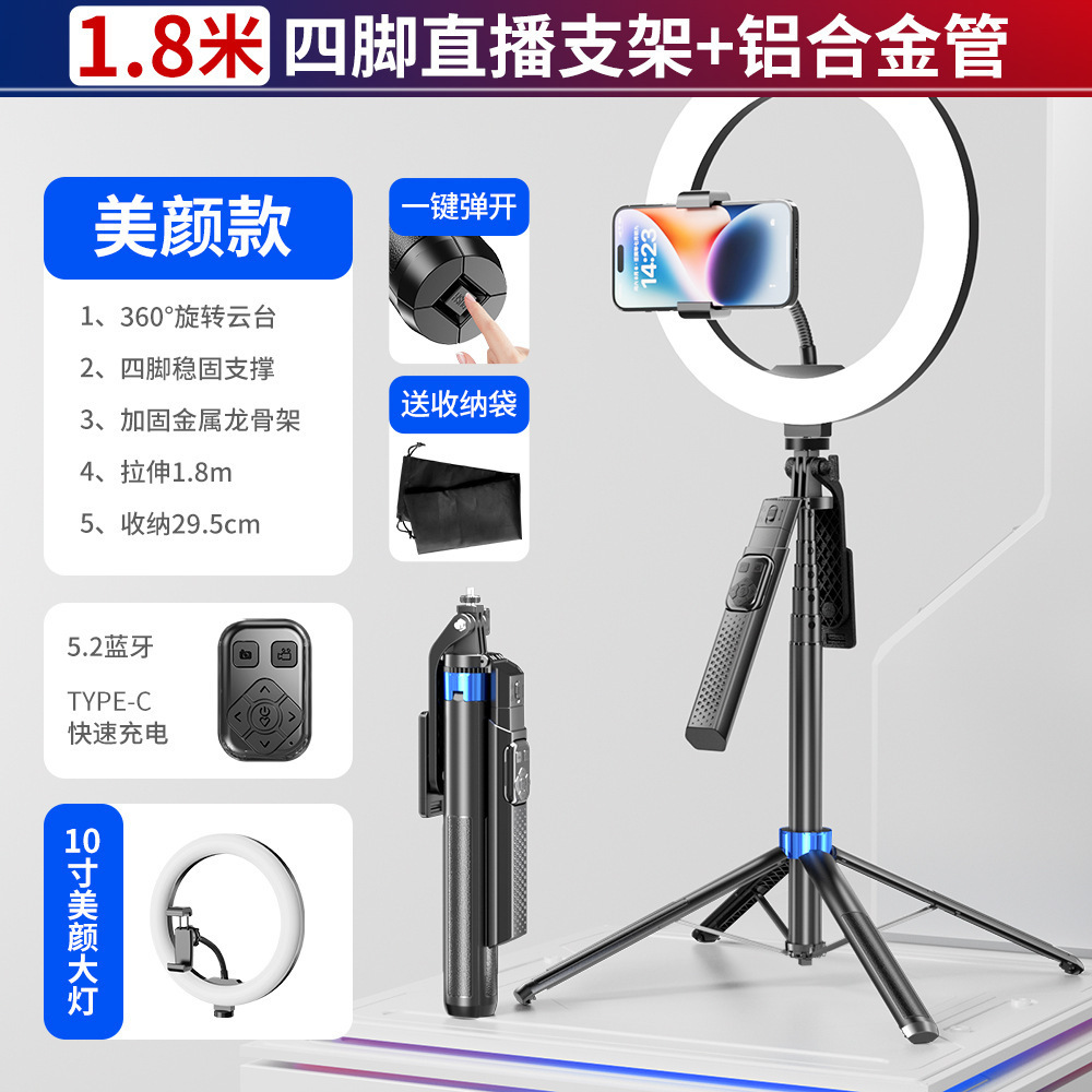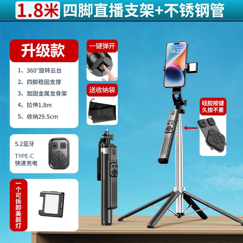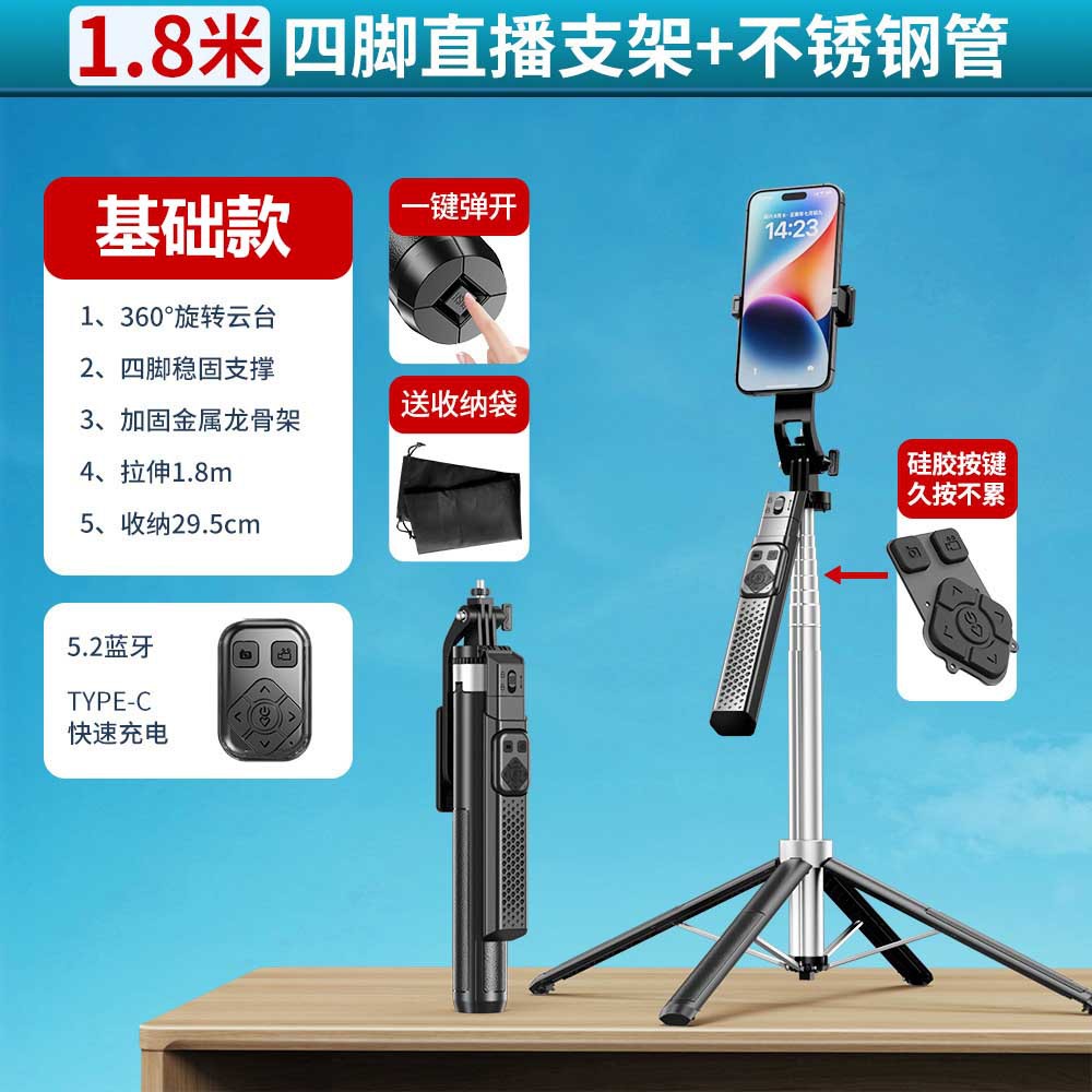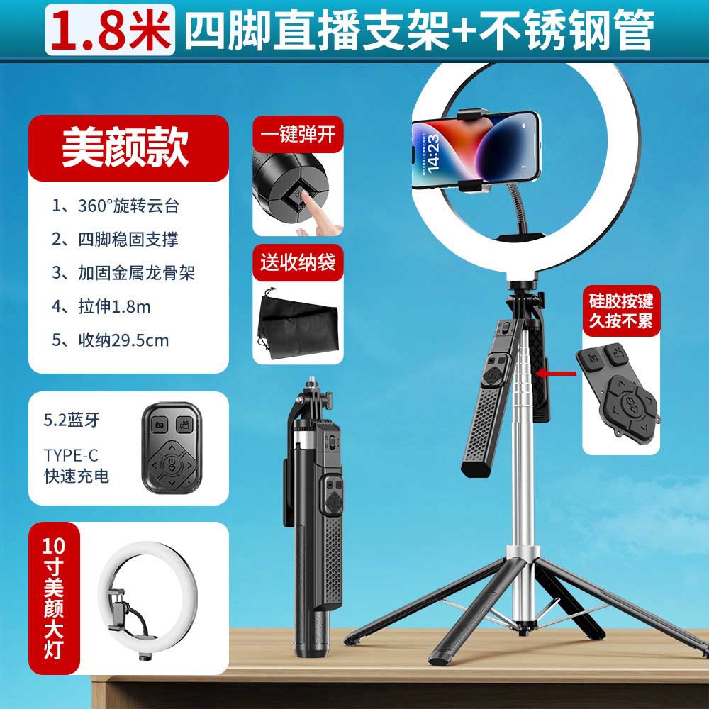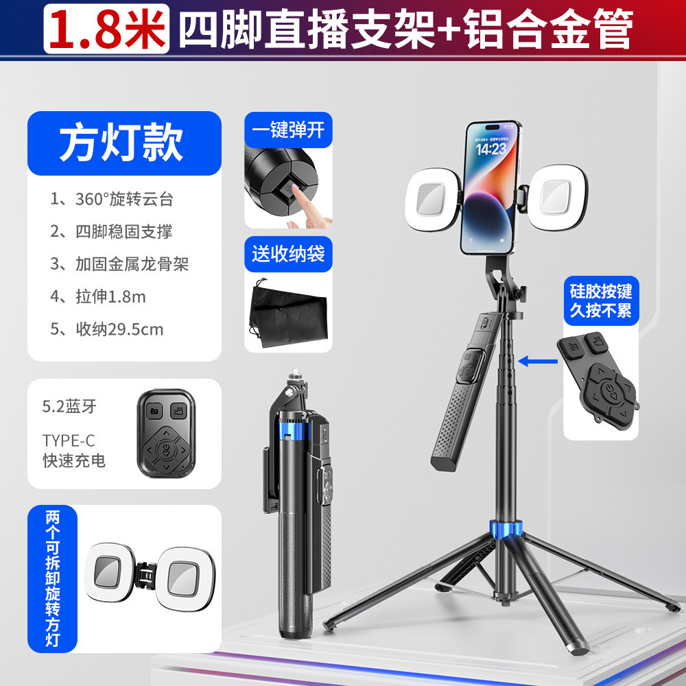 • P520TK-V1【1.8m + 스테인레스 스틸 튜브 + 원클릭 팝업 삼각대 + 충전 Douyin 리모컨 + 보관 가방 + 작은 사각형 조명 1개】